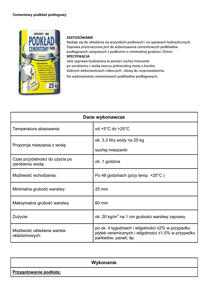 Cementowy podkład podłogowy ZASTOSOWANIE Nadaje się do układania na wszystkich podłożach i na spoiwach hydraulicznych. Zaprawa przeznaczona jest do wykonywania cementowych podkładów podłogowych związanych z podłożem o minimalnej grubości 25mm. SPECYFIKACJA Jako zaprawa budowlana w postaci suchej mieszanki po zarobieniu z wodą tworzy jednorodną masę o bardzo dobrych właściwościach roboczych , łatwą do rozprowadzania. Do wykonywania cementowych podkładów podłogowych. Dane wykonawcze Temperatura stosowania: od +5°C do +25°C ok. 3,3 litry wody na 25 kg Proporcja mieszania z wodą: suchej mieszanki Czas przydatności do użycia po zarobieniu wodą: ok. 1 godzina Możliwość wchodzenia: Po 48 godzinach (przy temp. +20°C ) Minimalna grubość warstwy: 25 mm Maksymalna grubość warstwy 60 mm Zużycie: ok. 20 kg/m2 na 1 cm grubości warstwy zaprawy Możliwość układania warstw okładzinowych: po ok. 4 tygodniach i wilgotności ≤2% w przypadku płytek ceramicznych i wilgotności ≤1,5% w przypadku parkietów, paneli, itp. Wykonanie Przygotowanie podłoża: Podłoże powinno być stabilne i odpowiednio mocne, natomiast sposób jego przygotowania zależy od układu konstrukcyjnego podłogi. Wymagania ogólne dla podłoży: - jastrychy cementowe (wiek powyżej 28 dni, wilgotność ≤ 3%), - beton (wiek powyżej 3 miesięcy, wilgotność ≤ 3%), W przypadku podłoży chłonnych zaleca się zagruntować. Podkład zespolony z podłożem. Podłoże powinno być pozbawione warstw i elementów mogących osłabić przyczepność, zwłaszcza z kurzu, wapna, olejów, tłuszczów, substancji bitumicznych, farb, słabych i odspajających się fragmentów starych wylewek. Powierzchniowe rysy w podłożu poszerzyć, odkurzyć i zagruntować. Podkład na warstwie oddzielającej. Warstwa materiału oddzielającego np. folii PE powinna być ułożona szczelnie, bez fałd oraz wywinięta na ściany (na paski dylatacyjne) przynajmniej do wysokości podkładu. Przed przystąpieniem do prac zaleca się wykonanie dylatacji oddzielającej podkład od ścian przez zamocowanie do nich taśmy dylatacyjne. Przygotowanie zaprawy : Zawartość worka należy zarobić z odpowiednią ilością chłodnej i czystej wody. Mieszać ręcznie lub mechanicznie (używając mieszarki do zapraw lub betoniarki) . Po przygotowaniu pierwszej partii zaprawy należy sprawdzić jej konsystencje i w razie potrzeby skorygować ilość potrzebnej wody. Zaleca się aby wszystkie kolejne partie zaprawy były przygotowywane w identyczny sposób by miały identyczne właściwości robocze. Masa nadaje się do wykorzystania bezpośrednio po zarobieniu z wodą. Sposób stosowania: Wszystkie prace należy prowadzić zgodnie z technologią robót podłogowych. W uzyskaniu równych powierzchni podkładu lub posadzki pomaga zastosowanie drewnianych lub metalowych listew kierunkowych. Elementy te powinny być rozmieszczone co ok. 100 cm i wypoziomowane. Listwy powinny być tak osadzone, aby grubość wylewki odpowiadała założonej wielkości i w żadnym miejscu nie była mniejsza od wartości minimalnej, przyjętej dla danego układu konstrukcyjnego (zespolony z podłożem, na warstwie oddzielającej). W celu zagęszczenia masy oraz dokładniejszego jej rozprowadzenia należy zastosować wibrowanie łatami lub ubijanie pacą. Nadmiar zaprawy ściąga się łatą prowadzoną po prowadnicach. W przypadku podłóg narażonych na duże obciążenia rozciągające, a także w celu zwiększenia rozstawu szczelin dylatacyjnych zaleca się stosowanie zbrojenia. Przy wykonywaniu podkładów należy przestrzegać zasad stosowania szczelin dylatacyjnych: konstrukcyjnych, izolacyjnych i przeciwskurczowych. Wielkość pól roboczych nie powinna przekraczać 35 m2. W przypadku większych pól należy stosować dylatacje pośrednie. Gdy proporcje boków pól roboczych mają stosunek większy niż 2:1 należy stosować dylatacje skurczowe. Należy wykonać je również w progach pomieszczeń oraz wokół słupów nośnych. Istniejące dylatacje konstrukcyjne podłoża powinny być przeniesione na warstwę wylewki. Wykonaną powierzchnię należy chronić w trakcie prac i w pierwszym okresie po ich zakończeniu (przez 7-10 dni po wykonaniu), przed zbyt szybkim wysychaniem, bezpośrednim nasłonecznieniem, niską wilgotnością powietrza lub przeciągami. W celu zapewnienia dogodnych warunków wiązania zaprawy, w zależności od potrzeb, świeżo wykonaną powierzchnię można zraszać wodą lub przykrywać folią. Należy również ograniczyć ogrzewanie pomieszczenia, w którym wykonano wylewkę. Czas wysychania wylewki zależy od grubości warstwy oraz warunków cieplno-wilgotnościowych panujących w otoczeniu. Nieodpowiednia pielęgnacja wpływa na obniżenie końcowych parametrów podkładu. Czyszczenie narzędzi Czysta wodą, bezpośrednio po zakończeniu pracy. Opakowania Worki 25 kg na paletach po 42 sztuki. Przechowywanie Do 12 miesięcy od daty produkcji, należy przewozić i przechowywać w szczelnie zamkniętych workach, w warunkach suchych. Ostrzeżenie Preparat drażniący - zawiera cement. Produkt po zarobieniu z wodą daje odczyn alkaliczny. Należy unikać kontaktu ze skórą oraz chronić oczy. W przypadku kontaktu z oczami, przemyć je obficie czystą wodą i zasięgnąć porady lekarza.