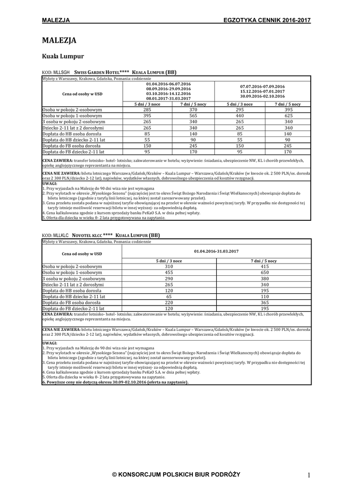 MALEZJA EGZOTYKA CENNIK 2016-2017 MALEZJA Kuala Lumpur KOD: MLLSGH SWISS GARDEN HOTEL**** KUALA LUMPUR (BB) Wyloty z Warszawy, Krakowa, Gdańska, Poznania: codziennie 01.04.2016-06.07.2016 08.09.2016-29.09.2016 03.10.2016-14.12.2016 Cena od osoby w USD 08.01.2017-31.03.2017 5 dni / 3 noce 7 dni / 5 nocy Osoba w pokoju 2-osobowym Osoba w pokoju 1-osobowym 3 osoba w pokoju 2-osobowym Dziecko 2-11 lat z 2 dorosłymi Dopłata do HB osoba dorosła Dopłata do HB dziecko 2-11 lat Dopłata do FB osoba dorosła Dopłata do FB dziecko 2-11 lat 285 395 265 265 85 55 150 95 370 565 340 340 140 90 245 170 07.07.2016-07.09.2016 15.12.2016-07.01.2017 30.09.2016-02.10.2016 5 dni / 3 noce 7 dni / 5 nocy 295 440 265 265 85 55 150 95 395 625 340 340 140 90 245 170 CENA ZAWIERA: transfer lotnisko- hotel- lotnisko; zakwaterowanie w hotelu; wyżywienie: śniadania, ubezpieczenie NW, KL i chorób przewlekłych, opiekę anglojęzycznego reprezentanta na miejscu. CENA NIE ZAWIERA: biletu lotniczego Warszawa/Gdańsk/Kraków – Kuala Lumpur – Warszawa/Gdańsk/Kraków (w kwocie ok. 2 500 PLN/os. dorosła oraz 2 300 PLN/dziecko 2-12 lat), napiwków, wydatków własnych, dobrowolnego ubezpieczenia od kosztów rezygnacji. UWAGI: 1. Przy wyjazdach na Malezję do 90 dni wiza nie jest wymagana 2. Przy wylotach w okresie „Wysokiego Sezonu” (najczęściej jest to okres Świąt Bożego Narodzenia i Świąt Wielkanocnych) obowiązuje dopłata do biletu lotniczego (zgodnie z taryfą linii lotniczej, na której został zarezerwowany przelot). 3. Cena przelotu została podana w najniższej taryfie obowiązującej na przelot w okresie ważności powyższej taryfy. W przypadku nie dostępności tej taryfy istnieje możliwość rezerwacji biletu w innej wyższej- za odpowiednią dopłatą. 4. Cena kalkulowana zgodnie z kursem sprzedaży banku PeKaO S.A. w dnia pełnej wpłaty. 5. Oferta dla dziecka w wieku 0- 2 lata przygotowywana na zapytanie. KOD: MLLKLC NOVOTEL KLCC **** KUALA LUMPUR (BB) Wyloty z Warszawy, Krakowa, Gdańska, Poznania: codziennie 01.04.2016-31.03.2017 Cena od osoby w USD Osoba w pokoju 2-osobowym Osoba w pokoju 1-osobowym 3 osoba w pokoju 2-osobowym Dziecko 2-11 lat z 2 dorosłymi Dopłata do HB osoba dorosła Dopłata do HB dziecko 2-11 lat Dopłata do FB osoba dorosła Dopłata do FB dziecko 2-11 lat 5 dni / 3 noce 7 dni / 5 nocy 310 455 290 265 120 65 220 120 415 650 380 340 195 110 365 195 CENA ZAWIERA: transfer lotnisko- hotel- lotnisko; zakwaterowanie w hotelu; wyżywienie: śniadania, ubezpieczenie NW, KL i chorób przewlekłych, opiekę anglojęzycznego reprezentanta na miejscu. CENA NIE ZAWIERA: biletu lotniczego Warszawa/Gdańsk/Kraków – Kuala Lumpur – Warszawa/Gdańsk/Kraków (w kwocie ok. 2 500 PLN/os. dorosła oraz 2 300 PLN/dziecko 2-12 lat), napiwków, wydatków własnych, dobrowolnego ubezpieczenia od kosztów rezygnacji. UWAGI: 1. Przy wyjazdach na Malezję do 90 dni wiza nie jest wymagana 2. Przy wylotach w okresie „Wysokiego Sezonu” (najczęściej jest to okres Świąt Bożego Narodzenia i Świąt Wielkanocnych) obowiązuje dopłata do biletu lotniczego (zgodnie z taryfą linii lotniczej, na której został zarezerwowany przelot). 3. Cena przelotu została podana w najniższej taryfie obowiązującej na przelot w okresie ważności powyższej taryfy. W przypadku nie dostępności tej taryfy istnieje możliwość rezerwacji biletu w innej wyższej- za odpowiednią dopłatą. 4. Cena kalkulowana zgodnie z kursem sprzedaży banku PeKaO S.A. w dnia pełnej wpłaty. 5. Oferta dla dziecka w wieku 0- 2 lata przygotowywana na zapytanie. 6. Powyższe ceny nie dotyczą okresu 30.09-02.10.2016 (oferta na zapytanie). © KONSORCJUM POLSKICH BIUR PODRÓŻY 1 MALEZJA EGZOTYKA CENNIK 2016-2017 SHANGRI-LA KL ***** KUALA LUMPUR Wyloty z Warszawy, Krakowa, Gdańska, Poznania: codziennie KOD: MLSTK (BB) 01.04.2016-31.03.2017 Cena od osoby w USD 5 dni / 3 noce 7 dni / 5 nocy 455 750 345 345 655 1145 470 470 Osoba w pokoju 2-osobowym Osoba w pokoju 1-osobowym 3 osoba w pokoju 2-osobowym Dziecko 2-11 lat z 2 dorosłymi CENA ZAWIERA: transfer lotnisko- hotel- lotnisko; zakwaterowanie w hotelu; wyżywienie: śniadania, ubezpieczenie NW, KL i chorób przewlekłych, opiekę anglojęzycznego reprezentanta na miejscu. CENA NIE ZAWIERA: biletu lotniczego Warszawa/Gdańsk/Kraków – Kuala Lumpur – Warszawa/Gdańsk/Kraków (w kwocie ok. 2 500 PLN/os. dorosła oraz 2 300 PLN/dziecko 2-12 lat), napiwków, wydatków własnych, dobrowolnego ubezpieczenia od kosztów rezygnacji. UWAGI: 1. Przy wyjazdach na Malezję do 90 dni wiza nie jest wymagana 2. Przy wylotach w okresie „Wysokiego Sezonu” (najczęściej jest to okres Świąt Bożego Narodzenia i Świąt Wielkanocnych) obowiązuje dopłata do biletu lotniczego (zgodnie z taryfą linii lotniczej, na której został zarezerwowany przelot). 3. Cena przelotu została podana w najniższej taryfie obowiązującej na przelot w okresie ważności powyższej taryfy. W przypadku nie dostępności tej taryfy istnieje możliwość rezerwacji biletu w innej wyższej- za odpowiednią dopłatą. 4. Cena kalkulowana zgodnie z kursem sprzedaży banku PeKaO S.A. w dnia pełnej wpłaty. 5. Oferta dla dziecka w wieku 0- 2 lata przygotowywana na zapytanie. 6. Obowiązkowa dopłata za kolację sylwestrową – cena do potwierdzenia. 7. Powyższe ceny nie dotyczą okresu 30.09-02.10.2016 (oferta na zapytanie). KOD: MLLMO MANDARIAN ORIENTAL ***** KUALA LUMPUR (BB) Wyloty z Warszawy, Krakowa, Gdańska, Poznania: codziennie 01.04.2016-31.03.2017 Cena od osoby w USD 5 dni / 3 noce 7 dni / 5 nocy 495 845 365 320 740 1295 495 425 Osoba w pokoju 2-osobowym Osoba w pokoju 1-osobowym 3 osoba w pokoju 2-osobowym Dziecko 2-11 lat z 2 dorosłymi CENA ZAWIERA: transfer lotnisko- hotel- lotnisko; zakwaterowanie w hotelu; wyżywienie: śniadania, ubezpieczenie NW, KL i chorób przewlekłych, opiekę anglojęzycznego reprezentanta na miejscu. CENA NIE ZAWIERA: biletu lotniczego Warszawa/Gda