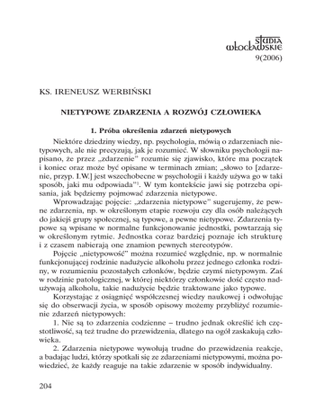 9(2006) KS. IRENEUSZ WERBIŃSKI NIETYPOWE ZDARZENIA A ROZWÓJ CZŁOWIEKA 1. Próba określenia zdarzeń nietypowych Niektóre dziedziny wiedzy, np. psychologia, mówią o zdarzeniach nietypowych, ale nie precyzują, jak je rozumieć. W słowniku psychologii napisano, że przez „zdarzenie” rozumie się zjawisko, które ma początek i koniec oraz może być opisane w terminach zmian; „słowo to [zdarzenie, przyp. I.W.] jest wszechobecne w psychologii i każdy używa go w taki sposób, jaki mu odpowiada”1. W tym kontekście jawi się potrzeba opisania, jak będziemy pojmować zdarzenia nietypowe. Wprowadzając pojęcie: „zdarzenia nietypowe” sugerujemy, że pewne zdarzenia, np. w określonym etapie rozwoju czy dla osób należących do jakiejś grupy społecznej, są typowe, a pewne nietypowe. Zdarzenia typowe są wpisane w normalne funkcjonowanie jednostki, powtarzają się w określonym rytmie. Jednostka coraz bardziej poznaje ich strukturę i z czasem nabierają one znamion pewnych stereotypów. Pojęcie „nietypowość” można rozumieć względnie, np. w normalnie funkcjonującej rodzinie nadużycie alkoholu przez jednego członka rodziny, w rozumieniu pozostałych członków, będzie czymś nietypowym. Zaś w rodzinie patologicznej, w której niektórzy członkowie dość często nadużywają alkoholu, takie nadużycie będzie traktowane jako typowe. Korzystając z osiągnięć współczesnej wiedzy naukowej i odwołując się do obserwacji życia, w sposób opisowy możemy przybliżyć rozumienie zdarzeń nietypowych: 1. Nie są to zdarzenia codzienne – trudno jednak określić ich częstotliwość, są też trudne do przewidzenia, dlatego na ogół zaskakują człowieka. 2. Zdarzenia nietypowe wywołują trudne do przewidzenia reakcje, a badając ludzi, którzy spotkali się ze zdarzeniami nietypowymi, można powiedzieć, że każdy reaguje na takie zdarzenie w sposób indywidualny. 204 3. Z badań przeprowadzonych przez autora niniejszego artykułu wśród studentów I roku (100 osób) wynika, że wpływ zdarzeń nietypowych na rozwój osobowy i na postawę człowieka jest znaczący. Weźmy na przykład wypadek samochodowy, który powoduje uszkodzenie ciała. Jeżeli nie jest ono stałe i da się je wyleczyć, wówczas wywiera ono tylko przejściowe skutki psychiczne czy duchowe, ale jeżeli się nie da wyleczyć – zdarzenie to będzie cały czas obecne w życiu człowieka. Na ogół rodzą się pytania: co byłoby „ze mną”, gdyby nie to zdarzenie? Co w tej sytuacji mogę zrobić? Trzeba znaleźć pewien pomysł na pozytywne włączenie zdarzenia nietypowego w całokształt rozwoju osobowego. Życie zaś weryfikuje, czy jest on właściwy. 4. Zdarzenia nietypowe, w których bierze udział jakaś osoba, mają swoje skutki nie tylko dla tej osoby, ale także dla środowiska, w którym ta osoba żyje. Nie zagłębiając się w szczegóły, rolę zdarzeń nietypowych w rozwoju osobowym możemy rozpatrywać dwukierunkowo: pewne zdarzenia wywierają pozytywny wpływ na rozwój osobowy, a inne negatywny. Jest to zależne od samej struktury zdarzeń osobowych, a także od fazy rozwojowej, okresu życia, w którym człowiek spotyka się ze zdarzeniami nietypowymi. W świetle tych dwu zmiennych możemy powiedzieć, że bardzo ważną rolę odgrywają zdarzenia nietypowe z okresu dzieciństwa. Dla przykładu można podać kilka takich zdarzeń: 1. Do nietypowych i bardzo szkodliwych sytuacji życiowych należy zaliczyć brak miłości wobec dziecka. 2. Kalectwo w dzieciństwie. 3. Duże znaczenie dla rozwoju osobowego dziecka i w całym późniejszym życiu ma rozejście się rodziców. W wyżej wspomnianych badaniach jedna ze studentek opisała na swoim przykładzie, jak proces prowadzący do rozwodu i sam rozwód rodziców wpłynął na rozwój jej osobowości. Jako dziecko była świadkiem pogarszających się relacji między rodzicami. Ojciec często znikał z domu i to na wiele dni, a kiedy wracał, były kłótnie. Matka nie wytrzymywała psychicznie i zaczęła sięgać po alkohol, co doprowadziło ją do uzależnienia. Szczęśliwym zbiegiem okoliczności, po rozwodzie rodziców, obydwie z matką trafiły do grupy modlitewnej, która im pomogła. Dlatego w ankiecie napisała, że pozytywne w tym wszystkim jest to, iż dzięki trafieniu do grupy modlitewnej, ma teraz głęboką wiarę wyrażającą się w żywych relacjach z Bogiem. W świetle tej wiary starała się pozytywnie spojrzeć na rozwód rodziców: „gdyby rodzice się nie rozwiedli, nie trafiłabym do 205 tej grupy modlitewnej, a wówczas nie przeżywałabym wiary w sposób tak żywy i pogłębiony”. 4. W szczególnie trudnej sytuacji wobec nietypowych i negatywnych zdarzeń są dzieci w rodzinie patologicznej, gdzie np. ojciec często nadużywa alkoholu i pod jego wpływem źle się zachowuje; dziecko może kodować takie zachowanie jako coś normalnego. 5. Nietypowe sytuacje dla dziecka następują również wtedy, gdy czyny dziecka są nieprawidłowo oceniane przez rodziców albo różnie oceniane przez każde z nich. Wówczas dziecko przeżywa konflikt, z którym musi sobie jakoś poradzić. Może na przykład uczyć się podwójnej moralności, aby jakoś przystosować się do zaistniałej sytuacji. 6. Nietypową sytuację mają też dzieci nadmiernie rozpieszczane przez rodziców. Wówczas niejednokrotnie dzieje się tak, że wszystkie zachcianki dziecka są spełniane. Wreszcie, gdy rodzice nie są w stanie spełnić zachcianek dziecka, zaczynają w sposób nieprawidłowy zaprowadzać rygor, przeciw któremu dziecko się buntuje. To wyzwala u rodziców ostrzejsze reakcje, z którymi dotąd dziecko się nie spotkało. Na ogół mają wówczas miejsce poważne niekonsekwencje pedagogiczne, prowadzące do różnych wypaczeń psychiki dziecka. 7. Nietypowa sytuacja dla dziecka ma miejsce również wtedy, kiedy jest wychowywane w skrajnej izolacji od rówieśników i od społeczeństwa. Duży wp