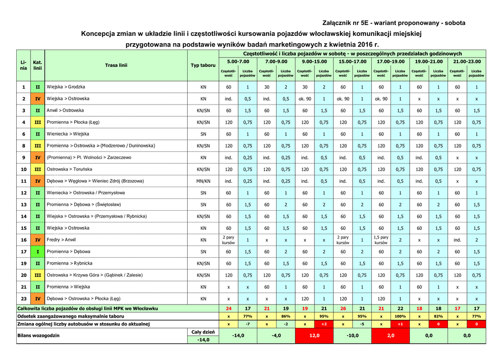 Załącznik nr 5E - wariant proponowany - sobota Koncepcja zmian w układzie linii i częstotliwości kursowania pojazdów włocławskiej komunikacji miejskiej przygotowana na podstawie wyników badań marketingowych z kwietnia 2016 r. Częstotliwość i liczba pojazdów w sobotę - w poszczególnych przedziałach godzinowych Linia Kat. linii 1 II Wiejska > Grodzka 2 IV Wiejska > Ostrowska 3 II 4 Trasa linii Typ taboru 5.00-7.00 7.00-9.00 9.00-15.00 15.00-17.00 17.00-19.00 19.00-21.00 21.00-23.00 Częstotliwość Liczba pojazdów Częstotliwość Liczba pojazdów Częstotliwość Liczba pojazdów Częstotliwość Liczba pojazdów Częstotliwość Liczba pojazdów Częstotliwość Liczba pojazdów Częstotliwość Liczba pojazdów KN 60 1 30 2 30 2 60 1 60 1 60 1 60 1 KN ind. 0,5 ind. 0,5 ok. 90 1 ok. 90 1 ok. 90 1 x x x x Anwil > Ostrowska KN/SN 60 1,5 60 1,5 60 1,5 60 1,5 60 1,5 60 1,5 60 1,5 III Promienna > Płocka (Łęg) KN/SN 120 0,75 120 0,75 120 0,75 120 0,75 120 0,75 120 0,75 120 0,75 6 II Wieniecka > Wiejska SN 60 1 60 1 60 1 60 1 60 1 60 1 60 1 8 III Promienna > Ostrowska > (Modzerowo / Duninowska) KN/SN 120 0,75 120 0,75 120 0,75 120 0,75 120 0,75 120 0,75 120 0,75 9 IV (Promienna) > Pl. Wolności > Zarzeczewo KN ind. 0,25 ind. 0,25 ind. 0,5 ind. 0,5 ind. 0,5 ind. 0,5 x x 10 III Ostrowska > Toruńska KN/SN 120 0,75 120 0,75 120 0,75 120 0,75 120 0,75 120 0,75 120 0,75 11 IV Dębowa > Węglowa > Wieniec Zdrój (Brzozowa) MN/KN ind. 0,25 ind. 0,25 ind. 0,5 ind. 0,5 ind. 0,5 ind. 0,5 x x 12 II Wieniecka > Ostrowska / Przemysłowa SN 60 1 60 1 60 1 60 1 60 1 60 1 60 1 13 II Promienna > Dębowa > (Świętosław) SN 60 1,5 60 2 60 2 60 2 60 2 60 2 60 1,5 14 II Wiejska > Ostrowska > (Przemysłowa / Rybnicka) KN/SN 60 1,5 60 1,5 60 1,5 60 1,5 60 1,5 60 1,5 60 1,5 15 II Wiejska > Ostrowska KN 60 1,5 60 1,5 60 1,5 60 1,5 60 1,5 60 1,5 60 1,5 Fredry > Anwil KN 2 pary kursów 1 x x x x 2 pary kursów 1 1,5 pary kursów 2 x x ind. 2 16 IV 17 I Promienna > Dębowa SN 60 1,5 60 2 60 2 60 2 60 2 60 2 60 1,5 19 II Promienna > Rybnicka KN/SN 60 1,5 60 1,5 60 1,5 60 1,5 60 1,5 60 1,5 60 1,5 20 III Ostrowska > Krzywa Góra > (Gąbinek / Zalesie) KN/SN 120 0,75 120 0,75 120 0,75 120 0,75 120 0,75 120 0,75 120 0,75 21 II Promienna > Wiejska KN x x 60 1 60 1 60 1 60 1 60 1 x x 23 IV Dębowa > Ostrowska > Płocka (Łęg) KN x x x x 120 1 120 1 120 1 x x x x 24 17 21 19 19 21 26 21 21 22 18 18 17 17 x 77% x 86% x 95% x 95% x 100% x 82% x 77% x -7 x -2 x +2 x -5 x +1 x 0 x 0 Całkowita liczba pojazdów do obsługi linii MPK we Włocławku Odsetek zaangażowanego maksymalnie taboru Zmiana ogólnej liczby autobusów w stosunku do aktualnej Bilans wozogodzin Cały dzień -14,0 -14,0 -4,0 12,0 -10,0 2,0 0,0 0,0