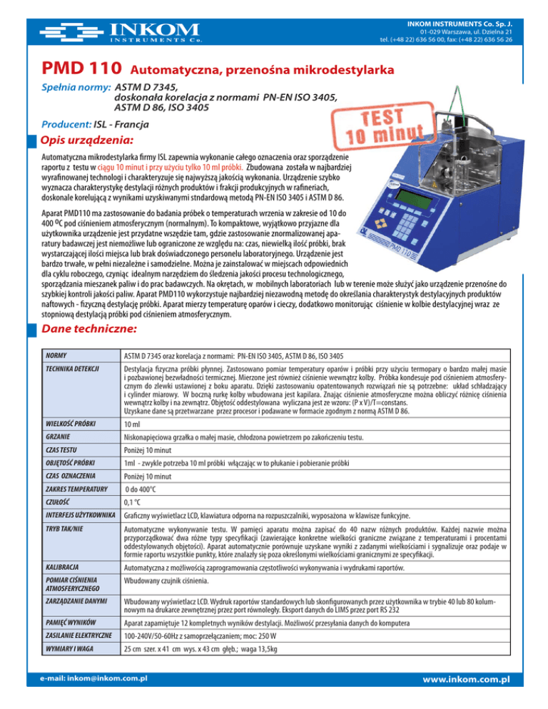 INKOM INSTRUMENTS Co. Sp. J. 01-029 Warszawa, ul. Dzielna 21 tel. (+48 22) 636 56 00, fax: (+48 22) 636 56 26 PMD 110 Automatyczna, przenośna mikrodestylarka Spełnia normy: ASTM D 7345, doskonała korelacja z normami PN-EN ISO 3405,, ASTM D 86, ISO 3405 Producent: ISL - Francja Opis urządzenia: Automatyczna mikrodestylarka firmy ISL zapewnia wykonanie całego oznaczenia oraz sporządzenie raportu z testu w ciągu 10 minut i przy użyciu tylko 10 ml próbki. Zbudowana została w najbardziej wyrafinowanej technologi i charakteryzuje się najwyższą jakością wykonania. Urządzenie szybko wyznacza charakterystykę destylacji różnych produktów i frakcji produkcyjnych w rafineriach, doskonale korelującą z wynikami uzyskiwanymi stndardową metodą PN-EN ISO 3405 i ASTM D 86. Aparat PMD110 ma zastosowanie do badania próbek o temperaturach wrzenia w zakresie od 10 do 400 oC pod ciśnieniem atmosferycznym (normalnym). To kompaktowe, wyjątkowo przyjazne dla użytkownika urządzenie jest przydatne wszędzie tam, gdzie zastosowanie znormalizowanej aparatury badawczej jest niemożliwe lub ograniczone ze względu na: czas, niewielką ilość próbki, brak wystarczającej ilości miejsca lub brak doświadczonego personelu laboratoryjnego. Urządzenie jest bardzo trwałe, w pełni niezależne i samodzielne. Można je zainstalować w miejscach odpowiednich dla cyklu roboczego, czyniąc idealnym narzędziem do śledzenia jakości procesu technologicznego, sporządzania mieszanek paliw i do prac badawczych. Na okrętach, w mobilnych laboratoriach lub w terenie może służyć jako urządzenie przenośne do szybkiej kontroli jakości paliw. Aparat PMD110 wykorzystuje najbardziej niezawodną metodę do określania charakterystyk destylacyjnych produktów naftowych - fizyczną destylację próbki. Aparat mierzy temperaturę oparów i cieczy, dodatkowo monitorując ciśnienie w kolbie destylacyjnej wraz ze stopniową destylacją próbki pod ciśnieniem atmosferycznym. Dane techniczne: NORMY ASTM D 7345 oraz korelacja z normami: PN-EN ISO 3405, ASTM D 86, ISO 3405 TECHNIKA DETEKCJI Destylacja fizyczna próbki płynnej. Zastosowano pomiar temperatury oparów i próbki przy użyciu termopary o bardzo małej masie i pozbawionej bezwładności termicznej. Mierzone jest również ciśnienie wewnątrz kolby. Próbka kondesuje pod ciśnieniem atmosferycznym do zlewki ustawionej z boku aparatu. Dzięki zastosowaniu opatentowanych rozwiązań nie są potrzebne: układ schładzający i cylinder miarowy. W boczną rurkę kolby wbudowana jest kapilara. Znając ciśnienie atmosferyczne można obliczyć różnicę ciśnienia wewnątrz kolby i na zewnątrz. Objętość oddestylowana wyliczana jest ze wzoru: (P x V)/T=constans. Uzyskane dane są przetwarzane przez procesor i podawane w formacie zgodnym z normą ASTM D 86. WIELKOŚĆ PRÓBKI 10 ml GRZANIE Niskonapięciowa grzałka o małej masie, chłodzona powietrzem po zakończeniu testu. CZAS TESTU Poniżej 10 minut OBJĘTOŚĆ PRÓBKI 1ml - zwykle potrzeba 10 ml próbki włączając w to płukanie i pobieranie próbki CZAS OZNACZENIA Poniżej 10 minut ZAKRES TEMPERATURY 0 do 400°C CZUŁOŚĆ 0,1 °C INTERFEJS UŻYTKOWNIKA Graficzny wyświetlacz LCD, klawiatura odporna na rozpuszczalniki, wyposażona w klawisze funkcyjne. TRYB TAK/NIE Automatyczne wykonywanie testu. W pamięci aparatu można zapisać do 40 nazw różnych produktów. Każdej nazwie można przyporządkować dwa różne typy specyfikacji (zawierające konkretne wielkości graniczne związane z temperaturami i procentami oddestylowanych objętości). Aparat automatycznie porównuje uzyskane wyniki z zadanymi wielkościami i sygnalizuje oraz podaje w formie raportu wszystkie punkty, które znalazły się poza określonymi wielkościami granicznymi ze specyfikacji. KALIBRACJA Automatyczna z możliwością zaprogramowania częstotliwości wykonywania i wydrukami raportów. POMIAR CIŚNIENIA ATMOSFERYCZNEGO Wbudowany czujnik ciśnienia. ZARZĄDZANIE DANYMI Wbudowany wyświetlacz LCD. Wydruk raportów standardowych lub skonfigurowanych przez użytkownika w trybie 40 lub 80 kolumnowym na drukarce zewnętrznej przez port równoległy. Eksport danych do LIMS przez port RS 232 PAMIĘĆ WYNIKÓW Aparat zapamiętuje 12 kompletnych wyników destylacji. Możliwość przesyłania danych do komputera ZASILANIE ELEKTRYCZNE 100-240V/50-60Hz z samoprzełączaniem; moc: 250 W WYMIARY I WAGA 25 cm szer. x 41 cm wys. x 43 cm głęb.; waga 13,5kg e-mail: [email protected] www.inkom.com.pl