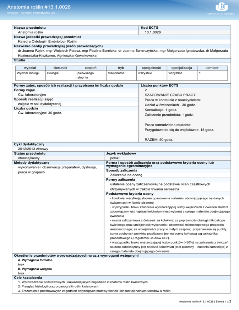 Anatomia roślin #13.1.0026 Sylabusy - Ośrodek Informatyczny UG Nazwa przedmiotu Kod ECTS Anatomia roślin 13.1.0026 Nazwa jedostki prowadzącej przedmiot Katedra Cytologii i Embriologii Roślin Nazwisko osoby prowadzącej (osób prowadzących) dr Joanna Rojek, mgr Wojciech Pałasz, mgr Paulina Burnicka, dr Joanna Świerczyńska, mgr Małgorzata Ignatowska, dr Małgorzata Kozieradzka-Kiszkurno, Agnieszka Kowalkowska Studia wydział Wydział Biologii kierunek Biologia stopień pierwszego stopnia tryb stacjonarne specjalność wszystkie Formy zajęć, sposób ich realizacji i przypisana im liczba godzin Formy zajęć Ćw. laboratoryjne Sposób realizacji zajęć zajęcia w sali dydaktycznej Liczba godzin Ćw. laboratoryjne: 30 godz. specjalizacja wszystkie semestr 1 Liczba punktów ECTS 2 SZACOWANIE CZASU PRACY Praca w kontakcie z nauczycielem: Udział w ćwiczeniach - 30 godz. Konsultacje: 1 godz. Zaliczenie przedmiotu: 1 godz. Praca samodzielna studenta: Przygotowanie się do wejściówek: 18 godz. RAZEM: 50 godz. Cykl dydaktyczny 2012/2013 zimowy Status przedmiotu obowiązkowy Metody dydaktyczne wykonywanie i obserwacja preparatów, dyskusja, praca w grupach Język wykładowy polski Forma i sposób zaliczenia oraz podstawowe kryteria oceny lub wymagania egzaminacyjne Sposób zaliczenia Zaliczenie na ocenę Formy zaliczenia ustalenie oceny zaliczeniowej na podstawie ocen cząstkowych otrzymywanych w trakcie trwania semestru Podstawowe kryteria oceny • kolokwia: weryfikują stopień opanowania materiału obowiązującego na danych ćwiczeniach w formie pisemnej • w przypadku braku zaliczenia wystarczającej liczby wejściówek z ćwiczeń student zobowiązany jest napisać kolokwium (test wyboru) z całego materiału obejmującego ćwiczenia • ocena zaliczeniowa z ćwiczeń: za kolokwia; za poprawność obsługi mikroskopu świetlnego oraz umiejętność wykonania i obserwacji mikroskopowego preparatu anatomicznego; za umiejetności pracy w malym zespole; przyznawane są punkty; suma zdobytych punktów przeliczana jest na ocenę końcową wg wskaźnika procentowego („Regulamin Studiów UG”) • w przypadku braku wystarczającej liczby punktów (<50%) na zaliczenie z ćwiczeń student zobowiązany jest napisać kolokwium (test pisemny – zadania zamknięte) z całego materiału obejmującego ćwiczenia Określenie przedmiotów wprowadzających wraz z wymogami wstępnymi A. Wymagania formalne brak B. Wymagania wstępne brak Cele kształcenia 1. Wprowadzenie podstawowych i najważniejszych zagadnień z anatomii roślin kwiatowych 2. Przegląd histologii oraz organografii roślin kwiatowych 3. Zrozumienie podstawowych zagadnień dotyczących budowy tkanek i ich funkcjonalnych układów u roślin Anatomia roślin #13.1.0026 | Strona 1 z 2 Anatomia roślin #13.1.0026 Sylabusy - Ośrodek Informatyczny UG Treści programowe Budowa komórki roślinnej. Budowa i funkcje tkanek roślin okrytonasiennych. Morfologia i anatomia organów roślin wyższych: łodygi (budowa pierwotna i przyrost na grubość), liścia, korzenia (budowa pierwotna i wtórna). Wykaz literatury A. Literatura wymagana do ostatecznego zaliczenia zajęć (zdania egzaminu): A.1. wykorzystywana podczas zajęć Braune W, Leman A, Taubert H. 1975. Praktikum z anatomii roślin. PWN, Warszawa Gorczyński T. (red). 1979. Ćwiczenia z botaniki. PWN, Warszawa A.2. studiowana samodzielnie przez studenta Hejnowicz Z. 2002. Anatomia i histogeneza roślin naczyniowych. PWN, Warszawa. Esau K. 1973. Anatomia roślin. PWRiL, Warszawa. B. Literatura uzupełniająca Malinowski E. 1973. Anatomia roślin. PWN, Warszawa Efekty uczenia się Przedmiot realizuje: Efekty z obszaru nauk przyrodniczych: P1A_W01, P1A_W05, P1A_ U01, P1A_U02, P1A_ U06, P1A_ U07, P1A_U11, P1A_K02, P1A_K06 Efekty dla kierunku Biologia UG: B_W03, B_W04, B_U01, BU02, B_U05, B_U06, B_U08, B_K03, B_K06 Wiedza - przedstawia budowę organizmów roślinnych oraz zależności funkcjonalne na poziomie komórkowym, tkankowym, narządowym i organizmalnym przy użyciu mikroskopii świetlnej (B_W03) - rozumie przebieg podstawowych procesów fizjologicznych i ich związek z adaptacją organizmu do zmieniających się warunków środowiska (budowa i rozmieszczenie tkanek w roślinie), na podstawie analizy preparatów anatomicznych roślin (B_W04) Umiejętności - stosuje podstawową aparaturę i narzędzia badawcze (mikroskop świetlny) oraz zachowuje poprawną kolejność czynności w pracach laboratoryjnych (B_U01) - przeprowadza obserwacje mikroskopowe oraz wykonuje w laboratorium podstawowe pomiary anatomiczne (B_U02) - dokonuje syntezy danych pochodzących z różnych źródeł, dotyczących struktury organów roślinnych i wyciąga na tej podstawie wnioski (B_U05) - czyta ze zrozumieniem proste biologiczne artykuły naukowe dotyczące anatomii i histogenezy roślin w języku polskim (B_U06) - uczy się samodzielnie, w sposób ukierunkowany na anatomię roślin (B_U08) Kompetencje społeczne (postawy) - potrafi zorganizować pracę małego zespołu oraz wykazuje zdolność do efektywnej pracy w zespole (B_K03) - jest odpowiedzialny za powierzony sprzęt (mikroskop świetlny), materiały i własną pracę oraz szanuje pracę innych (B_K06) Kontakt [email protected] Anatomia roślin #13.1.0026 | Strona 2 z 2