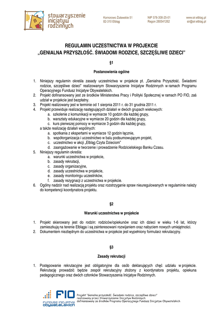 REGULAMIN UCZESTNICTWA W PROJEKCIE „GENIALNA PRZYSZŁOŚĆ. ŚWIADOMI RODZICE, SZCZĘŚLIWE DZIECI” §1 Postanowienia ogólne 1. Niniejszy regulamin określa zasady uczestnictwa w projekcie pt. „Genialna Przyszłość. Świadomi rodzice, szczęśliwe dzieci” realizowanym Stowarzyszenie Inicjatyw Rodzinnych w ramach Programu Operacyjnego Fundusz Inicjatyw Obywatelskich. 2. Projekt dofinansowany jest ze środków Ministerstwa Pracy i Polityki Społecznej w ramach PO FIO, zaś udział w projekcie jest bezpłatny. 3. Projekt realizowany jest w terminie od 1 sierpnia 2011 r. do 31 grudnia 2011 r. 4. Projekt przewiduje realizację następujących działań w dwóch grupach wiekowych: a. szkolenie z komunikacji w wymiarze 10 godzin dla każdej grupy, b. warsztaty edukacyjne w wymiarze 20 godzin dla każdej grupy, c. kurs pierwszej pomocy w wymiarze 3 godzin dla każdej grupy, a także realizację działań wspólnych: a. spotkania z ekspertami w wymiarze 12 godzin łącznie, b. współorganizacja i uczestnictwo w balu podsumowującym projekt, c. uczestnictwo w akcji „Elbląg Czyta Dzieciom” d. zaangażowanie w tworzenie i prowadzenie Rodzicielskiego Banku Czasu. 5. Niniejszy regulamin określa: a. warunki uczestnictwa w projekcie, b. zasady rekrutacji, c. zasady organizacyjne, d. zasady uczestnictwa w projekcie, e. zasady monitoringu uczestników, f. zasady rezygnacji z uczestnictwa w projekcie. 6. Ogólny nadzór nad realizacją projektu oraz rozstrzyganie spraw nieuregulowanych w regulaminie należy do kompetencji koordynatora projektu. §2 Warunki uczestnictwa w projekcie 1. Projekt skierowany jest do rodzin: rodziców/opiekunów oraz ich dzieci w wieku 1-6 lat, którzy zamieszkują na terenie Elbląga i są zainteresowani rozwijaniem oraz nabyciem nowych umiejętności. 2. Dokumentem niezbędnym do uczestnictwa w projekcie jest wypełniony formularz rekrutacyjny. §3 Zasady rekrutacji 1. Postępowanie rekrutacyjne jest obligatoryjne dla osób deklarujących chęć udziału w projekcie. Rekrutację prowadzić będzie zespół rekrutacyjny złożony z koordynatora projektu, opiekuna pedagogicznego oraz dwóch członków Stowarzyszenia Inicjatyw Rodzinnych. 2. Działania rekrutacyjne obejmują następujące etapy: a. wypełnienie przez zainteresowanych dostępnego na stronie internetowej oraz drogą e-mailową formularza rekrutacyjnego i przesłanie go na adres [email protected], b. weryfikacja kryteriów formalnych, wybór uczestników projektu, c. powiadomienie kandydatów na uczestników o (nie)zakwalifikowaniu się do udziału w projekcie. 3. Proces rekrutacji będzie trwał do 5 września 2011 roku, zaś informacja o (nie)zakwalifikowaniu się podana zostanie najpóźniej do dnia 9 września. 4. Rekrutacji dokonuje zespół rekrutacyjny na podstawie kompletu złożonych dokumentów oraz informacji w nich zawartych, zgodnie z założeniami projektu. O decyzji zespołu rekrutacyjnego osoby zakwalifikowane zostaną niezwłocznie powiadomione drogą elektroniczną bądź telefoniczną. 5. Uczestnicy po zakwalifikowaniu ich przez zespół rekrutacyjny, są zobowiązani do udział w spotkaniu organizacyjnym, które odbędzie się 10 września oraz podpisania Deklaracji uczestnictwa w projekcie. 6. Zespół rekrutacyjny utworzy listę rezerwową uczestników, na której znajdą się osoby niezakwalifikowane z uwagi na brak miejsc. 7. Osoby z list rezerwowych zostaną włączone do uczestnictwa w projekcie w przypadku rezygnacji lub niedopełnienia warunków przez osoby wcześniej zakwalifikowane. Decyzję o włączeniu do uczestnictwa w projekcie kandydatów z listy rezerwowej podejmuje koordynator projektu. §4 Zasady organizacyjne 1. Wszelkie dokumenty oraz informacje o działaniach projektowych zamieszczane będą na stronie internetowej projektu www.sir.elblag.pl. 2. Terminy szkoleń oraz spotkań będą dostosowane do możliwości uczestników projektu i ustalone zostaną na spotkaniu organizacyjnym w dniu 10 września 2011r. 3. Wszyscy uczestnicy otrzymają niezbędne do pracy materiały edukacyjne i szkoleniowe oraz poczęstunek podczas zajęć. §5 Zasady uczestnictwa w projekcie 1. W spotkania mogą uczestniczyć wyłącznie rodziny: dzieci wraz z rodzicami/opiekunami. 2. Uczestnicy zobowiązani są do regularnego uczestnictwa w zajęciach, potwierdzonych każdorazowo osobistym podpisem osoby dorosłej na liście obecności. 3. Elementem obowiązkowym dla wszystkich rodziców/opiekunów jest uczestnictwo w szkoleniu z zakresu komunikacji rodziców/opiekunów z dziećmi. 4. W zajęciach uczestniczyć mogą razem z rodzicami/opiekunami osoby sprawujące opiekę nad dziećmi, bądź mające z nimi stały kontakt, np. niania, dziadek, ciocia. Jednak informacja taka powinna dotrzeć do organizatorów minimum 3 dni przed zaplanowanym spotkaniem. 5. Dopuszczalna jest nieobecność rodziców / opiekunów na 20% zajęć warsztatowych. W takiej sytuacji dziecko może wziąć udział w spotkaniu pod opieką osoby posiadającej stosowne oświadczenie rodziców/opiekunów. 6. Nieusprawiedliwiona nieobecność dzieci na więcej niż 10% zajęć powoduje skreślenie z listy uczestników. 7. Organizator dopuszcza usprawiedliwione nieobecności spowodowane chorobą lub ważnymi sytuacjami losowymi. Podstawą usprawiedliwienia jest informacja przekazana koordynatorowi projektu i zaakceptowana przez niego. §6 Zasady monitoringu uczestników szkoleń 1. Uczestnik projektu zobowiązuje się do podpisywania listy obecności na każdym spotkaniu oraz wypełniania ankiet monitorujących i dzienniczków zajęć prowadzonych w ramach projektu. 2. Uczestnik projektu ma prawo wpływać na profilowanie tematyki zajęć realizowanych w projekcie poprzez przekazywanie ustnie lub pisemnie informacji o proponowanych zmianach koordynatorowi projektu, opiekunowi pedagogicznemu bądź wykładowcy prowadzącemu zajęcia. 3. Uczestnik projektu akceptuje zasady ewaluacji projektu, co poświadcza osobiście podpi
