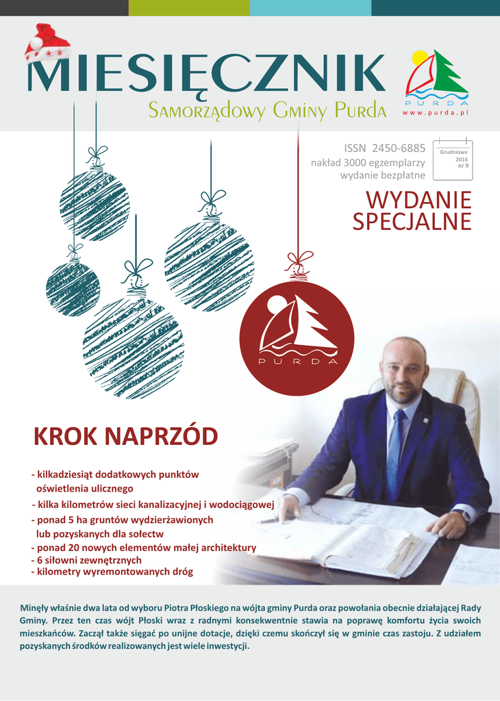 ISSN 2450-6885 nakład 3000 egzemplarzy wydanie bezpłatne Grudniowe 2016 nr 9 WYDANIE SPECJALNE KROK NAPRZÓD - kilkadziesiąt dodatkowych punktów oświetlenia ulicznego - kilka kilometrów sieci kanalizacyjnej i wodociągowej - ponad 5 ha gruntów wydzierżawionych lub pozyskanych dla sołectw - ponad 20 nowych elementów małej architektury - 6 siłowni zewnętrznych - kilometry wyremontowanych dróg Minęły właśnie dwa lata od wyboru Piotra Płoskiego na wójta gminy Purda oraz powołania obecnie działającej Rady Gminy. Przez ten czas wójt Płoski wraz z radnymi konsekwentnie stawia na poprawę komfortu życia swoich mieszkańców. Zaczął także sięgać po unijne dotacje, dzięki czemu skończył się w gminie czas zastoju. Z udziałem pozyskanych środków realizowanych jest wiele inwestycji. W PIERWSZEJ KOLEJNOŚCI DZIECI Zmiany zaczęły się od reorganizacji zasad dowożenia dzieci do placówek oświatowych znajdujących się na terenie gminy. - Przed moim przyjęciem do urzędu przewoźnikom płacono z kasy gminy po 55 zł za jeden kilometr. Dla mnie były to niewyobrażalnie duże pieniądze jak na taką usługę – mówi wójt Piotr Płoski. Władze gminy postanowiły to zmienić. Wprowadzono nowe zasady, zgodnie z którymi przewoźnikom zleca się obsługę poszczególnych tras. - W ten sposób zaoszczędziliśmy dużo pieniędzy. I wykorzystujemy je z pożytkiem fundując dzieciom z naszej gminy dojazd i korzystanie z basenu – mówi wójt Piotr Płoski. Z nauki pływania korzystają dzieci ze Szkoły Podstawowej w Szczęsnem i Zespołu Szkolno-Przedszkolnego w Klebarku Wielkim. Rekreacyjnie z pływania na basenie korzystają uczniowie z Zespołu Szkolno-Przedszkolnego w Butrynach. Daliśmy dyrektorom tych placówek wolną rękę i to oni wybrali formę zajęć. Nie ukrywają, że są z tego bardzo zadowoleni. Z inicjatywy wójta powstał także program stypendialny pod nazwą „Lokalny Program Wspierania Szczególnie Uzdolnionych Uczniów”. W ramach programu ustanowiono trzy rodzaje stypendiów: sportowe, naukowe i artystyczne. O stypendia mogą się ubiegać uczniowie szkół podstawowych klas IV-VI i klas IIII gimnazjum. Z wnioskiem o przyznanie stypendium mogą występować m.in. dyrektorzy szkół, nauczyciele i trenerzy. W roku 2016 komisja stypendialna przyznała w sumie 26 stypendiów. - To bardzo ważna i potrzebna inicjatywa. Środki ze stypendium można przeznaczyć na dodatkowe lekcje, nowy instrument muzyczny czy sprzęt sportowy. Warto inwestować w młodzież. Ona jest naszą przyszłością. Cieszę się, że radni podzielają moją opinię w tej sprawie. Bardzo zależało mi na utworzeniu programu stypendialnego w gminie Purda, ponieważ dzięki niemu dzieci mogą rozwijać swoje pasje i umiejętności - mówi wójt Piotr Płoski. INWESTYCJE ZE ŚRODKÓW ZEWNĘTRZNYCH Do najważniejszych inwestycji zaliczyć można budowę elektrowni fotowoltaicznych zasilanych z energii słonecznej oraz przebudowę kotłowni w gminnych szkołach. Władze Purdy pozyskały na ten cel 720 tys. w ramach RPO Warmia i Mazury 2014-2020. Dzięki zdobytym funduszom możliwa będzie modernizacja dwóch słabo wydajnych kotłowni na węgiel na dwie nowe wysoko sprawne kotłownie na biomasę wraz z pełną automatyką w Zespole Szkolno-Przedszkolnym w Butrynach oraz Szkole Podstawowej w Szczęsnem. W ramach pozyskanych środków planowana jest także budowa czterech elektrowni fotowoltaicznych. Nie są to jedyne inwestycje, które zostaną przeprowadzone na terenie gminy Purda. Z kolejnych skorzystają mieszkańcy miejscowości Trękusek. Gmina wybuduje tam kanalizację sanitarną o długości prawie dwóch kilometrów i sieć wodociągową o długości około 300 metrów. Wartość tego przedsięwzięcia to 447 tys. zł. Pieniądze pozyskano z Agencji Nieruchomości Rolnych w Olsztynie. Gmina pozyskała również dofinansowanie w wysokości 680 tys. zł na zakup dwóch średnich samochodów ratowniczo–gaśniczych oraz sprzętu dla trzech jednostek Ochotniczej Straży Pożarnej. W efekcie konkursu rozstrzygniętego przez Zarząd Województwa Warmińsko–Mazurskiego gmina Purda wzmocni ochronę przeciwpożarową na terenie gminy i powiatu. Do swoich sukcesów władze gminy mogą zaliczyć budowę boiska wielofunkcyjnego w Purdzie. Obiekt został oddany do użytku 30 września br. Całkowity koszt inwestycji wyniósł 354 tys. zł, a gmina pozyskała dofinansowanie w kwocie 116 tys. zł z Ministerstwa Sportu. Dzięki temu mieszkańcy mają do dyspozycji boisko z nowoczesną nawierzchnią poliuretanową wraz z ogrodzeniem. Cały obiekt został oświetlony. Konsekwentne działania władz gminy prowadzą również do realizacji drobniejszych, lecz nie mniej ważnych inwestycji, które bezpośrednio wpływają na poprawę komfortu życia codziennego. Przykładem jest na pewno wyremontowanie fragmentu drogi w Ostrzeszewie, której stan techniczny pozostawiał wiele do życzenia. FUNDUSZ SOŁECKI MOTOREM NAPĘDOWYM GMINY Warto nadmienić, że w gminie Purda realizowane są również projekty finansowane z budżetu gminy w ramach funduszy sołeckich. W tym przypadku to mieszkańcy poszczególnych miejscowości decydują, co powinno zostać zrobione w ich najbliższym otoczeniu. W tym roku wszystkie sołectwa otrzymały do wykorzystania fundusz sołecki. Środki można było przeznaczyć na dowolne potrzeby wsi i jej mieszkańców. - Znaczna część z tych pieniędzy została wykorzystana na inwestycje. Dziękuję Radnym za poparcie mojego pomysłu i wprowadzenie Funduszu Sołeckiego. Zaryzykuję stwierdzenie, że nie ma osób niezadowolonych z tej decyzji – mówi Piotr Płoski, fot. Jolanta Kolinko wójt gminy Purda. Sołectwa Purda i Butryny zdecydowały się przeznaczyć większą część swojego funduszu sołeckiego na remont świetlic. W Butrynach remontowany jest praktycznie cały budynek, tj. sala widowiskowa wraz z zapleczem kuchennym i toaletami oraz mała sala, w 