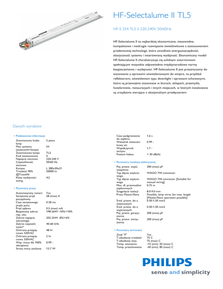HF-Selectalume II TL5 HF-S 254 TL5 II 220-240V 50/60Hz HF-Selectalume II to najbardziej ekonomiczne, niezawodne, kompaktowe i niedrogie rozwiązanie świetlówkowe z zastosowaniem przełomowej technologii, która umożliwia energooszczędność, elastyczność systemu i niezrównaną wydajność. Ekonomiczny model HF-Selectalume II charakteryzuje się solidnym wzornictwem spełniającym wszystkie odpowiednie międzynarodowe normy bezpieczeństwa i wydajności. HF-Selectalume II jest przeznaczony do stosowania z oprawami oświetleniowymi do wnętrz, na przykład reflektorami, oświetleniem typu downlight i oprawami schowanymi, które są przeważnie stosowane w biurach, sklepach, przemyśle, hotelarstwie, restauracjach i innych miejscach, w których instalowane są urządzenia sterujące z okazjonalnym przełączaniem Danych wyrobów • Podstawowe informacje Znamionowa liczba lamp Moc systemu (statecznik+lampa) Znamionowa lampa Kod zastosowania Napięcie sieciowe Częstotliwość sieciowa Korpus Trwałość 90% @Tcaselife Klasa wydajności energ. 2 piece 54 TL5 II 220-240 V 50/60 Hz L 280x30x21 50000 hr A2 • Parametry pracy Automatyczny restart Szczytowy prąd początkowy Czas szczytowego prądu pocz. Prąd upływu Bezpieczny zakres nap. siec. Zakres napięcia sieciowego Zakres częstotliwości* Ochrona przepięciowa 320VAC Ochrona przepięciowa 350VAC Wsp. mocy dla 100% obciążenia Straty mocy zasilacza Yes 28 (max) A 0.38 ms 0.5 (max) mA 198-264V -10%/+10% 202-254V -8%/+6% 40-60 kHz 48 hr 2 hr 0.99 13.7 W Czas podgrzewania do zapłonu Wskaźnik statecznikowy str. Współczynnik szczytu Poziom hałasu 1.6 s 0.99 1.7 < 30 dB(A) • Parametry instalacji elektrycznej Poj. przew. wyjść. wzajemna Typ złącza wejściowego Typ złącza wyjściowego Max. dł. przewodów zapłonowych Ściągnięcie izolacji Praca Master/Slave Śred. przew. do z. wejściowych Śred. przew. do z. wyjściowych Poj. przew. gorącyziemia Poj. przew. zimnyziemia 200 (max) pF WAGO 744 connector WAGO 744 connector [Suitable for manual wiring] 0.75 m 8.0-9.0 mm Possible, lamp wires 2m max. length [Master/Slave operation possible] 0.50-1.50 mm2 0.50-1.50 mm2 200 (max) pF 200 (max) pF • Parametry termiczne Znak "F" T-obudowy trwałość T-obudowy max. Temp. otoczenia Temp. przechowania Yes 75 C 75 (max) C -15 (min), 50 (max) C -40 (min), 80 (max) C HF-Selectalume II TL5 Oznaczenie TISI Zgodność SIRIM Certyfikat CB • Wymiary Długość A1 Odległ. otw. montaż. dł. A2 Szerokość B1 Wysokość C1 Średnica otworu montażowego D1 360.0 mm 350.0 mm • Dane produktu 30.0 mm 21.5 mm 4.1 mm • Spełniane normy i wymogi Częst.rad. 9 kHz ... 30MHz Wibracje Odporność na wstrząsy Certyfikaty Oznaczenie CE Certyfikat ENEC Certyfikat C-Tick Certyfikat CCC Certyfikat PSB Yes Yes Yes EN 55015 IEC 68-2-6 Fc IEC 68-2-29 Eb (10G/16ms) CE / CCC / ENEC / VDE-EMV Yes Yes Yes Yes Yes Kod zamówienia Kod produktu Nazwa produktu Nazwa produktu na zamówieniu Liczba sztuk w opakowaniu Opakowanie zbiorcze Liczba opakowan w kartonie zbiorczym Kod kreskowy na produkcie Kod kreskowy na opakowaniu zbiorczym Kod logistyczny 12NC Waga netto 1 szt. 905625 00 872790090562500 HF-S 254 TL5 II 220-240V 50/60Hz HF-S 254 TL5 II 220-240V 50/60Hz 1 12 12 8711500999382 8727900905625 913713033766 0.225 kg Rysunki techniczne HF-S 254 TL5 II 220-240V 50/60Hz Product A1 (Norm) A2 (Norm) B1 (Norm) C1 (Norm) D1 (Norm) HF-S 254 TL5 II 220-240V 50/60Hz 360.0 11 30.0 21.5 4.1 1 2 3 HF-S II BALLAST 13 12 350.0 4 5 ~ ~ 6 2 Lamps Dane fotometryczne Ballast type Lamp type Lamp power HF-S 254 TL5 II 220-240V 50/60Hz TL5 HO 54W Ta = 40°C Ta = 50°C Ta = 60°C Tc =65°C =75°C X Lifetime 80,000 Hrs 50,000 Hrs X HF-S 254 TL5 II 2013, Maj 7 Dane wkrótce ulegną zmianie HF-Selectalume II TL5 © 2013 Koninklijke Philips Electronics N.V. Wszelkie prawa zastrzeżone Dane mogą ulec zmianie bez uprzedniego powiadomienia. Znak towarowy jest własnością Koninklijke Philips Electronics N.V. lub odpowiednich podmiotów . www.philips.com/lighting 2013, Maj 7 Dane wkrótce ulegną zmianie