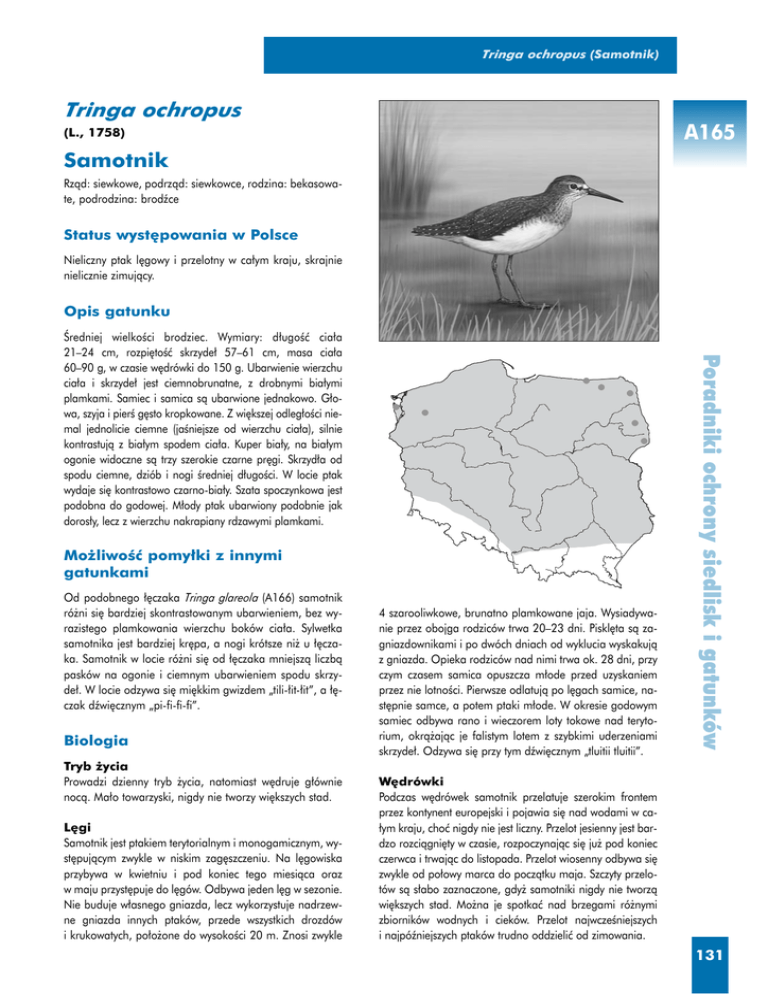 Tringa ochropus (Samotnik) Tringa ochropus A165 (L., 1758) Samotnik Rzàd: siewkowe, podrzàd: siewkowce, rodzina: bekasowate, podrodzina: brodêce Status wyst´powania w Polsce Nieliczny ptak l´gowy i przelotny w ca∏ym kraju, skrajnie nielicznie zimujàcy. Opis gatunku Mo˝liwoÊç pomy∏ki z innymi gatunkami Od podobnego ∏´czaka Tringa glareola (A166) samotnik ró˝ni si´ bardziej skontrastowanym ubarwieniem, bez wyrazistego plamkowania wierzchu boków cia∏a. Sylwetka samotnika jest bardziej kr´pa, a nogi krótsze ni˝ u ∏´czaka. Samotnik w locie ró˝ni si´ od ∏´czaka mniejszà liczbà pasków na ogonie i ciemnym ubarwieniem spodu skrzyde∏. W locie odzywa si´ mi´kkim gwizdem „tili-∏it-∏it”, a ∏´czak dêwi´cznym „pi-fi-fi-fi”. Biologia Tryb ˝ycia Prowadzi dzienny tryb ˝ycia, natomiast w´druje g∏ównie nocà. Ma∏o towarzyski, nigdy nie tworzy wi´kszych stad. L´gi Samotnik jest ptakiem terytorialnym i monogamicznym, wyst´pujàcym zwykle w niskim zag´szczeniu. Na l´gowiska przybywa w kwietniu i pod koniec tego miesiàca oraz w maju przyst´puje do l´gów. Odbywa jeden l´g w sezonie. Nie buduje w∏asnego gniazda, lecz wykorzystuje nadrzewne gniazda innych ptaków, przede wszystkich drozdów i krukowatych, po∏o˝one do wysokoÊci 20 m. Znosi zwykle samotnik 4 szarooliwkowe, brunatno plamkowane jaja. Wysiadywanie przez obojga rodziców trwa 20–23 dni. Piskl´ta sà zagniazdownikami i po dwóch dniach od wyklucia wyskakujà z gniazda. Opieka rodziców nad nimi trwa ok. 28 dni, przy czym czasem samica opuszcza m∏ode przed uzyskaniem przez nie lotnoÊci. Pierwsze odlatujà po l´gach samice, nast´pnie samce, a potem ptaki m∏ode. W okresie godowym samiec odbywa rano i wieczorem loty tokowe nad terytorium, okrà˝ajàc je falistym lotem z szybkimi uderzeniami skrzyde∏. Odzywa si´ przy tym dêwi´cznym „tluitii tluitii”. Poradniki ochrony siedlisk i gatunków Âredniej wielkoÊci brodziec. Wymiary: d∏ugoÊç cia∏a 21–24 cm, rozpi´toÊç skrzyde∏ 57–61 cm, masa cia∏a 60–90 g, w czasie w´drówki do 150 g. Ubarwienie wierzchu cia∏a i skrzyde∏ jest ciemnobrunatne, z drobnymi bia∏ymi plamkami. Samiec i samica sà ubarwione jednakowo. G∏owa, szyja i pierÊ g´sto kropkowane. Z wi´kszej odleg∏oÊci niemal jednolicie ciemne (jaÊniejsze od wierzchu cia∏a), silnie kontrastujà z bia∏ym spodem cia∏a. Kuper bia∏y, na bia∏ym ogonie widoczne sà trzy szerokie czarne pr´gi. Skrzyd∏a od spodu ciemne, dziób i nogi Êredniej d∏ugoÊci. W locie ptak wydaje si´ kontrastowo czarno-bia∏y. Szata spoczynkowa jest podobna do godowej. M∏ody ptak ubarwiony podobnie jak doros∏y, lecz z wierzchu nakrapiany rdzawymi plamkami. W´drówki Podczas w´drówek samotnik przelatuje szerokim frontem przez kontynent europejski i pojawia si´ nad wodami w ca∏ym kraju, choç nigdy nie jest liczny. Przelot jesienny jest bardzo rozciàgni´ty w czasie, rozpoczynajàc si´ ju˝ pod koniec czerwca i trwajàc do listopada. Przelot wiosenny odbywa si´ zwykle od po∏owy marca do poczàtku maja. Szczyty przelotów sà s∏abo zaznaczone, gdy˝ samotniki nigdy nie tworzà wi´kszych stad. Mo˝na je spotkaç nad brzegami ró˝nymi zbiorników wodnych i cieków. Przelot najwczeÊniejszych i najpóêniejszych ptaków trudno oddzieliç od zimowania. 131 Ptaki (cz´Êç II) Poradniki ochrony siedlisk i gatunków A165 Zimowanie Podczas zimy samotnik wyst´puje nad ró˝nymi wodami, z regu∏y Êródlàdowymi, poczàwszy od Skandynawii w ∏agodne zimy, w ró˝nych miejscach Europy zachodniej po tropikalnà Afryk´. Zjawisko zimowania samotników w Polsce jest znane od dawna, ale zawsze dotyczy∏o ono nielicznych osobników. Najcz´Êciej pozostajà na zim´ w Wielkopolsce, Ma∏opolsce i na Âlàsku, ale sporadyczne przypadki zimowania znane sà tak˝e z pó∏nocy i wschodu kraju. Zwykle zimujà pojedyncze ptaki, wyjàtkowo ma∏e grupki, a liczebnoÊç w du˝ym stopniu zale˝y od ∏agodnoÊci zimy. Pokarm Samotnik ˝ywi si´ urozmaiconym pokarmem z∏o˝onym z ró˝nych bezkr´gowców: wodnych i làdowych owadów i ich larw, drobnych skorupiaków, pierÊcienic, pajàków oraz drobnych rybek. Pokarm zbiera z powierzchni gruntu lub brodzàc w p∏ytkiej wodzie. Rozmieszczenie w Polsce Samotnik wyst´puje na ni˝u ca∏ego kraju, ale jest rozmieszczony bardzo nierównomiernie, w zale˝noÊci od wyst´powania odpowiednich siedlisk l´gowych, stàd brak go na wielu bezleÊnych i przesuszonych obszarach Êrodkowej i zachodniej Polski. Najliczniej wyst´puje w du˝ych kompleksach leÊnych w pó∏nocno-wschodniej Polsce, m.in. w Puszczach: Boreckiej, Knyszyƒskiej, Augustowskiej, Bia∏owieskiej, a tak˝e na Bagnach Biebrzaƒskich. Na Pomorzu wyst´puje w dolinach wi´kszoÊci rzek oraz w kompleksach leÊnych w krajobrazie morenowym. W Wielkopolsce najliczniej gniazduje w Pilskiem i w Puszczy Nadnoteckiej, a na Âlàsku w dolinie Baryczy, w Borach DolnoÊlàskich oraz w Lasach Lublinieckich. W Êrodkowej cz´Êci kraju zasiedla dolin´ Pilicy i Lasy Spalskie, a we wschodniej po∏owie kraju skupienia po kilkanaÊcie par znane sà z Roztocza, Puszczy Solskiej i Lasów Parczewskich, a tak˝e z Kotliny Sandomierskiej. Na Pogórzu Karpackim wyst´puje na bardzo rozproszonych stanowiskach. Wyst´powanie Status ochronny Siedlisko Siedliskiem l´gowym sà podmok∏e i zabagnione lasy olsowe i ∏´gowe w dolinach rzecznych i na terenach zalewowych ze starorzeczami, zabagnione brzegi jezior i stawów hodowlanych, a tak˝e ÊródleÊne bagienka, torfowiska i wolno p∏ynàce strumienie w otoczeniu borów. W okresie w´drówek zatrzymuje si´ nad brzegami ró˝nego typu siedlisk wodnych, m.in. na mokrad∏ach, spuszczonych stawach rybnych i zbiornikach retencyjnych, nad brzegami rzek i rowów, na polach irygacyjnych, osadnikach itp., wyjàtkowo na wybrze˝u. Zim´ sp´dza w podobnych siedliskach. Ochrona gatunkowa w Polsce: gatunek obj´ty och