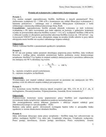 Nowy Dwór Mazowiecki, 14.10.2009 r. Pytania od wykonawców i odpowiedzi Zamawiającego Pytanie 1. Czy można zastąpić zaprojektowany biofiltr, biofiltrem o innych parametrach? Przy zachowaniu wydajności Q = 1500 n3/h z kontenerem (na wkład filtracyjny) wykonanym z laminatu poliestrowo - szklanego oraz z wkładem filtracyjnym wykonanym z torfu włóknistego z domieszką włókna kokosowego firmy Roth. Uzasadnienie: zaprojektowany biofiltr posiada zbiornik wykonany ze stali wyłożony wykładziną z PE takie rozwiązanie jest mało odporne na korozje; z gabarytów kontenera wynika że powierzchnia aktywna biofiltra wynosi = l 0 [ m2], wydajność biofiltra 1500 m3/h z obliczeń wynika iż obciążenie powierzchni aktywnej biofiltra wynosi ok. 150 m3/m2 - wg. wytycznych VDI3477 jest to max. obciążenie; mając na uwadze źródło odorów to przy takim obciążeniu może biofiltr nie uzyskać zakładanego stopnia redukcji. Odpowiedź: Należy wykonać biofiltr o parametrach zgodnych z projektem. Pytanie 2. W ST nie jest podany żaden parametr określający poprawną prace biofiltra. Jaka wielkość fizyczna i według jakiej metodyki pomiarowej będzie podstawą oceny dostarczonego urządzenia- biofiltra? Czy będzie to stopień redukcji zanieczyszczeń w powietrzu odlotowym nie mniejszy niż 90 % określany wg wzoru: ξ = Sp – Sz Sp x 100 % Sp - stężenie związków przed wentylatorem Sz - stężenie związków za biofiltrem Odpowiedź: Wystarczający jest stopień redukcji zanieczyszczeń na poziomie nie mniejszym niż 90% (podany wzór do obliczeń stopnia redukcji jest poprawny). Pytanie 3. Czy kryterium oceny biofiltra dotyczą takich związków jak: SO2, CO, H 2S, Σ C xHy, Σ mcrkaptanów, Dwumetyloantina, Trójmetyloamina, Amoniak, Kwas izomasłowy? Odpowiedź: Podstawowym kryterium oceny poprawności pracy biofiltra jest organoleptyczne stwierdzenie braku uciążliwości zapachowej podczas normalnej pracy. Dla uwiarygodnienia należy dokonać pomiarów i obliczyć stopień redukcji gazu charakterystycznego (w tym przypadku – H2S). Badanie całej palety gazów złowonnych wymagane będzie tylko w przypadku braku zgodności w ocenie skuteczności działania biofiltra. Pytanie 4. Jakie informacje dotyczące stanu pracy urządzenia - biofiltra mają być odwzorowane na tablicy zasilającej biofiltr? Czy takie jak; Urządzenie włączone, Urządzenie wyłączone, Praca pompy nawilżacza, Awaria pompy nawilżacza, Praca wentylatora, Awaria 1 Nowy Dwór Mazowiecki, 14.10.2009 r. wentylatora, Awaria - niski poziom wody w nawilżaczu, Awaria - wysoki poziom wody w nawilżaczu, Awaria - grzałki wanny nawilżacza, Awaria - grzałki rur wodnych Odpowiedź: Informacje o stanie pracy kompletnego biofiltra na lokalnej tablicy synoptycznej mają być zgodne z Projektem Wykonawczym (Tom I-Pompownia główna i biofiltr; Część 1.Technologia; punkt 4.2 ). Pytanie 5. Czy stan pracy urządzenia - biofiltra ma być odwzorowany w komputerowym systemie nadzoru i sterowania oczyszczalnią? Jeśli tak, to czy odwzorowane mają być wszystkie sygnały jakie są wymagane na tablicy zasilania w panelu sygnalizacyjnym, czy też mają być odwzorowane tak zwane alarmy lub stany pracy grupowe? Odpowiedź: W układzie zdalnego monitorowania biofiltra ma się znajdować odwzorowanie stanów: praca/awaria, zgodnie z Projektem Wykonawczym części AKPiA. Pytanie 6. Przykrycia dachowe mają być wykonane z laminatu; w SIWZ nie ma podanych parametrów oraz własności mechanicznych żywicy z jakiej ma być wykonany laminat ( z laminatu wykonuje się np.: brodziki czy kajaki), czy wobec powyższego Zamawiający będzie żądał aby producent przykryć dachowych posiadał Aprobatę techniczną na przedmiotowe przykrycia w myśl Ustawy Prawa Budowlanego? Odpowiedź: Zamawiający nie będzie wymagał aby producent przykryć dachowych posiadał Aprobatę techniczną na przedmiotowe przykrycia o ile dostarczone przykrycia stanowić będą indywidualne rozwiązanie techniczne i zostaną wykonane przez dostawcę wg indywidualnego projektu konstrukcyjnego. Uzupełnienie informacji o właściwościach i parametrach laminatu poliestrowo-szklanego. Warstwa laminatu od strony atmosfery winna charakteryzować się długotrwałą odpornością na działanie warunków atmosferycznych i promieni UV. Warstwa laminatu od strony wnętrza zbiornika winna charakteryzować się długotrwałą odpornością na działanie skroplin i związków występujących wewnątrz pomieszczenia pompowni. Kolor wg tablicy RAL, do uzgodnienia z Zamawiającym. Należy stosować żywicę poliestrową modyfikowaną na bazie DCPD, konstrukcyjną, średnioelastyczną, o podwyższonej odporności termicznej (>100°C), w wersji tiksotropowanej (zmniejszona ściekalność ze ścian pionowych). Żywica powinna nadawać się do produkcji laminatów poliestrowo - szklanych metodą ręczna i natryskową oraz posiadać parametry mechaniczne wg ISO (twardość Bracola – min. 450B, udarność - min. 7 kJ/m2). Pytanie 7. Projekt wykonawczy zakłada zakup pomp i mieszadeł rezerwowych. STWiOR oraz przedmiar robót nie uwzględniają zakupu pomp i mieszadeł rezerwowych. Prosimy o wyjaśnienie czy w wycenie robót należy ująć koszt urządzeń rezerwowych. 2 Nowy Dwór Mazowiecki, 14.10.2009 r. Odpowiedź: W wycenie należy ująć koszt urządzeń rezerwowych. Pytanie 8. W załączonej do SIWZ dokumentacji technicznej brak jest rysunków piaskowników ob. 3 i 3A oraz odtłuszczaczy ob. 6 i 6A. Prosimy o zamieszczenie dokumentacji technicznej ww. obiektów na stronie internetowej. Odpowiedź: Zamawiający nie posiada dokumentacji technicznej piaskowników oraz odtłuszczaczy. Zakres robót do wykonania wg Projektu Wykonawczego (Tom II-Obiekty oczyszczania ścieków; Część 1.-Technologia; punkt 4.3, 4.8 ). W przypadku wątpliwości co do zakresu zalecana jest wizja lokalna. Pytanie 9. Wg załączonej do SIWZ dokumentacji technicznej TOM II Obiekty oczyszczan