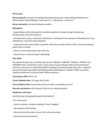 Oferta pracy Nazwa jednostki: Pracownia Technologii Wysokoprzepustowych, Instytut Biologii Molekularnej i Biotechnologii, Wydzial Biologii, Uniwersytet im. A . Mickiewicza w Poznaniu Nazwa stanowiska: pracownik badawczy-postdoc Wymagania: - stopień doktora (lub równoważnik) w dziedzinie biochemii, biologii, biologii molekularnej, biotechnologii, chemii lub medycyny - doświadczenie w pracy z hodowlami tkankowymi, transfekcją lini komórkowych, doświadczeniami typu nadekspresja i wyciszanie ekspresji genów - znajomość technik analizy białek i peptydów: elektroforeza białek, Western Blot, immunoprecypitacja, spektrometria masowa - wiedza na temat doświadczeń typu CHIP-seq - zaawansowana znajomość języka angielskiego Opis zadań: W projekcie skupiamy się na analizie pięciu genów TMEM213, TMEM207, TMEM116, TMEM72 oraz TMEM30B, które na podstawie analiz in silico opisuje się jako kodujące białka transmembranowe. Docelowo interesuje nas udział białek TMEM w etiologii jasnokomórkowego raka nerki, a zadaniami pracownika badawczego będzie identyfikacja białek oddziałujących z białkami TMEM oraz analiza szlaków komórkowych w których białka TMEM uczestniczą. Typ konkursu NCN: OPUS – NZ Termin składania ofert: 22 lutego 2016, 00:00 Forma składania ofert: pocztą elektroniczną na adres: [email protected] Warunki zatrudnienia: od 01 kwietnia 2016 na czas realizacji projektu Dodatkowe informacje: PRZYSTĘPUJĄC DO KONKURSU NALEŻY DOSTARCZYĆ: - list motywacyjny - życiorys naukowy z wykazem publikacji i innych osiągnięć - odpis dyplomu doktorskiego - referencje (2x) lub kontakt do osób, które referencji udzielą - własne informacje kontaktowe