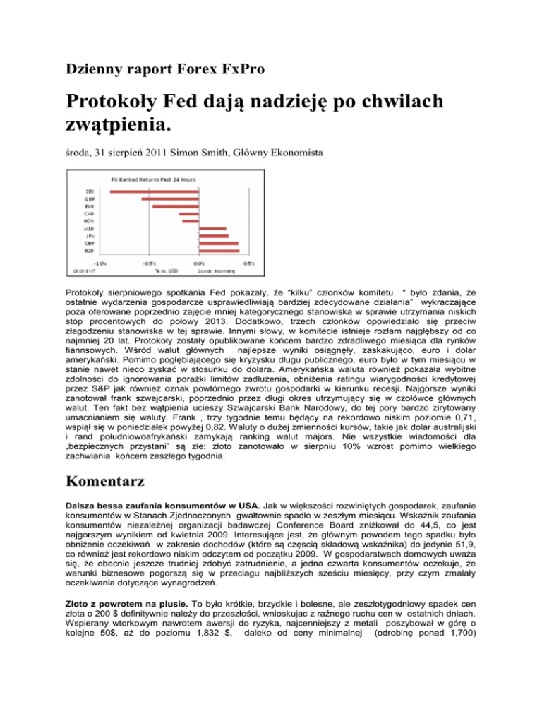 Dzienny raport Forex FxPro Protokoły Fed dają nadzieję po chwilach zwątpienia. środa, 31 sierpień 2011 Simon Smith, Główny Ekonomista Protokoły sierpniowego spotkania Fed pokazały, że “kilku” członków komitetu “ było zdania, że ostatnie wydarzenia gospodarcze usprawiedliwiają bardziej zdecydowane działania” wykraczające poza oferowane poprzednio zajęcie mniej kategorycznego stanowiska w sprawie utrzymania niskich stóp procentowych do połowy 2013. Dodatkowo, trzech członków opowiedziało się przeciw złagodzeniu stanowiska w tej sprawie. Innymi słowy, w komitecie istnieje rozłam najgłębszy od co najmniej 20 lat. Protokoły zostały opublikowane końcem bardzo zdradliwego miesiąca dla rynków fiannsowych. Wśród walut głównych najlepsze wyniki osiągnęły, zaskakująco, euro i dolar amerykański. Pomimo pogłębiającego się kryzysku długu publicznego, euro było w tym miesiącu w stanie nawet nieco zyskać w stosunku do dolara. Amerykańska waluta również pokazała wybitne zdolności do ignorowania porażki limitów zadłużenia, obniżenia ratingu wiarygodności kredytowej przez S&P jak również oznak powtórnego zwrotu gospodarki w kierunku recesji. Najgorsze wyniki zanotował frank szwajcarski, poprzednio przez długi okres utrzymujący się w czołówce głównych walut. Ten fakt bez wątpienia ucieszy Szwajcarski Bank Narodowy, do tej pory bardzo zirytowany umacnianiem się waluty. Frank , trzy tygodnie temu będący na rekordowo niskim poziomie 0,71, wspiął się w poniedziałek powyżej 0,82. Waluty o dużej zmienności kursów, takie jak dolar australijski i rand południowoafrykański zamykają ranking walut majors. Nie wszystkie wiadomości dla „bezpiecznych przystani” są złe: złoto zanotowało w sierpniu 10% wzrost pomimo wielkiego zachwiania końcem zeszłego tygodnia. Komentarz Dalsza bessa zaufania konsumentów w USA. Jak w większości rozwiniętych gospodarek, zaufanie konsumentów w Stanach Zjednoczonych gwałtownie spadło w zeszłym miesiącu. Wskaźnik zaufania konsumentów niezależnej organizacji badawczej Conference Board zniżkował do 44,5, co jest najgorszym wynikiem od kwietnia 2009. Interesujące jest, że głównym powodem tego spadku było obniżenie oczekiwań w zakresie dochodów (które są częscią składową wskaźnika) do jedynie 51,9, co również jest rekordowo niskim odczytem od początku 2009. W gospodarstwach domowych uważa się, że obecnie jeszcze trudniej zdobyć zatrudnienie, a jedna czwarta konsumentów oczekuje, że warunki biznesowe pogorszą się w przeciagu najbliższych sześciu miesięcy, przy czym zmalały oczekiwania dotyczące wynagrodzeń. Złoto z powrotem na plusie. To było krótkie, brzydkie i bolesne, ale zeszłotygodniowy spadek cen złota o 200 $ definitywnie należy do przeszłości, wnioskujac z raźnego ruchu cen w ostatnich dniach. Wspierany wtorkowym nawrotem awersji do ryzyka, najcenniejszy z metali poszybował w górę o kolejne 50$, aż do poziomu 1,832 $, daleko od ceny minimalnej (odrobinę ponad 1,700) zanotowanej w zeszły czwartek. Złotu pomógł również komentarz Prezesa Fed w Chicago Evansa, który oznajmił, że popiera dalsze luzowanie ilościowe. Berlusconi wycofuje się z oszczędności. Po długim, siedmiogodzinnym spotkaniu z członkami Ligi Północnej (partner koalicyjny) Berlusconi zgodził się porzucić swój poprzedni 45miliardowy plan oszczędnościowy. Znikły obietnice podniesienia podatku dla najbogatszych, nie będzie także podwyżki VATu rekompesującej straty w dochodzie państwowym, a wydatki zostaną zmniejszone jedynie na poziomie regionalnym (i nawet na tym poziomie cięcia będą ograniczone). Europejski Bank Centralny, który zażądał od Włoch wprowadzenia pierwotnej wersji pakietu oszczędnościowego, jako warunku wykupu ich obligacji w ramach programu ratunkowego (Securities Markets Program) bez wątpienia będzie zaniepokojony decyzją premiera. W odpowiedzi 10letnie obligacje rządu Włoch spadły dzisiejszego ranka o ponad 10 pkt bazowych w stosunku do analogicznych niemieckich papierów. Euro dryfuje w kierunku ceny minimalnej na koniec miesiąca. W poniedziałek euro dzielnie walczyło o utrzymanie się ponad poziomem 1,45, ale wczoraj wpadło w nową wyprzedaż, która zepchnęła je nawet poniżej 1,44. Nastrojom nie pomogło ostrzeżenie od wyższego urzędnika centralnego banku Włoch (Banca d’Italia), że gospodarka zanotowała niższy wzrost, co zaważy na deficycie budżetowym. Urzędnik UE ostrzegł z kolei przed zagrożeniem drugim dnem recesji. Według ankiety przeprowadzonej przez Komisję Europejską zaufanie do prognoz ekonomicznych w strefie euro mocno spadło w tym miesiącu. Rosną również obawy, że Angela Merkel, która napotkała wiele problemów w kwestii przekonania swoich partyjnych kolegów i partnerów koalicyjnych do zaakceptowania roszerzonych komeptencji Europejskiego Funduszu Stabilności Finansowej (EFSF), a zwłaszcza pozwolenia mu na rekapitalizację zaniepokojonych europejskich banków. Problem znalazł się w centrum uwagi po stwierdzeniu szefowej Międzynarodowego Funduszu Monetarnego Christine Lagarde, że europejskie banki pilnie potrzebują rekapitalizacji. Dla euro poziom 1,45 był bardzo trudny do osiągnięcia w ciągu ostatnich czterech miesięcy, ale z drugiej strony 1,40 dał europejskiej walucie równe silne wsparcie. Możemy oczekiwać, że euro przełamie ten bardzo wąski przedział cenowy w przeciągu następnych tygodni, kiedy po letniej przerwie płynność powróci na rynki. Rozszerzenie oddłużenia na sektor korporacyjny w Wielkiej Brytanii. W czasie bezprecedensowego oddłużenia zarówno w sektorze gospodarstw domowych jak i sektorze publicznym pojawiły się wiadomości, że sektor korporacyjny również został zaangażowany w to działanie. Według badań przeprowadzonych przez Capital IQ, skumulowany dług netto firm działu niefinansowego należących do i