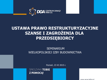 USTAWA PRAWO RESTRUKTURYZACYJNE SZANSE I ZAGROŻENIA DLA PRZEDSIĘBIORCY SEMINARIUM WIELKOPOLSKIEJ IZBY BUDOWNICTWA Poznań, 23 XI 2015 r. ZAKRES TEMATYCZNY SEMINARIUM 1. Prawo restrukturyzacyjne – założenia ustawy, procedury naprawcze. 2. Sytuacja dłużnika i wierzyciela po otwarciu postępowania restrukturyzacyjnego. 3. Dobre praktyki: kto i kiedy może skorzystać z ustawy Prawo restrukturyzacyjne. 4. Zmiany w ustawie Prawo upadłościowe. Seminarium prowadzi: Andrzej Głowacki - licencjonowany doradca restrukturyzacyjny. KAMIENIE MILOWE NA DZISIAJ 1. Dlaczego ustawa Prawo upadłościowe i naprawcze poniosła klęskę ? 2. Prawo upadłościowe w nowej odsłonie. 3. Koncepcja ustawy Prawo restrukturyzacyjne. 4. Kto, kiedy i w jakim celu składa wniosek o otwarcie postępowania restrukturyzacyjnego ? 5. Kluczowe pojęcia i dokumenty dotyczące ustawy Prawo restrukturyzacyjne 6. Postępowania restrukturyzacyjne. 7. Recepta na sukces ustawy Prawo restrukturyzacyjne. DLACZEGO USTAWA PRAWO UPADŁOŚCIOWE I NAPRAWCZE PONIOSŁA KLĘSKĘ ? LICZBA PRZEDSIĘBIORSTW W POLSCE Dane za rok 2013 Duże: 3.218 Średnie: 15.329 Małe: 59.128 Mikro: 1.693.785 Co roku w Polsce rozpoczyna i kończy działalność 300.000 – 350.000 podmiotów gospodarczych. WSPARCIE FIRM - DOTYCHCZAS WSPARCIE DLA FIRM - STATYSTYKA STATYSTYKA JEDNEGO Z WYDZIAŁÓW UPADŁOŚCIOWYCH OKRES Liczba wniosków o ogłoszenie upadłości likwidacyjnej układowej konsumenckiej 2010-2014 383 31 79 I półrocze 2015 43 4 89 Razem 426 35 168 WYNIKI POSTĘPOWAŃ UKŁADOWYCH Postanowienia Sądu 2010 – I p. 2015 ogłoszenie upadłości układowej ogłoszenie upadłości likwidacyjnej oddalenie wniosku zwrot wniosku Razem 11 10 5 9 35 WYNIKI POSTĘPOWAŃ UKŁADOWYCH Z ogłoszonych 11 upadłości z możliwością zawarcia układu wyniki postępowania są następujące: 0 2 7 2 przedsiębiorców pomyślnie zakończyło postępowanie i spłaciło wierzycieli. postępowania umorzono. razy została zmieniona opcja na upadłość likwidacyjną. postępowania są toku. PRZYCZYNY FIASKA POSTĘPOWAŃ UKŁADOWYCH Wnioski wynikające z analizy postanowień sądu: Część wniosków niekompletna. Niewypłacalność wnioskodawców i brak możliwości odbudowania firm. Wnioski wynikające z analizy planów naprawczych: Wnioski składane zbyt późno Spłata układu z przyszłych zysków. Restrukturyzacja firmy ograniczona do redukcji niektórych kosztów i przede wszystkim zobowiązań. NOWY ŚWIAT SANACJI FIRM od 1 stycznia 2016 r. PRAWO UPADŁOŚCIOWE W NOWEJ ODSŁONIE PRAWO UPADŁOŚCIOWE Definicja niewypłacalności art. 11 PU utrata zdolności do wykonywania swoich wymagalnych zobowiązań pieniężnych. opóźnienie przekracza 3 miesiące zobowiązania nie dotyczą wierzytelności spornych dla osób prawnych – dodatkowo: zobowiązania przekraczają wartość majątku, a stan ten trwa 24 miesiące JEDEN MIESIĄC NA ZŁOŻENIE WNIOSKU O OGŁOSZENIE UPADŁOŚCI. PRZYGOTOWANA LIKWIDACJA – PRE-PACK art. 56a-56h 1. Do wniosku o ogłoszenie upadłości dołącza się: - opis i oszacowanie składnika/przedsiębiorstwa objętego wnioskiem - warunki sprzedaży: cena i nabywca, ew. projekt umowy 2. Cena winna być wyższa niż kwota możliwa do uzyskania w postępowaniu upadłościowym 3. Zażalenie na postanowienie uwzględniające wniosek może wnieść każdy wierzyciel w terminie tygodnia od dnia obwieszczenia w rejestrze. PRZYGOTOWANA LIKWIDACJA – PRE-PACK Zalety: - Kontynuacja działalności przedsiębiorstwa - Minimalizacja kosztów postępowania - Szybkie zaspokojenie wierzycieli Wady: - Zagrożenie zaniżania wyceny przedsiębiorstwa - Krótki okres na składanie zażalenia - Brak rynku niektórych aktywów – subiektywna wycena - Brak racjonalności biznesowej rozwiązania (niekiedy) UPADŁOŚĆ KONSUMENCKA OD 01/01/2016 art. 4911 – 49123 PU 1. Wniosek o ogłoszenie upadłości można składać: - gdy nie ma oznak umyślności lub rażącego niedbalstwa także przy braku środków na koszty postępowania przy co najmniej jednym wierzycielu gdy działalność gospodarcza została wyrejestrowana 2. Plan spłaty zobowiązań (do 36 m-cy), a następnie umorzenie zobowiązań. 3. Przy braku zdolności do dokonania jakichkolwiek spłat, Sąd umarza zobowiązania bez ustalenia planu spłaty. KONCEPCJA USTAWY PRAWO RESTRUKTURYZACYJNE KONCEPCJA BIZNESOWA USTAWY PRAWO RESTRUKTURYZACYJNE I. II. III. Przedsiębiorca znajduje się w sytuacji kryzysowej, własne starania kończą się fiaskiem zmiany sytuacji. Wybór jednej z czterech procedur naprawczych. Wsparcie doradcy restrukturyzacyjnego. Sąd otwiera postępowanie restrukturyzacyjne. Ciężar przeprowadzenia postępowania spoczywa na dłużniku i doradcy restrukturyzacyjnym. Zagrożenie niewypłacalnością Diagnoza Wybór procedury Wniosek Otwarcie postępowania Doradca restrukturyzacyjny PLAN RESTRUKTURYZACYJNY Zarząd+ doradca restrukturyzacyjny KONCEPCJA SPOŁECZNA USTAWY PRAWO RESTRUKTURYZACYJNE I. NIE BĘDZIESZ BANKRUTEM! II. SĄDY BĘDĄ SPRAWNE, A DORADCY RESTRUKTURYZACYJNI WYNAGRADZANI MOTYWACYJNIE. III. WIERZYCIELU – MUSISZ BYĆ AKTYWNY! IV. CENTRALNY REJESTR RESTRUKTURYZACJI I UPADŁOŚCI – CAŁA WIEDZA W INTERNECIE. 20% „NADRZĘDNOŚĆ” USTAWY PRAWO RESTRUKTURYZACYJNE art. 11-13 PR WNIOSEK RESTRUKTURYZACYJNY WNIOSEK O OGŁOSZENIE UPADŁOŚCI SĄD ROZPOZNAJE W PIERWSZEJ KOLEJNOŚCI SĄD UPADŁOŚCIOWY WSTRZYMUJE ROZPOZNANIE WNIOSKU O OGŁOSZENIE UPADŁOŚCI DO CZASU WYDANIA ORZECZENIA W SPRAWIE WNIOSKU RESTRUKTURYZACYJNEGO. NADRZĘDNY CEL USTAWY PRAWO RESTRUKTURYZACYJNE „Celem postępowania restrukturyzacyjnego jest uniknięcie ogłoszenia upadłości przedsiębiorcy przez: - umożliwienie mu restrukturyzacji w drodze zawarcia układu z wierzycielami, a w przypadku postępowania sanacyjnego przez: – przeprowadzenie działań sanacyjnych przy zabezpieczeniu słusznych praw wierzycieli. art.3 ustawy RESTRUKTURYZACJA BIZNESOWA DEFINICJE I. Plan działań restrukturyzacy