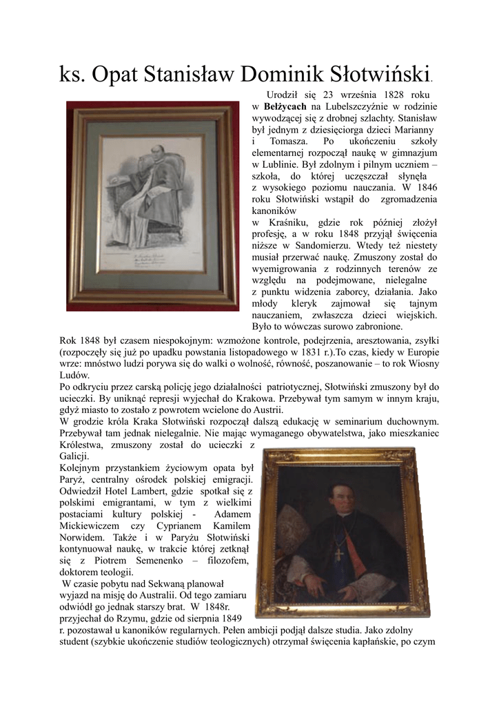 ks. Opat Stanisław Dominik Słotwiński. Urodził się 23 września 1828 roku w Bełżycach na Lubelszczyźnie w rodzinie wywodzącej się z drobnej szlachty. Stanisław był jednym z dziesięciorga dzieci Marianny i Tomasza. Po ukończeniu szkoły elementarnej rozpoczął naukę w gimnazjum w Lublinie. Był zdolnym i pilnym uczniem – szkoła, do której uczęszczał słynęła z wysokiego poziomu nauczania. W 1846 roku Słotwiński wstąpił do zgromadzenia kanoników w Kraśniku, gdzie rok później złożył profesję, a w roku 1848 przyjął święcenia niższe w Sandomierzu. Wtedy też niestety musiał przerwać naukę. Zmuszony został do wyemigrowania z rodzinnych terenów ze względu na podejmowane, nielegalne z punktu widzenia zaborcy, działania. Jako młody kleryk zajmował się tajnym nauczaniem, zwłaszcza dzieci wiejskich. Było to wówczas surowo zabronione. Rok 1848 był czasem niespokojnym: wzmożone kontrole, podejrzenia, aresztowania, zsyłki (rozpoczęły się już po upadku powstania listopadowego w 1831 r.).To czas, kiedy w Europie wrze: mnóstwo ludzi porywa się do walki o wolność, równość, poszanowanie – to rok Wiosny Ludów. Po odkryciu przez carską policję jego działalności patriotycznej, Słotwiński zmuszony był do ucieczki. By uniknąć represji wyjechał do Krakowa. Przebywał tym samym w innym kraju, gdyż miasto to zostało z powrotem wcielone do Austrii. W grodzie króla Kraka Słotwiński rozpoczął dalszą edukację w seminarium duchownym. Przebywał tam jednak nielegalnie. Nie mając wymaganego obywatelstwa, jako mieszkaniec Królestwa, zmuszony został do ucieczki z Galicji. Kolejnym przystankiem życiowym opata był Paryż, centralny ośrodek polskiej emigracji. Odwiedził Hotel Lambert, gdzie spotkał się z polskimi emigrantami, w tym z wielkimi postaciami kultury polskiej Adamem Mickiewiczem czy Cyprianem Kamilem Norwidem. Także i w Paryżu Słotwiński kontynuował naukę, w trakcie której zetknął się z Piotrem Semenenko – filozofem, doktorem teologii. W czasie pobytu nad Sekwaną planował wyjazd na misję do Australii. Od tego zamiaru odwiódł go jednak starszy brat. W 1848r. przyjechał do Rzymu, gdzie od sierpnia 1849 r. pozostawał u kanoników regularnych. Pełen ambicji podjął dalsze studia. Jako zdolny student (szybkie ukończenie studiów teologicznych) otrzymał święcenia kapłańskie, po czym został profesorem w kolegium zakonnym i magistrem kleryków w klasztorze kanonickim przy kościele św. Piotra w Okowach. Ks. Stanisław nie był anonimową osobą w Wiecznym Mieście. Jako doskonały retor został zauważony przez ówczesnego papieża - Piusa IX. Zaprosił on Słotwińskiego do Watykanu. Jego popularność w Rzymie rosła. Przykuwał swoją uwagę doskonałą grą na skrzypcach, piękną recytacją wierszy (także własnych) czy kaznodziejstwem. Ponadto, wzorując się na Paryżu, założył we Włoszech ośrodek pomocy dla polskich artystów. Niezależny od niego przebieg wypadków sprawił, że Słotwiński musiał jednak wracać do kraju. Został mianowany przełożonym klasztoru Bożego Ciała. W tym czasie w klasztorze narastały pewne konflikty, które Słotwiński miał zażegnać. Z tego samego powodu obowiązki przełożonego objął dopiero w maju 1857roku, by sprawować je przez 36 lat. Charakterystyczna charyzma Słotwińskiego i jego zapał nie zanikły. Z klasztoru usunął stacjonujące wojsko oraz przytułek dla ubogich prowadzony przez Towarzystwo Dobroczynności. Starał się pozyskać należne kanonikom świadczenia oraz spłacić wysokie długi. Ponadto podjął remont zaniedbanego klasztoru i kościoła oraz budowę trzech kamienic czynszowych. Choć nie zawsze był akceptowany przez zakonników, został doceniony przez kurię i parafian. Trud Słotwińskiego nie poszedł na marne. W 1861 r. Klasztor Bożego ciała podniesiono do godności opactwa a trzydziestotrzyletni Słotwiński został jego pierwszym opatem. Poprzeczkę wciąż stawiał sobie wysoko, bo chociaż mieszkał i pracował w Krakowie, dbał równocześnie o inne klasztory kanonickie w Wilnie, Kwaśniku czy Wolbromiu. Po wizycie u jezuitów w Starej Wsi także z nimi podjął współpracę. Zaprosił do Krakowa, odstąpił kamienicę i włączył zakonników do pracy duszpasterskiej parafii krakowskiej. Nauki pobierane jeszcze w Paryżu odcisnęły na opacie swe piętna. Słotwiński był przeciwnikiem zbrojnego wyzwolenia Polski. Drogi odzyskania niepodległości czy szerzenia polskości upatrywał w katolicyzmie: w czynnym udziale w obrzędach religijnych, w posłudze duszpasterskiej, prowadzeniu ośrodków wychowawczych czy wydawnictw religijnych. Stąd też jego krakowskie decyzje – m. in. poparcie nominacji bp. Antoniego Gołeckiego, określanego mianem „Wielkiego Austriaka”. Podobne decyzje doprowadziły jednak do kolejnych konfliktów ze wspólnotą. Z tego powodu w 1869 roku Słotwiński poprosił o urlop, co generalny opat Alberto Passeri zinterpretował jako oficjalne złożenie urzędu. Nieporozumienie przyczyniło się do oderwania - w roku 1870 - klasztoru od kongregacji włoskiej i oddanie go pod jurysdykcję biskupa Gałeckiego. Słotwiński, jako ciesząca się ogromną popularnością w kręgu kościelnych osobistość uczestniczył w wielu poważnych uroczystościach i przedsięwzięciach. Wymienić tu należy: koronację obrazów dominikanów w Borku Starym u Karmelitów w Krakowie i bernardynów w Kalwarii Zebrzydowskiej, w 1904r wziął też udział w pierwszym Polskim Kongresie Mariańskim. Przez cały czas utrzymywał serdeczny kontakt z prowadzącymi szkoły czy zakłady dla młodzieży, zakonami żeńskimi powołanymi przez siostry miłosierdzia. Pomagał i wspierał gorzej sytuowane krakowskie klasztory (np. wysyłał im żywność). Jego praca i zaangażowanie w oświatę, propagowanie nowego typu nabożeństw oraz współpraca z takimi organizacjami, jak: Towarzystwo Dobroczynnośc