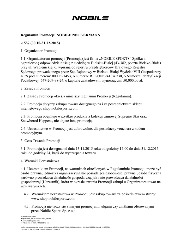 Regulamin Promocji: NOBILE NECKERMANN -15% (30.10-31.12.2015) 1. Organizator Promocji 1.1. Organizatorem promocji (Promocja) jest firma „NOBILE SPORTS” Spółka z ograniczoną odpowiedzialnością z siedzibą w Bielsku-Białej (43-382, poczta Bielsko-Biała) przy ul. Wapienickiej 6, wpisaną do rejestru przedsiębiorców Krajowego Rejestru Sądowego prowadzonego przez Sąd Rejonowy w Bielsku-Białej Wydział VIII Gospodarczy KRS pod numerem: 0000321453, o numerze REGON: 241076730, o Numerze Identyfikacji Podatkowej: 547-209-98-24, o kapitale zakładowym wynoszącym: 50.000,00 zł. 2. Zasady Promocji 2.1. Zasady Promocji określa niniejszy regulamin Promocji (Regulamin). 2.2. Promocja dotyczy zakupu towaru dostępnego na i za pośrednictwem sklepu internetowego shop.nobilesports.com 2.3. Promocja obejmuje wszystkie produkty z kolekcji zimowej Supreme Skis oraz Snowboard Happens, nie objete inną promocją. 2.4. Uczestnictwo w Promocji jest dobrowolne, dla posiadaczy vouchera z kodem promocyjnym. 3. Czas Trwania Promocji 3.1. Promocja jest dostępna od dnia 13.11.2015 roku od godziny 14:00 do dnia 31.12.2015 roku do godziny 24, bądź do wyczerpania towaru. 4. Warunki Uczestnictwa 4.1. Uczestnikiem Promocji, na warunkach określonych w Regulaminie Promocji, może być osoba prawna, jednostka organizacyjna nie posiadająca osobowości prawnej, osoba fizyczna zarówno prowadząca działalność gospodarczą, jak i nie prowadząca działalności gospodarczej (Uczestnik), która w okresie trwania Promocji zakupi u Organizatora towar na w/w warunkach. 4.2. Warunkiem uczestnictwa w Promocji jest zakup towaru za pośrednictwem strony: www.shop.nobilesports.com 4.3. Promocja nie łączy się z innymi promocjami, ulgami czy zniżkami oferowanymi przez Nobile Sports Sp. z o.o. NOBILE nature.made. Wapienicka 6, 43-382 Bielsko Biała, Poland W. www.nobilesports.com T. +48 33 822 42 40, F. +48 33 81 62 423 Spolka zarejestrowana w Sadzie Rejonowym w Bielsku-Bialej; VIII Wydzial Gospodarczy KRS 0000321453; REGON: 241076730; TIN / NIP: PL 5472099824; Kapital zakladowy: 50.000 zl 4.4 Promocja dostępna dla posiadaczy kodu promocyjnego. 5. Kody promocyjne 5.1. Klient, który poprzez stronę internetową www.neckermann.pl zakupi imprezę z dojazdem własnym, spełniającą poniższe warunki: sezon – zima (W16) katalog – dojazd własny (AUTO) czas założenia rezerwacji - od 13.11.2015 do 31.12.2015 Otrzyma dodatkowo kod promocyjny, uprawniający do uzyskania rabatu w sklepie internetowym shop.nobilesports.com 5.2. Kod promocyjny wysyłany jest drogą mailową, w treści maila potwierdzającego rezerwację założoną na stronie www.neckermann.pl, na adres mailowy podany w formularzu rezerwacyjnym. 5.3. Do każdej rezerwacji dokonanej w ramach i terminie promocji przyznawany jest 1 kod. 6. Reklamacje 6.1. Wszystkie reklamacje należy zgłaszać́ na adres e-mail: [email protected] 7. Postanowienia końcowe 7.1. Regulamin Promocji może ulec zmianie w czasie jej trwania, przy czym zmiany w Regulaminie nie mogą naruszać praw nabytych przez Uczestników Promocji przed dokonaniem zmiany. Zmiany Regulaminu obowiązują od dnia zamieszczenia zmienionego Regulaminu na stronie internetowej www.shop.nobilesports.com 7.2. Regulamin Promocji wchodzi w życie z dniem 13.11.2015 r. 7.3. Skorzystanie z Promocji wymaga akceptacji Regulaminu. 7.4. Niniejszy Regulamin jest dostępny na stronie internetowej www.shop.nobilesports.com i stronie http://neckermann.pl/lp/nobile/ NOBILE nature.made. Wapienicka 6, 43-382 Bielsko Biała, Poland W. www.nobilesports.com T. +48 33 822 42 40, F. +48 33 81 62 423 Spolka zarejestrowana w Sadzie Rejonowym w Bielsku-Bialej; VIII Wydzial Gospodarczy KRS 0000321453; REGON: 241076730; TIN / NIP: PL 5472099824; Kapital zakladowy: 50.000 zl