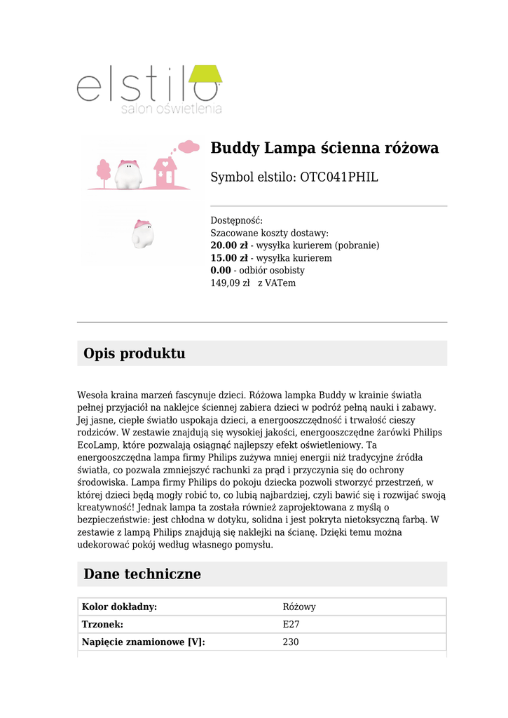 Buddy Lampa ścienna różowa Symbol elstilo: OTC041PHIL Dostępność: Szacowane koszty dostawy: 20.00 zł - wysyłka kurierem (pobranie) 15.00 zł - wysyłka kurierem 0.00 - odbiór osobisty 149,09 zł z VATem Opis produktu Wesoła kraina marzeń fascynuje dzieci. Różowa lampka Buddy w krainie światła pełnej przyjaciół na naklejce ściennej zabiera dzieci w podróż pełną nauki i zabawy. Jej jasne, ciepłe światło uspokaja dzieci, a energooszczędność i trwałość cieszy rodziców. W zestawie znajdują się wysokiej jakości, energooszczędne żarówki Philips EcoLamp, które pozwalają osiągnąć najlepszy efekt oświetleniowy. Ta energooszczędna lampa firmy Philips zużywa mniej energii niż tradycyjne źródła światła, co pozwala zmniejszyć rachunki za prąd i przyczynia się do ochrony środowiska. Lampa firmy Philips do pokoju dziecka pozwoli stworzyć przestrzeń, w której dzieci będą mogły robić to, co lubią najbardziej, czyli bawić się i rozwijać swoją kreatywność! Jednak lampa ta została również zaprojektowana z myślą o bezpieczeństwie: jest chłodna w dotyku, solidna i jest pokryta nietoksyczną farbą. W zestawie z lampą Philips znajdują się naklejki na ścianę. Dzięki temu można udekorować pokój według własnego pomysłu. Dane techniczne Kolor dokładny: Różowy Trzonek: E27 Napięcie znamionowe [V]: 230 Źródło światła w zestawie: Tak Źródło światła: Świetlówka Typ: Ścienne Rodzina: Buddy Rodzaj: Dziecięce Moc [W]: 15 Kolor: Czerwony EEL - klasa energetyczna żarówki: A