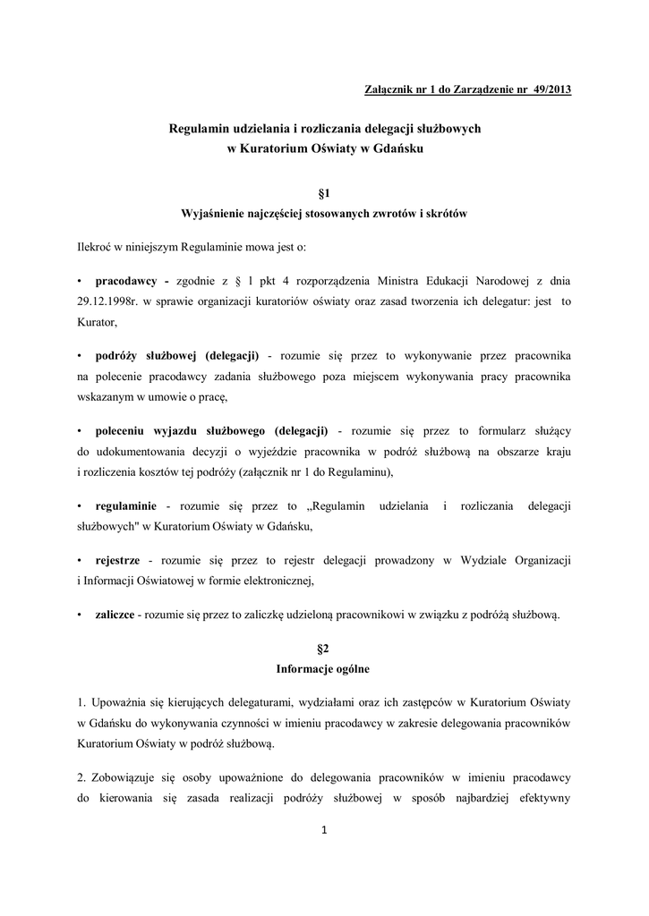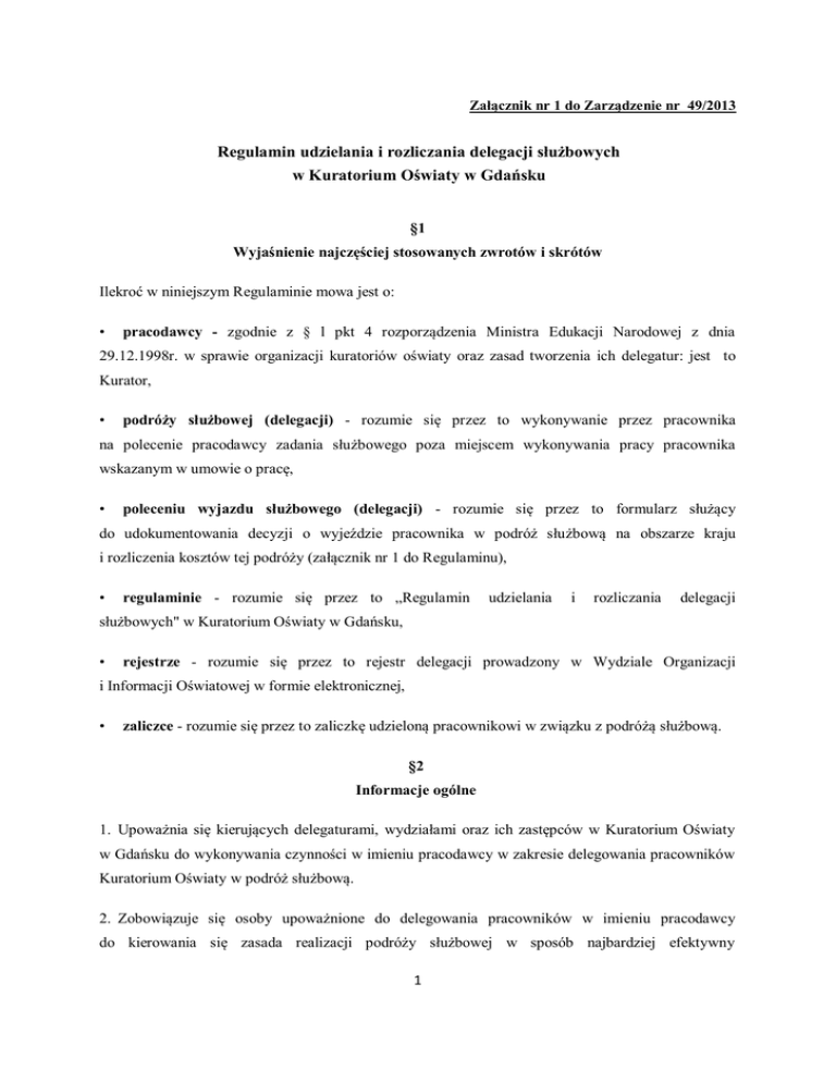 Załącznik nr 1 do Zarządzenie nr 49/2013 Regulamin udzielania i rozliczania delegacji służbowych w Kuratorium Oświaty w Gdańsku §1 Wyjaśnienie najczęściej stosowanych zwrotów i skrótów Ilekroć w niniejszym Regulaminie mowa jest o: • pracodawcy - zgodnie z § l pkt 4 rozporządzenia Ministra Edukacji Narodowej z dnia 29.12.1998r. w sprawie organizacji kuratoriów oświaty oraz zasad tworzenia ich delegatur: jest to Kurator, • podróży służbowej (delegacji) - rozumie się przez to wykonywanie przez pracownika na polecenie pracodawcy zadania służbowego poza miejscem wykonywania pracy pracownika wskazanym w umowie o pracę, • poleceniu wyjazdu służbowego (delegacji) - rozumie się przez to formularz służący do udokumentowania decyzji o wyjeździe pracownika w podróż służbową na obszarze kraju i rozliczenia kosztów tej podróży (załącznik nr 1 do Regulaminu), • regulaminie - rozumie się przez to „Regulamin udzielania i rozliczania delegacji służbowych" w Kuratorium Oświaty w Gdańsku, • rejestrze - rozumie się przez to rejestr delegacji prowadzony w Wydziale Organizacji i Informacji Oświatowej w formie elektronicznej, • zaliczce - rozumie się przez to zaliczkę udzieloną pracownikowi w związku z podróżą służbową. §2 Informacje ogólne 1. Upoważnia się kierujących delegaturami, wydziałami oraz ich zastępców w Kuratorium Oświaty w Gdańsku do wykonywania czynności w imieniu pracodawcy w zakresie delegowania pracowników Kuratorium Oświaty w podróż służbową. 2. Zobowiązuje się osoby upoważnione do delegowania pracowników w imieniu pracodawcy do kierowania się zasada realizacji podróży służbowej w sposób najbardziej efektywny 1 i ekonomiczny z punktu widzenia Kuratorium Oświaty w Gdańsku. 3. Polecenie wyjazdu służbowego musi być wydane pisemnie na druku „polecenie wyjazdu służbowego” przez Pracodawcę przed rozpoczęciem podróży służbowej. 4. Pracodawca wskazuje w poleceniu wyjazdu służbowego przede wszystkim: a) czas trwania wyjazdu (od………. do………..), b) cel wyjazdu, c) środek transportu, a także jego rodzaj i klasę, d) miejscowość rozpoczęcia i zakończenia podróży. 5. Cel wyjazdu służbowego musi być zgodny z celami jednostki. 6. Pracownik Wydziału / Delegatury odnotowuje termin oddelegowania pracownika na liście obecności. §3 Rejestr delegacji 1. Pracownik Wydziału Organizacji i Informacji Oświatowej prowadzi rejestr delegacji, według wzoru określonego w załączniku nr 2 do Regulaminu. 2. Rejestr delegacji powinien być aktualny i kompletny. 3. Numer oraz inne informacje zamieszczone na druku delegacji muszą być zgodne z danymi ujętymi w rejestrze. 4. W przypadku anulowania wcześniej zatwierdzonej delegacji pracownik Wydziału Organizacji i Informacji Oświatowej zobowiązany jest przekreślić druk delegacji, potwierdzić fakt anulowania własnoręcznym podpisem i datą oraz umieścić na druku delegacji i w rejestrze delegacji słowo „anulowano". 5. Druki delegacji anulowanych powinny być przechowywane w Wydziale Organizacji i Informacji Oświatowej jako załączniki do rejestru delegacji. 6. W przypadku, gdy pracownik nie ponosi kosztów związanych z podróżą służbową (np. jazda samochodem służbowym, wykonywanie czynności służbowych w miejscu zamieszkania itp.) 2 - dokument delegacji przekazuje do Wydziału Organizacji i Informacji Oświatowej. 7. Delegacja jest potwierdzeniem nieobecności pracownika w pracy i powinna być przechowywana w Wydziale Organizacji i Informacji Oświatowej jako załączniki do rejestru delegacji. §4 Udzielanie i rozliczanie zaliczek 1. Pracownik może otrzymać zaliczkę na pokrycie kosztów podróży służbowej. 2. Podstawą otrzymania przez pracownika zaliczki jest przedstawienie w Zespole Finansowo Księgowym polecenia wyjazdu służbowego, zatwierdzonego przez Pracodawcę wraz z zatwierdzonym przez Głównego Księgowego i Kuratora wnioskiem o zaliczkę (dolna część druku polecenie wyjazdu służbowego). 3. Kwotę zaliczki określa delegowany pracownik. 4. Pracownik jest zobowiązany do rozliczenia zaliczki w terminie 7 dni po zakończeniu podróży służbowej. 5. Zaliczkę na podróż służbową udzieloną pod koniec roku budżetowego należy rozliczyć nie później niż do dnia 29 grudnia każdego roku. 6. Pracownik, który nie rozliczył się z pobranej zaliczki nie ma prawa do uzyskania kolejnej zaliczki. §5 Udokumentowanie kosztów podróży służbowej 1. Podstawowymi środkami lokomocji podczas odbywania podróży służbowych są: autobus PKS, pociąg osobowy zwykły oraz pociąg pospieszny (II klasa) lub inny środek publicznego transportu zbiorowego. 2. Na wniosek pracownika Kurator może wyrazić zgodę na przejazd samochodem osobowym, nie będącym własnością pracodawcy. 3. Pracodawca zawiera z pracownikiem używającym samochodu prywatnego do podróży służbowej umowę cywilnoprawną wg wzoru określonego w załączniku nr 3 do Regulaminu. 4. W przypadkach, o których mowa w ust. 2, pracownikowi przysługuje zwrot kosztów przejazdu w wysokości stanowiącej iloczyn przejechanych kilometrów przez stawkę za jeden kilometr przebiegu, ustaloną przez pracodawcę, w drodze odrębnego zarządzenia, która nie może być 3 wyższa niż. określona w przepisach wydanych na podstawie art. 34a ust. 2 ustawy z dnia 6 września 2001 r. o transporcie drogowym (Dz. U. z 2012 r. póz. 12650). 5. Jeżeli pracownik odbył podróż służbową innym środkiem lokomocji niż wskazany przez pracodawcę na poleceniu wyjazdu, jest zobowiązany pisemnie uzasadnić powód dokonanej zmiany oraz uzyskać zgodę Pracodawcy na udokumentowanie wyjazdu za pomocą dowodów zastępczych, według wzoru określonego w załączniku nr 4 do Regulaminu. §6 Rozliczanie delegacji 1. Delegację należy rozliczyć w terminie nie dłuższym niż 14 dni od dnia zakończenia podróży służbowej. 2. Pracownik dokładni