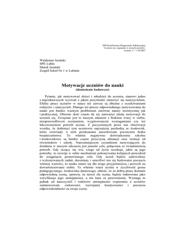 XIII Konferencja Diagnostyki Edukacyjnej Uczenie się i egzamin w oczach uczniów. Łomża, 5 - 7.10.2007 Waldemar Jasiński SPE Lubin Marek Jasiński Zespół Szkół Nr 1 w Lubinie Motywacje uczniów do nauki (doniesienie badawcze) Pytanie, jak motywować dzieci i młodzież do uczenia, stanowi jedno z najciekawszych wyzwań z jakim przychodzi zmierzyć się nauczycielom. Efekty pracy uczniów w nauce nie zawsze są zbieżne z oczekiwaniami rodziców i nauczycieli. Dlatego też proces odpowiedniego motywowania do nauki jest bardzo ważnym problemem zarówno natury teoretycznej jak i praktycznej. Obecnie dość często da się zauważyć utratę motywacji do uczenia się. Związane jest to naszym zdaniem z brakiem wiary w siebie, niesprawiedliwym ocenianiem, wygórowanymi wymaganiami czy też lekceważeniem potrzeb ucznia. Z poczynionych przez nas obserwacji wynika, że dotknięci tym uczniowie najczęściej pochodzą ze środowisk, które rozwinęły u nich przekonania nacechowane poczuciem braku bezpieczeństwa. To właśnie negatywne doświadczenia szkolne i środowiskowe są bardzo często przyczyną alienacji oraz izolacji od rówieśników i szkoły. Najważniejszym czynnikiem motywującym do działania w naszym odczuciu jest jasność celu, połączona ze świadomością potrzeb. Gdy uczący się wie, czego od życia oczekuje, jakie są jego potrzeby, to rozwija w sobie mechanizm pokonywania kolejnych przeszkód do osiągnięcia postawionego celu. Gdy uczeń będzie zadowolony z wykonywanych zadań, doceniany i umożliwi mu się budowanie poczucia własnej wartości, to nauka stanie się dla niego przyjemnością i pozwoli na dowartościowanie siebie. To właśnie wiara ucznia w życzliwość grona pedagogicznego, środowiska domowego, ufność, że za dobrą pracę dostanie odpowiednią ocenę, sprawia, że nawet zła ocena, będzie traktowana jako weryfikacja jego umiejętności, a nie kara za przewinienia. Wymaga to jednak od nauczycieli i rodziców umiejętności wspierania u uczniów zainteresowań, ciekawości, rozwijania kreatywności i poczucia odpowiedzialności za swoje czyny. Ogół działań przeprowadzanych przez nauczyciela powinien zmierzać w kierunku rozwoju motywacji do nauki i uczenia się przez całe życie oraz wyrobienia świadomości wykorzystania wiedzy do realizacji przyszłych planów życiowych. Problem motywacji jest nierozerwalnie związany z działaniem człowieka. Zależy od jego zaangażowania, aktywności, wysiłku w dążeniu do celu oraz entuzjazmu. A oto dwie wybrane definicje omawianego pojęcia: Motywacja (pojęcie psychologiczne) – wewnętrzny mechanizm uruchamiający zachowanie jednostki, nadający mu energię i ukierunkowujący je, stan wewnętrznego napięcia pobudzający jednostkę do działania, może mieć charakter świadomy lub nieświadomy.1 Motywacja – ogół motywów występujących, aktualnie u danej jednostki. Motywacja może być wewnętrzna i zewnętrzna. Motywacja wewnętrzna pobudza do działania, które ma wartość samo w sobie; jej przykładem jest zainteresowanie lub zamiłowanie do czegoś. Motywacja zewnętrzna stwarza zachętę do działania, które jest w jakiś sposób nagradzane lub które pozwala uniknąć kary.2 Celem pracy była próba oceny motywacji do nauki uczniów klas szóstych Szkoły Podstawowej oraz pierwszych, drugich i trzecich Gimnazjum. Problematykę motywacji do uczenia opracowano w oparciu o dostępną literaturę, obserwacje, bezpośrednie rozmowy z uczniami, nauczycielami oraz informacje uzyskane dzięki przeprowadzonej ankiecie. W badaniach wzięło udział 182 respondentów uczniów pięciu klas Szkoły Podstawowej oraz sześciu Gimnazjum, zarówno dziewcząt jak i chłopców w przedziale wiekowym między 12 a 16 rokiem życia. Stosunkowo największą grupę ankietowanych stanowili trzynastolatkowie (39%) Liczebnie przeważały dziewczęta, które stanowiły 55 % ogółu (101 osób). Wszyscy biorący udział w badaniu to uczniowie Zespołu Szkół Integracyjnych w Lubinie. Ocena motywacji do nauki uczniów nie była sprawą prostą. Trudności związane były przede wszystkim ze skonstruowaniem odpowiedniej techniki badawczej oraz określeniem odpowiednich dla tematyki tej pracy wyznaczników charakteryzujących motywację. 1 2 Encyklopedia PWN 1996, s.544. W.Okoń.: Słownik pedagogiczny, Warszawa 1984, s.186 Wydaje się, iż wytypowane do badań osoby stanowiły grupę reprezentatywną dla tej populacji uczniów. Poniżej w tabelach podano informacje dotyczące płci badanych oraz ich wieku. Tab. 1. Charakterystyka badanej grupy - według płci Płeć Szkoła Podstawowa n % Gimnazjum n % Badani ogółem n % Dziewczyny 49 55 52 56 101 55 Chłopcy Łącznie n- liczba badanych 40 89 45 100 41 93 44 100 81 182 45 100 Tab. 2. Charakterystyka badanej grupy - według wieku Wiek w latach 12 13 14 15 16 Łącznie n- liczba badanych Szkoła Podstawowa n % 20 22 69 78 89 100 Gimnazjum n % 2 2 30 32 38 41 23 25 93 100 Badani ogółem n % 20 11 71 39 30 16 38 21 23 13 182 100 Za wyjściową technikę badań motywacji uczenia się przyjęliśmy pisemne odpowiedzi uczniów zawarte w opracowanych przez nas kwestionariuszach pt.: „Motywacje do nauki”. W pierwszej części ankiety uczniowie odnieśli się do motywów uczenia się, a następnie odpowiedzieli na dwa pytania: Co zniechęca Cię do nauki? i Co zachęca Cię do nauki? Zebrany materiał w postaci badań ankietowych pozwolił nam na uzyskanie pełniejszego obrazu motywów uczenia się i ustalenia najważniejszego dla poszczególnych uczniów. Z uzyskanych informacji wynika, że badani uczniowie klas szóstych Szkoły Podstawowej najczęściej uczą się z uwagi na fakt, chęci zrealizowania praktycznych celów życiowych (91%), na drugim miejscu wymieniają motyw osiągnięcia odpowiedniej pozycji społecznej (82%), kolejne miejsce zdominowane jest przez cel uzyskania korzyści osobistych (75,3%). Jako najmniej istotny motyw podali uczniowie