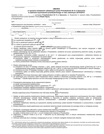 ………………………………………..…… Opoczno, dn. ……………………r. Pieczęć przedszkola UMOWA w sprawie świadczeń udzielanych przez Przedszkole Nr 6 w Opocznie w zakresie wychowania przedszkolnego w roku szkolnym 2014/2015 Zawarta w dniu ………………….r. pomiędzy Przedszkolem Nr 6 w Opocznie, ul. Kopernika 3, zwanym dalej „Przedszkolem”, reprezentowanym przez Dyrektor: Panią Edytę Figurę, a Panią/Panem ....................................................................................................................................................................................................................................... imię i nazwisko rodzica/opiekuna zam. ............................................................................................................................................................................................................................................................. adres zamieszkania legitymującą/cym się dowodem osobistym – seria ……………… Nr………………………………………………………… zwanym dalej „Rodzicem” o świadczenie usług dla dziecka (wypełnić pismem drukowanym): imię dziecka data urodzenia dziecka dzień nazwisko dziecka miejsce urodzenia dziecka nr PESEL dziecka miesiąc rok §1 Rodzic oświadcza, że dziecko korzystać będzie z usług Przedszkola ( właściwe zakreślić): a) w godzinach bezpłatnych 730 – 1230 b) oraz w godzinach płatnych od 630 do 730, c) a także w godzinach płatnych od 1230 do …………..…, co stanowi łącznie dziennie …………….. godzin płatnych (suma godzin z punktów: b) i c)) 2. Rodzic deklarując pobyt dziecka tylko w ramach godzin bezpłatnych w Przedszkolu, tym samym rezygnuje z zajęć 30 dodatkowych organizowanych po godz. 12 . 3. Rodzic zobowiązuje się do odbierania dziecka z Przedszkola, osobiście lub przez upoważnioną pisemnie osobę, do godziny zadeklarowanej w §1 ust.1 lit. c). 4. W przypadku naruszania ustaleń zawartych w §1 ust.1 i 3, dotyczących pory przyprowadzania i odbierania dziecka po zakończonych zajęciach, Przedszkole ma prawo żądać: a) uiszczenia opłaty w wysokości obowiązującej stawki godzinowej za każdą rozpoczętą godzinę poza czasem zadeklarowanego pobytu dziecka w przedszkolu b) zmiany postanowień niniejszej umowy dotyczących godzin pobytu dziecka. §2 1. Rodzic zobowiązuje się do: a) wniesienia do dnia 10 każdego miesiąca, z góry, opłaty będącej iloczynem obowiązującej stawki godzinowej (§ 5 ust.1), zadeklarowanej liczby godzin dodatkowo płatnych (§1 ust.1, pkt b i c) oraz ilości dni pracy Przedszkola w danym miesiącu, b) wniesienia do dnia 10 każdego miesiąca, z góry, opłaty za korzystanie z wyżywienia. c) wniesienia opłaty za każdą rozpoczętą godzinę pobytu dziecka poza czasem zadeklarowanym odnotowaną w miesiącu poprzednim. 2. Szczegółowe informacje dotyczące opłat będą podawane na tablicy ogłoszeń w siedzibie Przedszkola. 3. Za opóźnienie przy wnoszeniu opłat Przedszkole naliczy odsetki w ustawowej wysokości zgodnie z art. 481 § 1 i 2 Kodeksu 1) Cywilnego . Odsetki będą naliczane od dnia roboczego następującego po dniu 10 każdego miesiąca. 1. §3 1. Przedszkole zobowiązuje się do zapewnienia dziecku: a) opieki wychowawczo-dydaktycznej; 30 30 b) bezpłatnego 5-godzinnego pobytu w godzinach 7 – 12 , 2. Przedszkole umożliwia odpłatne korzystanie z wyżywienia. 3. Przedszkole umożliwia odpłatne korzystanie z opieki w godzinach wykraczających poza czas bezpłatnego pobytu dziecka. §4 Zasady organizacji pracy Przedszkola oraz rekrutacji określa Statut Przedszkola. §5 1. Opłatę za jedną godzinę świadczenia (stawkę godzinową), obejmującej zajęcia opiekuńczo-wychowawcze dla dzieci, określa aktualnie obowiązująca uchwała Rady Miejskiej w Opocznie w sprawie ustalenia wysokości opłat za świadczenia w prowadzonych przez Gminę Opoczno przedszkolach i oddziałach przedszkolnych zorganizowanych w szkołach podstawowych. 2. Wysokość odpłatności dziennej za wyżywienie (stawkę żywieniową) ustala Dyrektor Przedszkola w porozumieniu z organem prowadzącym. 3. Zmiana wysokości stawki godzinowej oraz wysokości dziennej stawki żywieniowej nie wymaga zmian w niniejszej umowie. §6 1. Rodzicowi przysługuje odliczenie z tytułu nieobecności dziecka w Przedszkolu w wysokości: a) dziennej stawki żywieniowej za dni nieobecności dziecka w Przedszkolu b) opłaty o której mowa w § 5 ust. 1, za dni nieobecności dziecka w Przedszkolu. 2. Odliczenia, o których mowa w § 6 ust. 1 naliczane są od pierwszego dnia, w którym odnotowano nieobecność dziecka w Przedszkolu. 3. Odliczeń dokonuje się w miesiącu następującym po tym, w którym nastąpiła nieobecność dziecka. 1) § 1. Jeżeli dłużnik opóźnia się ze spełnieniem świadczenia pieniężnego, wierzyciel może żądać odsetek za czas opóźnienia, chociażby nie poniósł żadnej szkody i chociażby opóźnienie było następstwem okoliczności, za które dłużnik odpowiedzialności nie ponosi. § 2. Jeżeli stopa odsetek za opóźnienie nie była z góry oznaczona, należą się odsetki ustawowe. Jednakże gdy wierzytelność jest oprocentowana według stopy wyższej niż stopa ustawowa, wierzyciel może żądać odsetek za opóźnienie według tej wyższej stopy. § 3. W razie zwłoki dłużnika wierzyciel może nadto żądać naprawienia szkody na zasadach ogólnych. §7 1. Strony mogą rozwiązać niniejszą umowę za porozumieniem stron w każdym czasie roku szkolnego. Rozliczenie płatności następuje w ciągu 7 dni od daty rozwiązania umowy. 2. Rodzic może wypowiedzieć umowę z zachowaniem formy pisemnej z dwutygodniowym wyprzedzeniem, ze skutkiem jej rozwiązania od pierwszego dnia miesiąca następującego po upływie okresu wypowiedzenia. Wniesione opłaty za miesiąc, w którym następuje rozwiąza