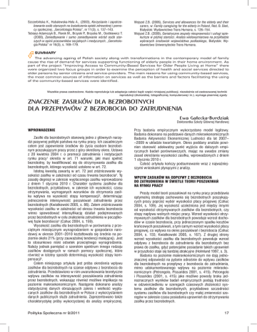 Szczerbińska K., Hubalewska-Hoła A., (2003), Korzystanie i zapotrzebowanie osób starszych na świadczenia opieki zdrowotnej i pomocy społecznej, „Gerontologia Polska”, nr 11(3), s. 137–143. Tobiasz-Adamczyk B., Florek M., Brzyski P., Brzyska M., Ocetkiewicz T. (2008), Zaniedbywanie i samo zaniedbywanie wśród osób starszych w opinii pracowników socjalnych i medycznych, „Gerontologia Polska” nr 16(3), s. 169–179. Wojszel Z.B. (2006), Services and allowances for the elderly and their carers, w: Family caregiving for the elderly in Poland, Red. B. Bień, Białystok: Wydawnictwo Trans Humana, s. 126–154. Wojszel Z.B. (2009), Geriatryczne zespoły niesprawności i usługi opiekuńcze w późnej starości. Analiza wielowymiarowa na przykładzie wybranych środowisk województwa podlaskiego, Białystok: Wydawnictwo Uniwersyteckie Trans Humana. SUMMARY The advancing ageing of Polish society along with transformations in the contemporary model of family cause the rise of demand for services supporting functioning of elderly people in their home environment. As part of the project “Improving Access to Community-Based Services for Older People Living at Home” there were organized two focus groups in order to examine the perception of health and social services directed to older persons by senior citizens and service-providers. The main reasons for using community-based services, the most common sources of information on services as well as the barriers and factors facilitating the using of the community-based services were identified. Wszelkie prawa zastrzeżone. Każda reprodukcja lub adaptacja całości bądź części niniejszej publikacji, niezależnie od zastosowanej techniki reprodukcji (drukarskiej, totograficznej, komputerowej i in.), wymaga pisemnej zgody ZNACZENIE ZASIŁKÓW DLA BEZROBOTNYCH DLA PRZEPŁYWÓW Z BEZROBOCIA DO ZATRUDNIENIA Ewa Gałecka-Burdziak Doktorantka Szkoły Głównej Handlowej WPROWADZENIE Zasiłki dla bezrobotnych stanowią jedno z głównych narzędzi pasywnej polityki państwa na rynku pracy. Ich zasadniczym celem jest zapewnienie środków do życia osobom bezrobotnym poszukującym pracy przez z góry określony okres. Ustawa z 20 kwietnia 2004 r. o promocji zatrudnienia i instytucjach rynku pracy1 określa w art. 71 warunki, jaki musi spełnić bezrobotny, by kwalifikować się do otrzymywania zasiłku dla bezrobotnych, którego wysokość ustalono w art. 72. Istotną kwestią zawartą w art. 72 jest zróżnicowanie wysokości zasiłku w zależności od czasu trwania bezrobocia2. Tę zasadę degresji w zakresie wypłaconego zasiłku wprowadzono z dniem 1 stycznia 2010 r. Charakter systemu zasiłków dla bezrobotnych, przykładowo, w zakresie ich wysokości, czasu otrzymywania, wymaganych warunków do otrzymania zasiłku wpływa na wysokość stopy kompensacji3, determinując jednocześnie intensywność poszukiwań zatrudnienia przez bezrobotnych (Kwiatkowski 2005, s. 86). Zatem zróżnicowanie wysokości zasiłku w zależności od okresu trwania bezrobocia winno spowodować intensyfikację działań podejmowanych przez bezrobotnych w celu znalezienia zatrudnienia w początkowej fazie bezrobocia4 (Cahuc 2004, s. 159). Wysokość zasiłku dla bezrobotnych w porównaniu z przeciętnym miesięcznym wynagrodzeniem w gospodarce narodowej w okresie 2001–2010 kształtowała się średnio na poziomie około 21% (przy zauważalnej tendencji malejącej). Jest to stosunkowo niski odsetek przeciętnego wynagrodzenia. Należy jednak pamiętać o szerokim spektrum innego rodzaju zasiłków dostępnych w ramach pomocy społecznej, które również w istotny sposób determinują wysokość stopy kompensacji5. Celem niniejszego artykułu jest próba określenia wpływu zasiłków dla bezrobotnych na szanse odpływu z bezrobocia do zatrudnienia. Przedstawiono w nim uwarunkowania teoretyczne wpływu zasiłków na intensywność poszukiwania zatrudnienia przez bezrobotnych, wskazując również możliwe implikacje na poziomie makroekonomicznym. Następnie dokonano analizy statystycznej danych obrazujących zakres i wielkość wypłacanych zasiłków dla bezrobotnych w Polsce z wykorzystaniem danych publicznych służb zatrudnienia. Zaprezentowano także charakterystykę próby wykorzystanej do analizy empirycznej. Polityka Społeczna nr 9/2011 Przy badaniu empirycznym wykorzystano model logitowy. Badania dokonano na podstawie danych mikroekonomicznych Badania Aktywności Ekonomicznej Ludności dla lat 2007– –2009 w układzie kwartalnym. Okres poddany analizie powinien stanowić adekwatny punkt wyjścia do dalszych empirycznych badań porównawczych, mając na uwadze zmiany zasad określania wysokości zasiłku, wprowadzonych z dniem 1 stycznia 2010 r. Całość artykułu kończy podsumowanie wraz z najważniejszymi wnioskami płynącymi z analizy. WPŁYW ZASIŁKÓW NA ODPŁYWY Z BEZROBOCIA DO ZATRUDNIENIA W ŚWIETLE TEORII POSZUKIWAŃ NA RYNKU PRACY Prosty model teorii poszukiwań na rynku pracy przedstawia optymalną strategię zachowania się bezrobotnych poszukujących pracy poprzez wybór wysokości płacy progowej (Cahuc 2004, s. 109). Jej wysokość uzależniona jest między innymi od wysokości otrzymywanych zasiłków dla bezrobotnych, czy stopy napływu wolnych miejsc pracy. Wzrost wysokości otrzymywanych zasiłków dla bezrobotnych powoduje wzrost dochodów w czasie bezrobocia, przy jednoczesnym spadku kosztów krańcowych poszukiwań, a tym samym wzrost wysokości płacy progowej, co wpływa na okres poszukiwań i bezrobocia (Cahuc 2004, s. 155; Kwiatkowski 2005, s. 167). Z drugiej strony wzrost wysokości zasiłku dla bezrobotnych powoduje wzrost odpływu z bezrobocia do zatrudnienia dla bezrobotnych bez prawa do zasiłku, gdyż potencjalne posiadanie takich uprawnień w przyszłości staje się bardziej atrakcyjne (Holmlund 1997, s. 3). Badania na poziomie makroekonomicznym nie dają jednoznacznej odpowiedzi na pytanie odnośnie do wpływ