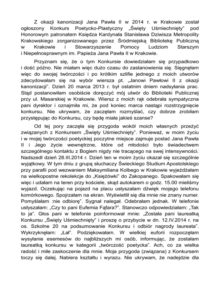 Z okazji kanonizacji Jana Pawła II w 2014 r. w Krakowie został ogłoszony Konkurs Poetycko-Plastyczny „Święty Uśmiechnięty” pod Honorowym patronatem Księdza Kardynała Stanisława Dziwisza Metropolity Krakowskiego zorganizowanego przez Śródmiejską Bibliotekę Publiczną w Krakowie i Stowarzyszenie Pomocy Ludziom Starszym i Niepełnosprawnym im. Papieża Jana Pawła II w Krakowie. Przyznam się, że o tym Konkursie dowiedziałam się przypadkowo i dość późno. Nie miałam więc dużo czasu do zastanowienia się. Sięgnęłam więc do swojej twórczości i po krótkim szlifie jednego z moich utworów zdecydowałam się na wybór wiersza pt. „Janowi Pawłowi II z okazji kanonizacji”. Dzień 20 marca 2013 r. był ostatnim dniem nadsyłania prac. Stąd postanowiłam osobiście doręczyć mój utwór do Biblioteki Publicznej przy ul. Masarskiej w Krakowie. Wiersz z moich rąk odebrała sympatyczna pani dyrektor i oznajmiła mi, że pod koniec marca nastąpi rozstrzygnięcie konkursu. Nie ukrywam, że zaczęłam rozmyślać, czy dobrze zrobiłam przystępując do Konkursu, czy będę miała jakieś szanse? Od tej pory zaczęła się przygoda wokół moich własnych przeżyć związanych z Konkursem „Święty Uśmiechnięty”. Ponieważ, w moim życiu i w mojej twórczości poetyckiej poczytne miejsce zajmuje postać Jana Pawła II i Jego życie wewnętrzne, które od młodości było świadectwem szczególnego kontaktu z Bogiem nigdy nie tracącego na swej intensywności. Nadszedł dzień 28.III.2014 r. Dzień ten w moim życiu okazał się szczególnie wyjątkowy. W tym dniu z grupą słuchaczy Świeckiego Studium Apostolskiego przy parafii pod wezwaniem Maksymiliana Kolbego w Krakowie wyjeżdżałam na wielkopostne rekolekcje do „Księżówki” do Zakopanego. Spakowałam się więc i udałam na teren przy kościele, skąd autokarem o godz. 15.00 mieliśmy wyjazd. Oczekując na pojazd na placu usłyszałam dźwięk mojego telefonu komórkowego. Spojrzałam na ekran. Wyświetlił się dla mnie nie znany numer. Pomyślałam :nie odbiorę”. Sygnał nalegał. Odebrałam jednak. W telefonie usłyszałam: „Czy to pani Eufemia Fąfara?”. Stanowczo odpowiedziałam: „Tak to ja”. Głos pani w telefonie poinformował mnie: „Została pani laureatką Konkursu „Święty Uśmiechnięty” i proszę o przybycie w dn. 12.IV.2014 r. na os. Szkolne 20 na podsumowanie Konkursu i odbiór nagrody laureata”. Wykrzyknęłam: „Łał”. Podziękowałam. W wielkiej euforii rozpoczęłam wysyłanie esemesów do najbliższych mi osób, informując, że zostałam laureatką konkursu w kategorii „twórczość poetycka”. Ach, co za wielka radość i miłe zaskoczenie dla mnie. Moja przygoda (związana) z Konkursem toczy się dalej. Nabiera kształtu i wyrazu. Nie ukrywam, że nadejdzie dla mnie kolejny dzień, który najprawdopodobniej przyniesie mi szereg miłych dla mnie niespodzianek. 12.IV.2014 r. o godz. 10.00 w auli odświętnie udekorowanym Domu Pomocy Społecznej na os. Szkolnym 20 odbył się uroczysty finał Konkursu „Święty Uśmiechnięty”. W bardzo przyjemnej atmosferze laureaci odbierał swoje nagrody w czterech kategoriach wiekowych z rąk pana dyrektora Domu pomocy Społecznej, dyrektorki Biblioteki Publicznej, przedstawicieli jury, przedstawicieli władz Miasta Krakowa. Pod koniec uroczystości, ponieważ była w przedziale wiekowym 18+ usłyszałam moje nazwisko. Serce mocniej mi zabiło. Wyszłam na środek. Odebrałam dyplom za zajęcie I miejsca w kategorii – twórczość poetycka, główną nagrodę tj. portret Jana Pawła II, na płótnie o wymiarach 90 cm x 60 cm oraz „Poezje Zebrane” Karola Wojtyły, „Tryptyk Rzymski” Jana Pawła II Wydanie Jubileuszowe. Byłam bardzo szczęśliwa, towarzyszyło mi ogromne wzruszenie. W imieniu nagrodzonych podziękowałam organizatorom imprezy i gościom, którzy przybyli na uroczysty finał. Historia ta, którą przedstawiłam jest moją osobistą, która miała miejsce wiosną 2014 r. Eufemia Fąfara