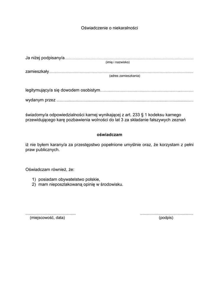 Oświadczenie o niekaralności Ja niŜej podpisany/a………………………………………………………………………….………………..…………… (imię i nazwisko) zamieszkały………………………………………………………………………………………………………………….…. (adres zamieszkania) legitymujący/a się dowodem osobistym………………………………………………………………...………… wydanym przez ........................................................................................................................................................ świadomy/a odpowiedzialności karnej wynikającej z art. 233 § 1 kodeksu karnego przewidującego karę pozbawienia wolności do lat 3 za składanie fałszywych zeznań oświadczam iŜ nie byłem karany/a za przestępstwo popełnione umyślnie oraz, Ŝe korzystam z pełni praw publicznych. Oświadczam równieŜ, Ŝe: 1) posiadam obywatelstwo polskie, 2) mam nieposzlakowaną opinię w środowisku. ........................................................ (miejscowość, data) ........................................................... (podpis)