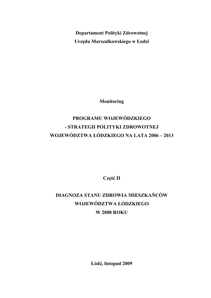 Departament Polityki Zdrowotnej Urzędu Marszałkowskiego w Łodzi Monitoring PROGRAMU WOJEWÓDZKIEGO - STRATEGII POLITYKI ZDROWOTNEJ WOJEWÓDZTWA ŁÓDZKIEGO NA LATA 2006 – 2013 Część II DIAGNOZA STANU ZDROWIA MIESZKAŃCÓW WOJEWÓDZTWA ŁÓDZKIEGO W 2008 ROKU Łódź, listopad 2009 SPIS TREŚCI 1. CHARAKTERYSTYKA POPULACJI………………………………………………….... 3 2. RUCH NATURALNY LUDNOŚCI………………………………………………………. 6 2.1. 2.2. 2.3. 2.4. 2.5. 2.6. 2.7. 2.8. Współczynnik urodzeń żywych…………………………………………………..... Współczynnik noworodków z niską masą urodzeniową…………………………... Współczynnik płodności kobiet………………………………………………….... Współczynnik zgonów…………………………………………………………… Przyrost naturalny………………………………………………………………...... Współczynnik umieralności niemowląt………………………………………..….. Zgony dzieci i młodzieży……………………………………………………..…… Przeciętne dalsze trwanie życia…………………………………………………..... 6 6 6 6 7 7 8 8 STRUKTURA ZGONÓW…………………………………………………………..…..… 9 3. 3.1. 3.2. 3.3. 3.4. 4. Choroby układu krążenia…………………………………………………………... 9 Nowotwory złośliwe……………………………………………………………...... 10 Zewnętrzne przyczyny zgonów……………………………………………………. 10 Inne przyczyny zgonów……………………………………………………………. 11 STACJONARNA OPIEKA MEDYCZNA………………………………………………... 12 4.1. Struktura hospitalizacji według ICD-10………………………………………….... 23 5. SPECJALISTYCZNA OPIEKA AMBULATORYJNA………………………………….. 25 6. PODSTAWOWA OPIEKA ZDROWOTNA……………………………………………... 25 7. POMOC DORAŹNA………………………........................................................................ 28 8. MEDYCYNA SZKOLNA……………………………………………………………….... 32 8.1. 8.2. 8.3. 8.4. 8.5. Realizacja zadań z zakresu medycyny szkolnej……………………………….…... Testy przesiewowe……………………………………………………………….... Profilaktyczne badania lekarskie……………………………………………….….. Gabinety profilaktyki i pomocy przedlekarskiej…………………………………... Grupowa profilaktyka próchnicy zębów…………………………………………... 32 32 33 34 34 EPIDEMIOLOGIA CHORÓB ZAKAŹNYCH I ZATRUĆ………………………….…... 35 9.1. 9.2. 9.3. 9.4. 9.5. 9.6. 9.7. 9.8. 35 35 37 37 38 40 41 41 9. Zatrucia i zakażenia pokarmowe…………………………………………………... Choroby wieku dziecięcego…………………………………………………….…. Wirusowe zapalenie wątroby……………………………………………………... Zakażenia wirusem HIV i zachorowania na AIDS…………………………….….. Inne choroby zakaźne…………………………………………………………..….. Choroby weneryczne…………………………………………………………..…... Zatrucia chemiczne…………………………………………………………..…….. Grypa……………………………………………………………………………… 1 10. STRUKTURA NIEPEŁNOSPRAWNOŚCI…………………………………………….... 42 11. ZAPOBIEGANIE CHOROBOM…………………………………………………………. 50 11.1. Szczepienia ochronne…………………………………………………………….... 11.2. Działania profilaktyczne realizowane na terenie województwa łódzkiego w 2008 roku………………………………………………………………………... 11.3. Współpraca z organizacjami pozarządowymi……………………………………... 50 51 58 12. RYZYKOWNE ZACHOWANIA ZDROWOTNE……………………………………..… 59 12.1. Palenie papierosów……………………………………………………………..….. 12.2. Używanie substancji psychoaktywnych………………………………………….... 12.3. Konsumpcja alkoholu………………………………………………………..…….. 59 60 61 13. ŚRODOWISKOWE UWRUNKOWANIA ZDROWIA………………………………..… 65 13.1. 13.2. 13.3. 13.4. Struktura populacji według poziomu wykształcenia………………………………. Rynek pracy i dochody ludności………………………………………………..…. Środowisko fizyczne………………………………………………………………. Ocena infrastruktury wodociągowo-kanalizacyjnej i ocena stanu sanitarnego wody pitnej.……………………………………………………………………….. 13.5. Ocena jakości powietrza…………………………………………………………... 65 65 69 69 70 14. PODSUMOWANIE……………………………………………………………………….. 72 15. BIBLIOGRAFIA…………………………………………………………………………... 74 2 1. CHARAKTERYSTYKA POPULACJI Województwo łódzkie zajmuje obszar 18.219 km2 i znajduje się na 9 miejscu pod względem wielkości powierzchni w kraju. Składa się z 21 powiatów, 3 miast na prawach powiatu oraz 177 gmin (18 miejskich, 135 wiejskich i 24 miejsko-wiejskich). W dniu 31 grudnia 2008 roku liczba ludności w województwie łódzkim wynosiła 2.548.861 osób, tj. o 7.037 mniej 