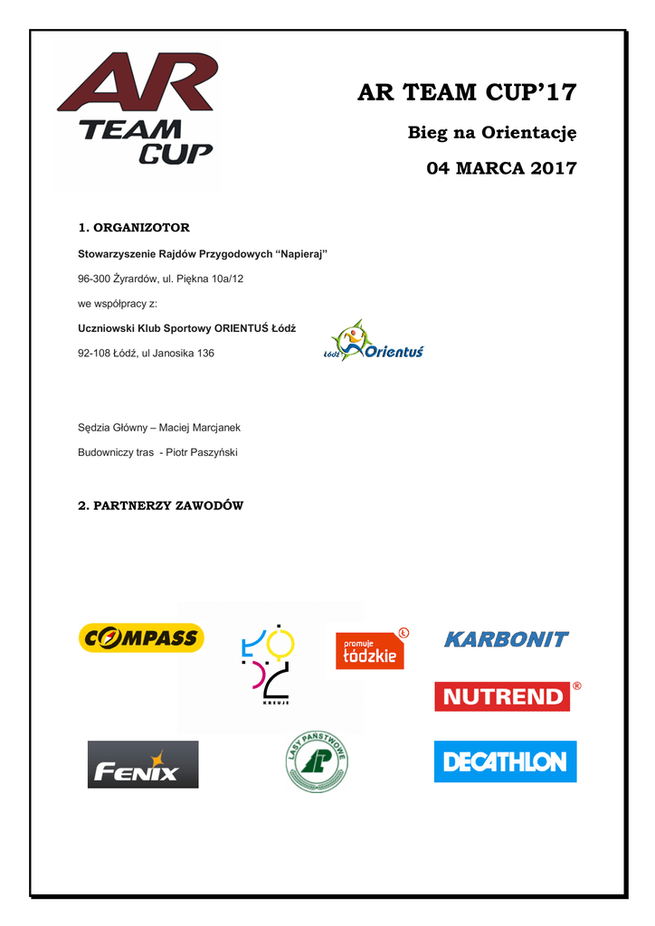 AR TEAM CUP’17 Bieg na Orientację 04 MARCA 2017 1. ORGANIZOTOR Stowarzyszenie Rajdów Przygodowych “Napieraj” 96-300 Żyrardów, ul. Piękna 10a/12 we współpracy z: Uczniowski Klub Sportowy ORIENTUŚ Łódź 92-108 Łódź, ul Janosika 136 Sędzia Główny – Maciej Marcjanek Budowniczy tras - Piotr Paszyński 2. PARTNERZY ZAWODÓW 3. CENTRUM ZAWODÓW Centrum Zarządzania Łódzkim Szlakiem Konnym, Łódź, ul. Wycieczkowa 86, W tym miejscu zlokalizowane będą także: Start i Meta zawodów. Biuro zawodów czynne będzie od godziny 830 Na terenie Centrum dostępny jest niestrzeżony/ogrodzony parking – możliwość pozostawienia samochodu na czas zawodów. Bezpośrednio przed i po zawodach zawodnicy będą mieli do dyspozycji toalety oraz pomieszczenie szatni. W biurze zawodów będzie możliwość zdeponowania na czas rajdu dokumentów/kluczyków itd. (na własną odpowiedzialność) Organizator nie zapewnia noclegu. Możliwe dostępne miejsca noclegowe (przykładowe): 1. Flamingo Hostel Łódź, ul. Sienkiewicza 67 / e-mail: [email protected] http://www.pl.lodz.flamingo-hostel.com/ 2. Hotel Agat, ul. Strykowska 94 / e-mail: [email protected] www.agathotel.pl 3. Hotelowy Kompleks Leśny „ ARTURÓWEK” e-mail: [email protected] http://www.arturowek.eu/ 4. Centrum Szkoleniowo-Konferencyjne UŁ ul. Rogowska 26 / e-mail: [email protected] http://csk.uni.lodz.pl/ 4. PROGRAM Sobota, 11 marca 2017 8:30–10:00 – rejestracja zawodników, 10:30 – odprawa techniczna, 11:00 – START BIEGU, 16:00 - ZAMKNIĘCIE METY (limit czasu 5h) 16:30 - dekoracja zwycięzców, zakończenie zawodów 5. TEREN / FORMA ZAWODÓW Indywidualny bieg na orientację w formie scorelaufu (punkty kontrolne (PK) zaliczamy w dowolnej kolejności). Każdy zawodnik otrzymuje mapę i kartę startową. PK potwierdzane są za pomocą perforatorów na kartach startowych. Zadaniem uczestników jest zaliczenie punktów kontrolnych w jak najkrótszym czasie. O wyniku decyduje czas ukończenia trasy z uwzględnieniem kar czasowych. Za ominięcie punktu kontrolnego naliczana jest kara, która podana jest na mapie obok PK (w zależności od punktu jest to 3060 minut). Do sklasyfikowania wymagane jest zaliczenie połowy trasy, tzn. 50% + 1 punktów. Limit czasu na pokonanie trasy wynosi 5 godz. Za zgłoszenie się na mecie po limicie czasu naliczane są minuty karne: 5 minut karnych za każdą rozpoczętą minutę spóźnienia. Spóźnienie większe niż 15 minut skutkuje dyskwalifikacją. Przewidywany czas zwycięzcy: 3-3,5 godziny. Klasyfikacja w 2 kategoriach: M i K. W kilku miejscach trasy zawonicy będą przekraczać jezdnię o średnim, bądź niskim natężeniu ruchu - Apelujemy o uwagę!!! 6. MAPA Mapy do biegu na orientację w skali 1:10000 - 1:15000, zafoliowane, z naniesionymi na mapę opisami PK (sugerujemy zapoznanie się z opisami punktów kontrolnych w biegu na orientację). 7. ZGŁOSZENIA / OPŁATY STARTOWE Zgłoszenia za pomocą formularza zgłoszeniowego na stronie zawodów do dnia 26.02.17 Opłaty startowe: - 15 w terminie do 17.02.17 płatne na konto: STOWARZYSZENIE RAJDÓW PRZYGODOWYCH NAPIERAJ 62 2030 0045 1110 0000 0251 3520 96-300 Żyrardów, ul. Piękna 10A/12 - 25 zł płatne w biurze zawodów 8. LISTA STARTOWA Lista startowa będzie publikowana i uaktualniana od 30.01 9. WYNIKI / NAGRODY Oficjalne ogłoszenie wyników zawodów oraz wręczenie nagród dla 3 najlepszych zawodników w kategorii nastąpi 30 minut po zamknięciu Mety zawodów około godziny 1630 Szczegółowe i bieżące informacje umieszczane będą na stronie zawodów www.arteamcup.pl oraz profilu www.facebook.com/arteampolska