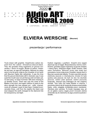 Stowarzyszenie Artystyczne Muzyka Centrum Goethe-Institute Kraków m b g u z r a e y k n i a z c AUdio ART FEStiwaL 2000 k o n c e r t y i n s t a l a c j e p e r f o r m a n c e www.audioart.z.pl 5 LISTOPADA, 20:00, BUNKIER SZTUKI ELVIERA WERSCHE (Neunen) prezentacja i performance Trunk drawn with graphite. Graphit-eine carbon deposit from the carbon. Amorphous-obscure-black. Tree, the grossten living organisms on ground connection = donor of oxygen. Binder of carbon. Graphite and tree, an age-old Verhaltnis. Milionen by years were to be let grow notig by the Urwalder of our earth with Baumen highly like cathedrals. It was the time that the ground electrodes still in dramatic way it was quiet the mouth was not yet that eye did not listen yet, no bird sang, no bees hummed. Still were missing to us familiar sound. There was only the noise of the Blatter in the wind. And again millions of years to the alive strength the tree passed put - erlitz, charred, cools off, pressed. Layer of uber layer. It lasted inconceivable times, until from the depths the black coal dust stepped the earth changed to the diamond into its transparency and light. Kad³ub ci¹gniêty z grafitem. Graphit eine wêgiel deponuje siê od wêgla. Bezpostaciowy ciemny czerñ. Drzewo, grossten ¿yj¹ce organizmy na gruntu zwi¹zku = dawcy tlenu. Wi¹zanie wêgla. Grafit i drzewo, wiek stare Verhaltnis. Milionen przez lata mia³y byæ pozwalane rosn¹ notig przez Urwalder naszej ziemi z Bauman wysoko jak katedry. To by³o czas który gruntu elektrody jeszcze w dramatyczny drodze to by³o spokój usta jeszcze nie by³o ¿e oko nie s³ucha³o jeszcze, ¿aden ptak piewa³, ¿adne pszczo³y brzêcza³y. Jeszcze by³y brakuj¹ce do nas znajomy dwiêk. Tam tylko by³ ha³as Blatter w wietrze. I ponownie miliony lat do ¿ywej si³y drzewo przechodzi³y k³ad¹ - erlitz, zwêgla³y, och³adza³y precz, naciskane. Warstwa uber warstwy. To trwa³o niepojêty razy, a¿ do od g³êbie czarny wêgla proch kroczy³o ziemia zmienia³a siê do diamentu do jego przeroczystoci i wiat³o . algorythmic translation: Systran Translation Software t³umacznie algorytmiczne: English Translator koncert wspierany przez Fundacjê Gaudeamus, Amsterdam Elviera Wersche * 1948, Westerstede (FRG), woont EN works sinds 1974 in Nederland; 1967-1970 - Study aan de Hochschule fur screen end of arts in Braunschweig, vrije sign art; 1970-1972 - Study aan de Hochschule for screen end of arts in Kassel, film EN kunspedagogiek (geabs.cum laude); 1972-1974 - aan High School in Oldenburg referendariaat (geabs. 1.grasads bevoegdheid); 1975 - Docente aan High School in Viersen; 1975-1977 - Filmcollectief " De Kritiese Filmers " - Breda; 1978-1980 - Docente film S.K.V.E - Eindhoven; 1985 - Werkzaam aan verschillende creativeitscentra; 1998 -.... - EN cursussen workshops in own studioo Solotentoonstellingen: 1970 - Straatperformance " Vetementa Tinta " Braunschweig, " barrel nevertheless times on " Braunschweig; 1971 - Paula Modersohn house Bremen; 1981 - Straatperformance met 4 muzikanten Eindhoven; 1983 - t Meyhuis Helmond; 1984 - Gallery Roche Bremen; 1985 - " art Krisis OF Keerpunt " Arnhem, " Godenschemering 1 " Arnhem; " Godenschemering 2 " V2 the Bosch, " Godenschemering 3 " Hemelrijken Eindhoven, in samenwerking met H. Rickels EN J. van Brakel; 1987 - De Kern Heinkenzand, " Dodekafonie " V2 the Bosch seed met H. Rickels; 1988 - Gallery Stodola Warsaw, gallery Kalypso Warsaw, gallery Rzezby Warsaw, gallery Wschodnia Lodz, museum Choinice, gallery Mandala Krakow, gallery Bimoldsbelang Groningen; 1989 - Tongerloguys Roosendaal; 1990 gallery Parbleu Antwerp; 1992 - Gallery Biemoldsbelang Groningen; 1992/1996 - Opdrachten: " Stadsportretten " van o.a.Hamburg, Bremen, Hanover, Oldenburg, wolf castle...; 1999 - gallery type ' 88, Neunen; 2000 Kunstkamer Hogeloon Groepstentoonstellingen: 1969 - Art association Hanover; 1972 - Dayday days upper living; 1980 - Technical Hogeschool Tilburg, " finger fur Germany " studio J.Immendorf Duseldorf; 1981 - Toetsruimte Nijmegen; 1984 - Artina Eindhoven, " Menselijk figuur " NBKS tentoonstelling; 1986 - Art association Achen, Hemelrijken Eindhoven; 1987 - Lehnstetter 62 Bremen; 1989 - " transfer " Hanover; 1991 - " Hot other one gezicht " NBKS; 1995 - t Weefhuis Neunen;1996 - t Weefhuis Neunen, Bibliotheek Neunen; Deelname studio route Eindhoven; 1998 Gallery bon tone Helmond, Deelname studio route Eindhoven; 1999 - Dellname symposium " kunstenaar voor Europe ", Civitella D'Agliano, Italie; 2000 - Bunkier Sztuki, Kraków, Centraal Boekenhuis, Culemborg Elviera Wersche * 1948 , Westerstede ( Frg ) , woont En zak³adów sinds 1974 w Nederland ; 1967 1970 - Badania aan de Hochschule futrzany ekranu koniec umiejêtnoci w Braunschweig , vrije znaku sztuka ; 1970 1972 Badania aan de Hochschule dla ekranu koñca umiejêtnoci w Kassel , filmu En kunspedagogiek ( geabs . Cum laude ) ; 1972 1974 - aan Wysoka Szko³a w Oldenburg referendariaat ( geabs . 1 . Grasads bevoegdheid ) ; 1975 - Docente aan Wysoka Szko³a w Viersen ; 1975 1977 - Filmcollectief " de Kritiese Filmers " - Breda ; 1978 1980 - Docente filmu S . K . V . E - Eindhoven ; 1985 - Werkzaam aan verschillende creativeitscentra ; 1998 - . - En cursussen warsztaty w w³asnym studioo Solotentoonstellingen : 1970 - Straatperformance " Vetementa Tinta " Braunschweig , " bary³ka niemniej jednak razy na " Braunschweig ; ; 1971 - Paula Modersohn domu Brema ; 1981 - Straatperformance spotyka³ 4 muzikanten Eindhoven ; 1983 - t Meyhuis Helmond ; 1984 - Galerii Roche Brema ; 1985 - " sztuki Krisis Keerpunt " Arnhem , " Godenschemering 1 " Arnhem ; " Godenschemering 2 " V2 Bosch , " Godenschemering 3 " Hemelrijken Eindhoven , w samenwerking spotyka³ H . Rickels En J . Wozu Brakel ; 1987 - De Irlandzkie ¿o³nierza piechoty Heinkenzand , " Dodekafonie " V2 Bosch nasienie spotyka³ H . Rickels ; 1988 - Galerii Stodola Warszawa , galerii Kalypso Warszawa , galerii Rzezby Warszawa , galerii Wsc