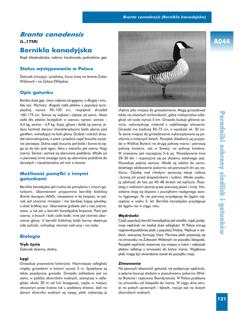 Branta canadensis (Bernikla kanadyjska) Branta canadensis A044 (L.,1758) Bernikla kanadyjska Rzàd: blaszkodziobe, rodzina: kaczkowate, podrodzina: g´si Status wyst´powania w Polsce Gatunek zimujàcy i przelotny, liczny zimà na terenie ˚u∏aw WiÊlanych i na Zatoce Elblàskiej. Opis gatunku Mo˝liwoÊç pomy∏ki z innymi gatunkami Bernikla kanadyjska jest trudna do pomylenia z innymi gatunkami. Ubarwieniem przypomina bernikl´ bia∏olicà Branta leucopsis (A045, nieopisana w tej ksià˝ce), ta jednak jest znacznie mniejsza i ma bardziej kr´pà sylwetk´, o doÊç krótkiej szyi. Ubarwienie grzbietu jest u niej czarnoszare, a nie jak u bernikli kanadyjskiej bràzowe. PierÊ jest czarna, a brzuch i boki cia∏a bia∏e. Inne jest równie˝ ubarwienie g∏owy. U bernikli bia∏olicej bia∏a barwa obejmuje ca∏e policzki, wchodzàc równie˝ nad oczy i na czo∏o. Biologia Tryb ˝ycia Gatunek dzienny, stadny. L´gi Gniazduje przewa˝nie kolonijnie. Najmniejsza odleg∏oÊç mi´dzy gniazdami w kolonii wynosi 5 m. Spotykane sà tak˝e pojedyncze gniazda. Gniazdo zak∏adane jest na ziemi, w pobli˝u zbiorników wodnych, zazwyczaj w odleg∏oÊci oko∏o 30 m od linii brzegowej, cz´sto w miejscu otoczonym przez krzewy lub u podstawy drzewa. JeÊli na danym zbiorniku wodnym sà wyspy, ptaki wybierajà je ch´tnie jako miejsce do gniazdowania. Mogà gniazdowaç tak˝e na otwartych torfowiskach, gdzie maksymalna odleg∏oÊç od wody wynosi 5 km. Gniazdo buduje g∏ównie samica, wykorzystujàc materia∏ z najbli˝szego otoczenia. Gniazdo ma Êrednic´ 50–75 cm, a wysokoÊç ok. 20 cm. Te same miejsca do gniazdowania wykorzystywane sà powtórnie w kolejnych latach. Poczàtek sk∏adania jaj przypada w Wielkiej Brytanii na drugà po∏ow´ marca i pierwszà po∏ow´ kwietnia, zaÊ w Szwecji na po∏ow´ kwietnia. W zniesieniu jest najcz´Êciej 5–6 jaj. Wysiadywanie trwa 28–30 dni i rozpoczyna si´ po z∏o˝eniu ostatniego jaja. Wysiaduje jedynie samica. M∏ode sà zdolne do samodzielnego zdobywania pokarmu od pierwszych dni po wykluciu. Opiek´ nad m∏odymi sprawujà oboje rodzice i bronià ich przed drapie˝nikami i ludêmi. M∏ode uzyskujà zdolnoÊç do lotu po 40–48 dniach od wyklucia. Pozostajà z rodzicami jeszcze przez pierwszà jesieƒ i zim´. Niezale˝ne stajà si´ dopiero z poczàtkiem nast´pnego sezonu l´gowego. Po raz pierwszy przyst´pujà do l´gów najcz´Êciej w wieku 3. lat. Bernikla kanadyjska przyst´puje do l´gów raz w ciàgu roku. W´drówki CzeÊç populacji bernikli kanadyjskiej jest osiad∏a, cz´Êç podejmuje w´drówki na niezbyt du˝e odleg∏oÊci. W Polsce zimujà najprawdopodobniej ptaki z populacji fiƒskiej. W´druje w stadach, zazwyczaj formujàc klucz. Pierwsze ptaki pojawiajà si´ na zimowisku na ˚u∏awach WiÊlanych na poczàtku listopada. Poczàtek w´drówki wiosennej ma miejsce w lutym i wi´kszoÊç ptaków odlatuje z zimowiska do koƒca marca. Wyjàtkowo ptaki mogà byç stwierdzane nawet do poczàtku maja. Poradniki ochrony siedlisk i gatunków Bardzo du˝a g´Ê, nieco wi´ksza od g´gawy, o d∏ugiej i smuk∏ej szyi. Wymiary: d∏ugoÊç cia∏a ptaków z populacji europejskiej wynosi 90–100 cm, rozpi´toÊç skrzyde∏ 160–175 cm. Samce sà wi´ksze i ci´˝sze od samic. Masa cia∏a dla ptaków brytyjskich w czerwcu wynosi: samice – 4,4 kg, samce – 4,9 kg. Szyja, g∏owa i dziób sà czarne, jedyny kontrast stanowi charakterystyczna bia∏a plama pod gard∏em, wchodzàca na boki g∏owy. Grzbiet i wierzch skrzyde∏ ciemnobràzowe, a pierÊ i przednia cz´Êç brzucha wyraênie jaÊniejsze. Dolna cz´Êç brzucha jest bia∏a i barwa ta si´ga a˝ do ty∏u pod ogon, który z wierzchu jest czarny. Nogi czarne. Samce i samice sà ubarwione podobnie. M∏ode ju˝ w pierwszej zimie swojego ˝ycia sà ubarwione podobnie do doros∏ych i nieodró˝nialne od nich w terenie. Zimowanie Na pewnych obszarach gatunek nie podejmuje w´drówki, a jedynie koczuje stadami w poszukiwaniu pokarmu (Wielka Brytania i cz´Êciowo Skandynawia). W Polsce przebywa na zimowisku od listopada do marca. W ciàgu dnia ˝eruje na polach uprawnych i ∏àkach, nocuje zaÊ na du˝ych zbiornikach wodnych. 121 Ptaki (cz´Êç I) Poradniki ochrony siedlisk i gatunków A044 Pokarm Od˝ywia si´ pokarmem roÊlinnym. Zjada êdêb∏a traw, liÊcie, p´dy, korzenie, bulwy i k∏àcza, a tak˝e owoce i nasiona. Pokarm pobiera najcz´Êciej, pasàc si´ na otwartych przestrzeniach. Czasami ˝eruje na wodzie, zanurzajàc g∏ow´. G∏ówny sk∏adnik pokarmu w okresie pozal´gowym stanowià: rzepak, pszenica ozima, koniczyna. znajduje si´ pod Elblàgiem. Ptaki nocujà na Zatoce Elblàskiej lub w innych cz´Êciach Zalewu WiÊlanego, w dzieƒ ˝erujà na polach uprawnych na terenie ˚u∏aw WiÊlanych. W innych rejonach kraju najwi´cej obserwacji pochodzi znad Zat. Gdaƒskiej oraz spod W∏oc∏awka (w latach 1987–1993), gdzie bywajà obserwowane nieregularnie pojedyncze ptaki lub niewielkie stada. Wyst´powanie Status ochronny Siedlisko Gniazduje zazwyczaj w pobli˝u niewielkich zbiorników wodnych, cz´Êciowo zaroÊni´tych przez wynurzonà roÊlinnoÊç wodnà, rzadziej na podmok∏ych terenach oddalonych od zbiornika wodnego. Na gniazdo wybiera najcz´Êciej miejsca otoczone krzewami, a nawet zadrzewione. Wa˝ny jest dla niej dost´p do otwartych ∏àk, gdzie ˝eruje. Zimà koczuje w du˝ych stadach, ˝erujàc na otwartych terenach, np. polach uprawnych lub ∏àkach. Dla zimujàcych stad istotna jest bliskoÊç du˝ego zbiornika wodnego, umo˝liwiajàcego bezpieczny nocleg. Ochrona gatunkowa w Polsce: gatunek obj´ty ochronà cz´Êciowà (Dz U z 2004 r. Nr 220, poz. 2237) Status zagro˝enia w Europie: BirdLife International: SPEC Dyrektywa Ptasia: Art. 4.2 Konwencja Berneƒska: za∏àcznik III Siedliska z za∏àcznika 1 Dyrektywy Siedliskowej, które mogà byç istotne dla gatunku 1130 UjÊcia rzek (estuaria) 1150 Zalewy i jeziora