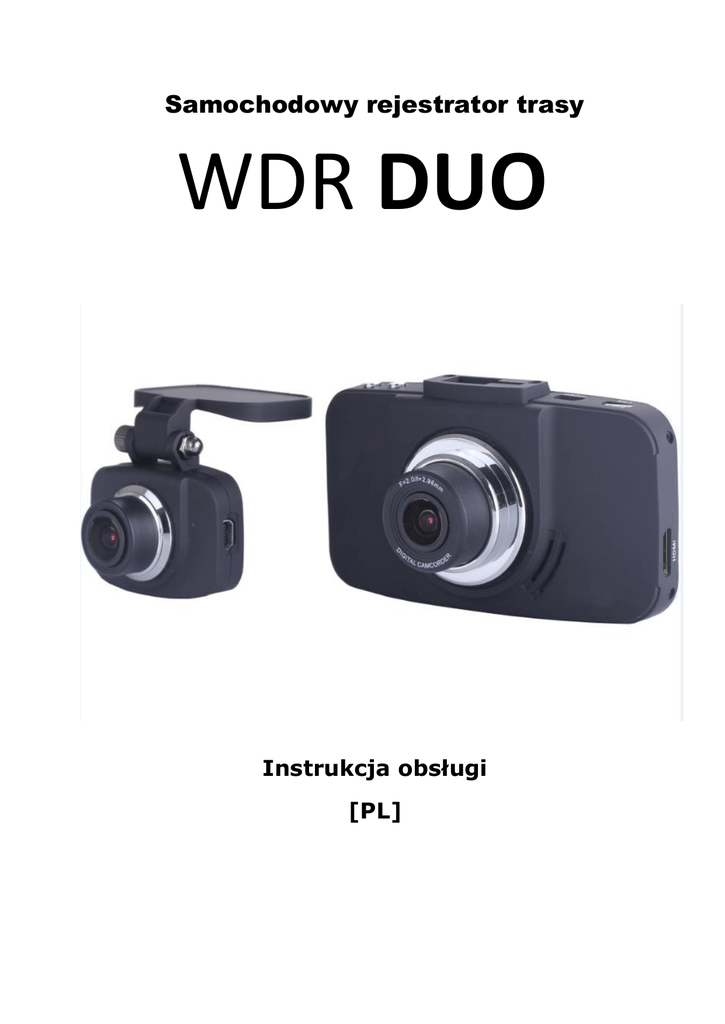 Samochodowy rejestrator trasy WDR DUO Instrukcja obsługi [PL] Uwagi Dla własnego bezpieczeństwa nie obsługuj kamery w trakcie jazdy. Zainstaluj kamerę na szybie tak aby nie ograniczała widoczności. Upewnij się czy obiektyw kamery nie jest przysłonięty. Utrzymuj obiektyw w czystości. Temperatura pracy urządzenia to 0 ℃~60 ℃ I wilgotność powietrza 10%~ 80% . Używaj tylko ładowarki fabrycznej. Specyfikacja Sensor Obiektyw CPU LCD Audio Pamięć zew. Czujnik wstrząsów Detekcja ruchu Migawka Balans bieli Ekspozycja TV interface Akumulator) Video format Kamera Rozdzielczo ść Język USB Nagrywanie w pętli Wył. wyświetlacza Zmiana podglądu Mikrofon 2x CMOS sensors, 1/2.7" Obiektyw szklany, wielowarstwowy Ambarella A7L 3 inch 16:9 TFT LCD Wbudowany mikrofon I głośnik microSD class 10 do 32GB Czułość 2g/4g/8g/OFF ON/OFF Elektroniczna Auto Auto ISO HDMI 500mAh 3.7V li-ion MP4 2xkamera 1920x1080 30kl/s, wbudowana w urządzenie oraz na przewodzie 1920x1080P30,1280x720P30 English, Russian USB 2.0 OFF/1/min/2 min/3 min OFF/1 min/3 min Możliwość podglądu z każdej kamery osobno lub łącznie. ON/OFF OFICJALNY DYSTRYBUTOR: Luxury-goods.pl 2 Opis urządzenia. 1.2nd Kamera 5.Power 9.Góra 2.USB 3.VIDEO 6.OK 7.HDMI 10.Dół 13.microSD slot 14.RESET 4. Mocowanie 11.MODE 8.MENU 12.Mikrofon 15.Dioda LED Funkcje przycisków Mode: zmiana pomiędzy nagrywaniem, a odtwarzaniem. W trakcie nagrywania przełączanie podglądu z kamer. Menu: wejście do ustawień. Góra/dół: nawigacja w menu oraz trybie odtwarzania. W czasie nagrywania zmiana ekspozycji. OK: rozpoczęcie nagrywania, potwierdzanie ustawień w menu oraz włączanie odtwarzania. Reset: reset urządzenia gdy się zawiesi. Power: włączanie/wyłączanie. Dioda LED: sygnalizuje uruchomienie oraz ładowanie urządzenia. OFICJALNY DYSTRYBUTOR: Luxury-goods.pl 3 Instalacja 1. Przyklej kamery do szyb. 2. Podłącz zasilacz do gniazda zapalniczki. Następnie podłącz przewód miniUSB do gniazda w urządzeniu. 3. Wsuń kartę pamięci stykami w kierunku obiektywu do charakterystycznego kliknięcia. Aby wysunąć kartę wciśnij ją a następnie poluzuj, sama się wysunie. Nie wyciągaj karty gdy urządzenie nagrywa. Video mode Wciśnij OK aby rozpocząć nagrywanie, “ ” czerwona kropka zacznie pulsować. Wciśnij ponownie OK aby wyłączyć nagrywanie. MENU Rozdzielczość przedniej kamery: 1920x1080P30, 1280x720P30 Date stamp: Ustawianie daty I czasu Rozdzielczość tylnej kamery: 1920x1080P, 1280x720P Record Time: długość nagrywanych plików (1,2,3 minuty) Mute mic: Wyłączanie mikrofonu LCD Auto power off: Automatyczne wyłączanie podświetlania LCD. Motion Detect: Detekcja ruchu. Urządzenie rozpocznie nagrywanie po wykryciu ruchu. Gravity sensor sensitivity: Czujnik wstrząsów. Urządzenie zabezpieczy nagranie przed nadpisaniem w chwili wykrycia przeciążeń spowodowanych np. kolizją. Volume adjustment: głośność przycisków Language: ustawianie języka menu Optical frequency adjustment: Częstotliwość zasilania sieciowego w danym kraju. Polska 50Hz Output mode: wybór źródła nagrywania. AE Bias: ekspozycja od +2.0 do -2.0. Date and time setting: Ustawienia czasu i daty. OFICJALNY DYSTRYBUTOR: Luxury-goods.pl 4 Plate setup: oznaczanie nagrania. Format: format karty pamięci Restore the factory setting: przywracanie ustawień fabrycznych. Firmware version: wersja oprogramowania. Odtwarzanie Aby odtworzyć nagranie wybierz je UP/DOWN a następnie potwierdź dwukrotnie OK Aby usunąć nagranie wciśnij MENU na wybranym nagraniu, wybierz delete current i potwierdź OK. Delete All usunie wszystkie nagrania. OFICJALNY DYSTRYBUTOR: Luxury-goods.pl 5 NOTATKI OFICJALNY DYSTRYBUTOR: Luxury-goods.pl 6 OFICJALNY DYSTRYBUTOR: Luxury-goods.pl 7 Urządzenie posiada wbudowaną baterię litowo-jonową, w przypadku utylizacji, urządzenie należy przekazać dystrybutorowi/sprzedawcy lub przekazać w miejsce utylizacji sprzętu AGD/RTV. OFICJALNY DYSTRYBUTOR: Luxury-goods.pl 8
