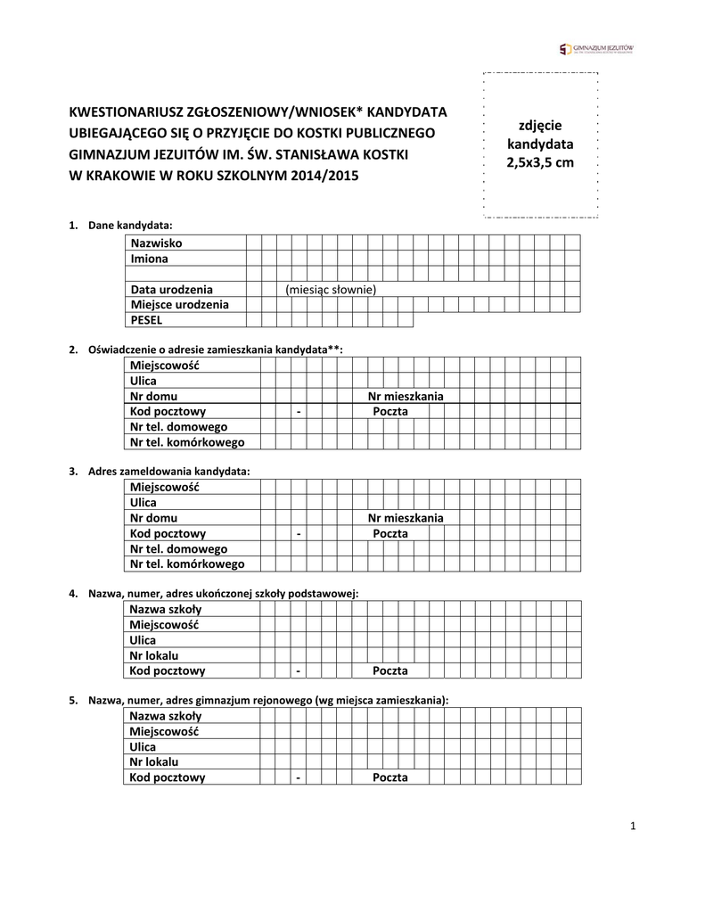 KWESTIONARIUSZ ZGŁOSZENIOWY/WNIOSEK* KANDYDATA UBIEGAJĄCEGO SIĘ O PRZYJĘCIE DO KOSTKI PUBLICZNEGO GIMNAZJUM JEZUITÓW IM. ŚW. STANISŁAWA KOSTKI W KRAKOWIE W ROKU SZKOLNYM 2014/2015 zdjęcie kandydata 2,5x3,5 cm 1. Dane kandydata: Nazwisko Imiona Data urodzenia Miejsce urodzenia PESEL (miesiąc słownie) Nr mieszkania Poczta Nr mieszkania Poczta 2. Oświadczenie o adresie zamieszkania kandydata**: Miejscowość Ulica Nr domu Kod pocztowy Nr tel. domowego Nr tel. komórkowego ‐ ‐ 3. Adres zameldowania kandydata: Miejscowość Ulica Nr domu Kod pocztowy Nr tel. domowego Nr tel. komórkowego 4. Nazwa, numer, adres ukończonej szkoły podstawowej: Nazwa szkoły Miejscowość Ulica Nr lokalu Kod pocztowy ‐ Poczta 5. Nazwa, numer, adres gimnazjum rejonowego (wg miejsca zamieszkania): Nazwa szkoły Miejscowość Ulica Nr lokalu Kod pocztowy ‐ Poczta 1 6. KOSTKA Publiczne Gimnazjum Jezuitów jest dla mnie szkołą: (właściwe zakreślić): a) I wyboru b) II wyboru c) III wyboru 7. Wskaż (w kratkach poniżej) według preferencji klasę z dodatkowymi godzinami w kolejności: od 1 – najbardziej oczekiwaną do 3 – najmniej oczekiwaną dla siebie: Matematyczno‐Informatyczna Biologiczno‐Chemiczna Językowa (ang.‐niem.) 8. Opisz w kilku zdaniach co sprawiło, że wybrałeś/aś klasę o takich programowych rozszerzeniach. Warto tutaj podzielić się swoimi zainteresowaniami, dotychczasowymi osiągnięciami np. w konkursach, przynależnością do stowarzyszeń, grup formacyjnych, zespołów itp. 9. Co zadecydowało, że wybrałeś/‐aś KOSTKĘ Publiczne Gimnazjum Jezuitów. Szkołę jezuicką, w której uczniów obowiązują zasady, a wśród nich szczególnie systematyczna praca, uczęszczanie na zajęcia uzupełniające, zajęcia dodatkowe, respektowanie norm zachowania zapisanych w Statucie Szkoły, Programie Wychowawczym Szkoły ‐ (krótko opisz) 10. Wskaż (w kratce poniżej) język obcy, którego chcesz się uczyć ( wiodący – kontynuacja po szkole podstawowej): j. angielski j. niemiecki 11. Wskaż (w kratce poniżej) drugi język obcy nowożytny, którego chcesz się uczyć: j. niemiecki __________________ (Grupy zostaną utworzone w zależności od liczby chętnych). 2 12. Dodatkowe zainteresowania pozaszkolne, hobby oraz udział w ruchach, zespołach bądź grupach duszpasterskich: 13. Dodatkowe informacje (orzeczenie o niepełnosprawności, opinia o specyficznych trudnościach w uczeniu się): 14. Adres zamieszkania rodziców / prawnych opiekunów: A. Matki: Nazwisko Imiona Miejscowość Ulica Nr domu Nr mieszkania Kod pocztowy ‐ Poczta Nr tel. domowego Nr tel. komórkowego Adres e‐mail B. Ojca: Nazwisko Imiona Miejscowość Ulica Nr domu Nr mieszkania Kod pocztowy ‐ Poczta Nr tel. domowego Nr tel. komórkowego Adres e‐mail 3 OŚWIADCZENIE Niniejszym oświadczam, że: 1.Wyrażam zgodę na przetwarzanie moich danych osobowych określonych w pkt. 6‐11 kwestionariusza kandydata przez KOSTKA Publiczne Gimnazjum Jezuitów im. Św. Stanisława Kostki w Krakowie z siedzibą przy ulicy Spółdzielców 5, 30‐682 Kraków, w celu przeprowadzenia rekrutacji. Przyjąłem do wiadomości, że powyższą zgodę mogę odwołać w każdym czasie Przyjąłem do wiadomości, że podanie danych w pozostałym zakresie jest obowiązkowe. …..…..…………………………………………………………/…………………………………………………………………………….. Data Podpisy obojga Rodziców/Opiekunów Prawnych 2. Wyrażam zgodę na umieszczenie imienia i nazwiska mojego dziecka na listach uczniów wywieszonych na tablicy ogłoszeń szkoły. …..…..…………………………………………………………/…………………………………………………………………………….. Data Podpisy obojga Rodziców/Opiekunów Prawnych 3. Zapoznałem się z treścią Statutu i Programu Wychowawczego Publicznego Gimnazjum Jezuitów im. Św. Stanisława Kostki, akceptuję ich treść i zobowiązuję się do ich przestrzegania i postępowania zgodnie z nimi. 4. Zobowiązuję się do czynnego zaangażowania w życie szkoły. 5. Jest mi znany i akceptuję katolicki charakter szkoły. Wyrażam/nie wyrażam zgody, aby moje dziecko uczęszczało na lekcje religii. 6. Dostarczę zestaw dokumentów jako załączniki do kwestionariusza (świadectwo ukończenia szkoły podstawowej oraz zaświadczenie OKE). …..…..…………………………………………………………/…………………………………………………………………………….. Data Podpisy obojga Rodziców/Opiekunów Prawnych ……………………………………………………………………………………………………………………….. Podpis ucznia * kwestionariusz zgłoszeniowy/wniosek ‐ Ustawa z dnia 6 grudnia 2013 r. o zmianie ustawy o systemie oświaty oraz niektórych innych ustaw art. 20v (Dz. U. z 2014 r. poz. 7). ** tamże art. 20e. 4 KOSTKA Publiczne Gimnazjum Jezuitów REGULAMIN REKRUTACJI KOSTKI Publicznego Gimnazjum Jezuitów im. Św. Stanisława Kostki w Krakowie na rok szkolny 2014/2015 Podstawa prawna: Ustawa z dnia 6 grudnia 2013 r. o zmianie ustawy o systemie oświaty oraz niektórych innych ustaw (Dz. U. z 2014 r. poz. 7). Decyzja Małopolskiego Kuratora Oświaty w Krakowie z dnia 3 lutego 2014 r. w sprawie terminów rekrutacji do gimnazjów, szkół ponadgimnazjalnych, terminów składania dokumentów i potwierdzenia woli podjęcia nauki w danej szkole, sposobów przeliczania na punkty ocen z języka polskiego i trzech wybranych zajęć edukacyjnych, wyników egzaminu gimnazjalnego oraz sposobów punktowania innych osiągnięć kandydatów na rok szkolny 2014/2015 w województwie małopolskim. Statut Kostki Publicznego Gimnazjum Jezuitów im. Św. Stanisława Kostki w Krakowie. UWAGA! KOSTKA Publiczne Gimnazjum Jezuitów w Krakowie nie jest objęte systemem rekrutacji elektronicznej Urz