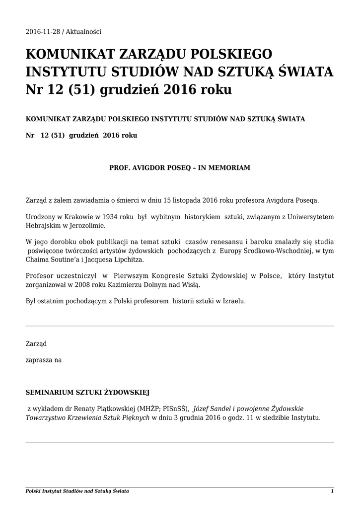 2016-11-28 / Aktualności KOMUNIKAT ZARZĄDU POLSKIEGO INSTYTUTU STUDIÓW NAD SZTUKĄ ŚWIATA Nr 12 (51) grudzień 2016 roku KOMUNIKAT ZARZĄDU POLSKIEGO INSTYTUTU STUDIÓW NAD SZTUKĄ ŚWIATA Nr 12 (51) grudzień 2016 roku PROF. AVIGDOR POSEQ – IN MEMORIAM Zarząd z żalem zawiadamia o śmierci w dniu 15 listopada 2016 roku profesora Avigdora Poseqa. Urodzony w Krakowie w 1934 roku był wybitnym historykiem sztuki, związanym z Uniwersytetem Hebrajskim w Jerozolimie. W jego dorobku obok publikacji na temat sztuki czasów renesansu i baroku znalazły się studia poświęcone twórczości artystów żydowskich pochodzących z Europy Środkowo-Wschodniej, w tym Chaima Soutine’a i Jacquesa Lipchitza. Profesor uczestniczył w Pierwszym Kongresie Sztuki Żydowskiej w Polsce, który Instytut zorganizował w 2008 roku Kazimierzu Dolnym nad Wisłą. Był ostatnim pochodzącym z Polski profesorem historii sztuki w Izraelu. Zarząd zaprasza na SEMINARIUM SZTUKI ŻYDOWSKIEJ z wykładem dr Renaty Piątkowskiej (MHŻP; PISnSŚ), Józef Sandel i powojenne Żydowskie Towarzystwo Krzewienia Sztuk Pięknych w dniu 3 grudnia 2016 o godz. 11 w siedzibie Instytutu. Polski Instytut Studiów nad Sztuką Świata 1 SPRAWOZDANIE Z KONFERENCJI SZTUKA POLSKA NA ZIEMIACH ZACHODNICH I PÓŁNOCNYCH OD 1981 R. DO WSPÓŁCZESNOŚCI. (WROCŁAW, 21-22. 11. 2016) W dniach 21-22 listopada 2016 roku odbyła się w Muzeum Architektury konferencja Sztuka polska na Ziemiach Zachodnich i Północnych od 1981 r. do współczesności. Zorganizowana została przez Instytut Historii Sztuki Uniwersytetu Wrocławskiego – czyli prof. Annę Markowską i jej doktorantki: Reginę Kulik, Katarzynę Matuszczyk-Lu oraz Zośkę Reznik – oraz Polski Instytut Studiów nad Sztuką Świata. Była to druga część konferencji. Jej pierwsza edycja dotyczyła okresu wcześniejszego, lat 1945-1980. Chronologiczna cezura wskazywała na moment załamania się konsensusowego ułożenia z władzą, co zmieniło temat, formę oraz obieg sztuk wizualnych. Notabene, na rezultaty w dziedzinie architektury trzeba było poczekać dłużej, gdyż akurat w tej dziedzinie zmiany nie były już w latach 80. tak wyraźne. Obie konferencje uznać należy za pionierskie, gdy chodzi o kompleksową i gruntowną, naukową refleksję o sztuce na tzw. Ziemiach Odzyskanych. Choć bowiem bieżące krytyczne monitorowanie-modelowanie sztuki owocowało w dobie PRL-u przeglądami typu Wystawa Plastyki Ziem Nadodrzańskich (1959), to naukowa refleksja historyczno-artystyczna skłaniała się raczej do uniwersalistycznych tez, pisanych z reguły z punktu widzenia Warszawy czy Krakowa. Metodę tę kontynuował nawet Piotr Piotrowski, najwybitniejszy znawca i metodolog powojennej sztuki Europy Środkowej, wpisując w taki model bliskich mu – z racji miejsca zamieszkania – artystów poznańskich. Proponując tzw. horyzontalną historię sztuki zdekonstruował więc raczej relacje między wielkimi zachodnimi centrami (Paryż, Nowy Jork) a Polską, wskazując na żywotność powiązań Warszawy, Krakowa czy Poznania z takimi ośrodkami jak m. in. Praga czy Budapeszt. W tym ujęciu Ziemie Zachodnie i Północne czekają więc dopiero na wdrożenie horyzontalnej metody Piotrowskiego, a przymiarką do tych działań były właśnie obie konferencje. Choć cezura stanu wojennego była graniczną datą dla całej Polski, celem obrad było m.in. przyjrzenie się czy i na ile specyfika Ziem Zachodnich i Północnych okazała się ważna dla sztuki także w okresie transformacji politycznej, po narodzinach III Rzeczpospolitej. Nie chodziło bynajmniej jedynie o oczywiste konstatacje, iż w dobie komunistycznego centralizmu peryferyjne ziemie zachodnie i północne traktowane były inaczej niż centralne, a wejście Polski do Unii Europejskiej i ułatwienia w podróżowaniu spowodowały, iż mieszkańcy Wrocławia czy Szczecina zainteresowani sztuką współczesną częściej wybierali się na wystawy do Berlina niż np. do Warszawy. Wejście do Unii (2004) zmieniło bowiem w istocie mapowanie kultury, zachęcając do jej transnarodowego badania. Na dwudniowe obrady, oprócz wrocławian (reprezentujących Uniwersytet Wrocławski), przybyła liczna ekipa referentów z takich ośrodków ja Szczecin (Zachodniopomorski Uniwersytet Technologiczny w Szczecinie) i Gdańsk (Akademia Sztuk Pięknych). W sumie uczestniczyło aktywnie 33 badaczy, w tym reprezentanci (poza wymienionymi już instytucjami) takich placówek naukowych jak: Uniwersytet Łódzki, Politechnika Białostocka, poznański Uniwersytet Adama Mickiewicza, Katolicki Uniwersytet Lubelski, Akademia Pomorska w Słupsku oraz Uniwersytet Jagielloński. Dyskutanci zastanawiali się nad metodologią, podnosząc m.in. konieczność opisywania kontekstu polskiej modernizacji, transnarodowego podejścia do historii i zalety budowania lokalnej tożsamości w oparciu o kulturę sięgającą czasu sprzed 1945 roku, gdy omawiane ziemie należały do Niemiec. Polski Instytut Studiów nad Sztuką Świata 2 Zastanawiano się czy wielokulturowość Dolnego Śląska – także powojenna, ze względu na osiedlanie się tam społeczności żydowskiej, greckiej, ukraińskiej czy łemkowskiej – znalazła adekwatny wyraz w badaniach nad sztuką. Zwracano również uwagę na konieczność policentrycznego widzenia polskiej kultury, testując nawet w jej ramach koncepcję kolonializmu wewnętrznego. W pierwszym dniu obrad dominowała tematyka architektoniczna. Drugi dzień poświęcony został sztukom wizualnym. Osobny panel dotyczył sztuki z punktu widzenia samych artystów, którzy opowiadali o swoich doświadczeniach i realizacjach artystycznych. Prof. Anna Markowska ---------------------------------------------------------------------------------------------------------------------------ZAPOWIEDŹ VII KONFERENCJI SZTUKI NOWOCZESNEJ W TORUNIU FORMIŚCI - BUNT - JUNG IDYSZ. W STULECIE POLSKIEJ AWANGARDY ARTYSTYCZNEJ FORMISTS - BUNT - YUNG YID