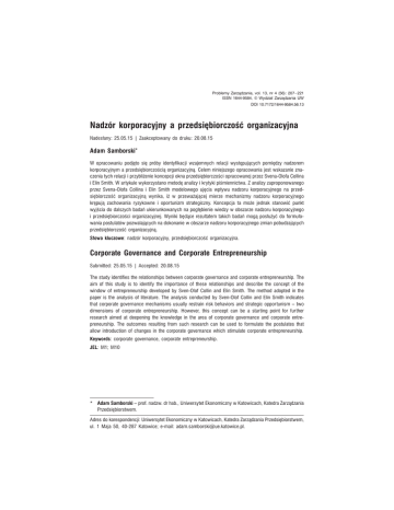 Problemy ZarzÈdzania, vol. 13, nr 4 (56): 207 – 221 ISSN 1644-9584, © Wydziaï ZarzÈdzania UW DOI 10.7172/1644-9584.56.13 Nadzór korporacyjny ab przedsiÚbiorczoĂÊ organizacyjna Nadesïany: 25.05.15 | Zaakceptowany do druku: 20.08.15 Adam Samborski* W opracowaniu podjÚto siÚ próby identyfikacji wzajemnych relacji wystÚpujÈcych pomiÚdzy nadzorem korporacyjnym abprzedsiÚbiorczoĂciÈ organizacyjnÈ. Celem niniejszego opracowania jest wskazanie znaczenia tych relacji ibprzybliĝenie koncepcji okna przedsiÚbiorczoĂci opracowanej przez Svena-Olofa Collina ibElin Smith. W artykule wykorzystano metodÚ analizy ibkrytyki piĂmiennictwa. Z analizy zaproponowanego przez Svena-Olofa Collina ib Elin Smith modelowego ujÚcia wpïywu nadzoru korporacyjnego na przedsiÚbiorczoĂÊ organizacyjnÈ wynika, iĝ wb przewaĝajÈcej mierze mechanizmy nadzoru korporacyjnego krÚpujÈ zachowania ryzykowne ib oportunizm strategiczny. Koncepcja ta moĝe jednak stanowiÊ punkt wyjĂcia do dalszych badañ ukierunkowanych na pogïÚbienie wiedzy wbobszarze nadzoru korporacyjnego ib przedsiÚbiorczoĂci organizacyjnej. Wyniki bÚdÈce rezultatem takich badañ mogÈ posïuĝyÊ do formuïowania postulatów pozwalajÈcych na dokonanie wbobszarze nadzoru korporacyjnego zmian pobudzajÈcych przedsiÚbiorczoĂÊ organizacyjnÈ. Sïowa kluczowe: nadzór korporacyjny, przedsiÚbiorczoĂÊ organizacyjna. Corporate Governance and Corporate Entrepreneurship Submitted: 25.05.15 | Accepted: 20.08.15 The study identifies the relationships between corporate governance and corporate entrepreneurship. The aim of this study is to identify the importance of these relationships and describe the concept of the window of entrepreneurship developed by Sven-Olof Collin and Elin Smith. The method adopted in the paper is the analysis of literature. The analysis conducted by Sven-Olof Collin and Elin Smith indicates that corporate governance mechanisms usually restrain risk behaviors and strategic opportunism – two dimensions of corporate entrepreneurship. However, this concept can be ab starting point for further research aimed at deepening the knowledge in the area of corporate governance and corporate entrepreneurship. The outcomes resulting from such research can be used to formulate the postulates that allow introduction of changes in the corporate governance which stimulate corporate entrepreneurship. Keywords: corporate governance, corporate entrepreneurship. JEL: M1; M10 * Adam Samborski – prof. nadzw. dr hab., Uniwersytet Ekonomiczny wbKatowicach, Katedra ZarzÈdzania PrzedsiÚbiorstwem. Adres do korespondencji: Uniwersytet Ekonomiczny wbKatowicach, Katedra ZarzÈdzania PrzedsiÚbiorstwem, ul. 1 Maja 50, 40-287 Katowice; e-mail: [email protected]. Adam Samborski 1. Wprowadzenie Zdaniem Svena-Olofa Collina ib Elin Smith kompleksowa teoria przedsiÚbiorstwa powinna podejmowaÊ wb tym samym stopniu problemy dwóch niezwykle waĝnych procesów organizacyjnych, abmianowicie wïadania (governance) wbfirmie ibrozwoju firmy. Te dwa procesy organizacyjne zostaïy opracowane na gruncie róĝnych koncepcji wb teorii przedsiÚbiorstwa – nadzoru korporacyjnego ibprzedsiÚbiorczoĂci organizacyjnej – choÊ wbpraktyce procesy te wyraěnie siÚ splatajÈ. Integracja tych dwóch obszarów literatury to nieïatwe przedsiÚwziÚcie, które wykracza rozmiarami poza rygory wydawnicze przyjÚte wbczasopiĂmie. Opracowanie zostanie wiÚc ograniczone jedynie do identyfikacji wzajemnych relacji wystÚpujÈcych pomiÚdzy nadzorem korporacyjnym abprzedsiÚbiorczoĂciÈ organizacyjnÈ. Celem niniejszego opracowania jest wskazanie znaczenia tych relacji ib przybliĝenie koncepcji okna przedsiÚbiorczoĂci opracowanej przez Svena-Olofa Collina ib Elin Smith (Collin ibSmith, 2003a; 2003b; 2003c; 2003d; 2007). Okno przedsiÚbiorczoĂci wyraĝa tymczasowy charakter przedsiÚbiorczoĂci. Oznacza to, ĝe przedsiÚbiorstwo moĝe otworzyÊ siÚ lub zamknÈÊ na dziaïania przedsiÚbiorcze. Uzaleĝnione jest to od interpretacji kwestii strategicznych, takich jak szanse ibzagroĝenia wystÚpujÈce wbĂrodowisku zewnÚtrznym czy ĂwiadomoĂci siïy bÈdě sïaboĂci organizacji. Otwarciu okna przedsiÚbiorczoĂci mogÈ sprzyjaÊ mechanizmy nadzoru korporacyjnego (Collin ib Smith, 2003b). Nie sposób nie zgodziÊ siÚ zb Bratnickim, iĝ „PrzedsiÚbiorczy rozwój organizacji jest krytyczny dla tworzenia bogactwa, ale pozostaje bardziej wyjÈtkiem niĝ reguïÈ ib dlatego zrozumienie procesów, które go napÚdzajÈ, jest waĝnym zagadnieniem zarówno teoretycznym, jak ibpraktycznym” (Bratnicki, 2011). Badania dotyczÈce zwiÈzków pomiÚdzy przedsiÚbiorczoĂciÈ organizacyjnÈ ab nadzorem korporacyjnym moĝna teĝ znaleěÊ wb pracach: Covin ib Slevin (1991), Zahra (1996), Hagen, Emmanuel ib Alshare (2005), Tribbitt (2012) czy Albu ib Mateescu (2015). 2. PrzedsiÚbiorstwo wb ujÚciu teoretycznym Teoria przedsiÚbiorstwa jest problematykÈ niezwykle zïoĝonÈ. Na gruncie literatury przedmiotu moĝna dostrzec róĝnice wbpodejĂciach do firmy, wbdefiniowaniu podobieñstw ibróĝnic miÚdzy nimi. Na kanwie rozwaĝañ teoretycznych ciÈgle poszukuje siÚ odpowiedzi na pytania, czym jest przedsiÚbiorstwo, dlaczego siÚ je ustanawia, czym siÚ zajmuje, jak funkcjonuje. Stawia siÚ pytania obsens istnienia firmy, obdeterminanty jej granic ibwewnÚtrznej struktury. Nowe teorie sÈ albo zaprzeczeniem poprzednich, albo teĝ ich rozwiniÚciem. CzÚsto jednak nie tylko sama teoria, ale równieĝ ramy dociekañ ulegajÈ zmianie, co niezwykle utrudnia porównanie poszczególnych idei (Balázs, 2012). Badacze zajmujÈcy siÚ teoriÈ przedsiÚbiorstwa, pomimo wspomnia208 DOI 10.7172/1644-9584.56.13 Nadzór korporacyjny ab przedsiÚbiorczoĂÊ organizacyjna nych trudnoĂci, starajÈ siÚ pogrupowaÊ wypracowane na przestrzeni lat koncepcje. CiekawÈ propozycjÚ systematyzacji teorii przedsiÚbiorstw przedstawiï Frédéric Sautet (2003). Na podstawie literatur