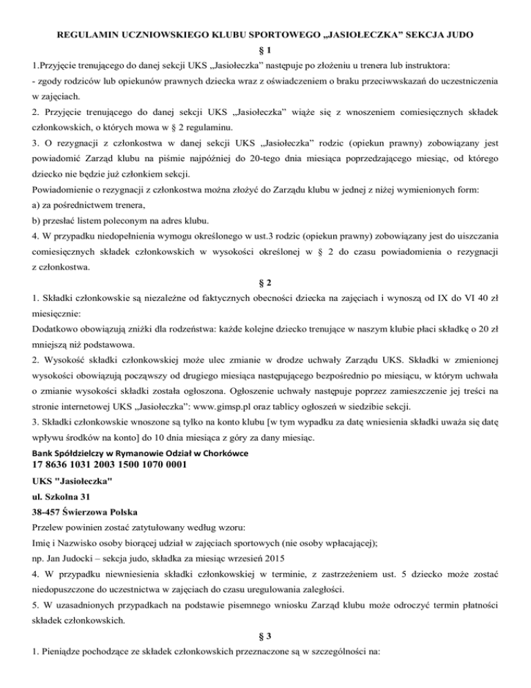 REGULAMIN UCZNIOWSKIEGO KLUBU SPORTOWEGO „JASIOŁECZKA” SEKCJA JUDO §1 1.Przyjęcie trenującego do danej sekcji UKS „Jasiołeczka” następuje po złożeniu u trenera lub instruktora: - zgody rodziców lub opiekunów prawnych dziecka wraz z oświadczeniem o braku przeciwwskazań do uczestniczenia w zajęciach. 2. Przyjęcie trenującego do danej sekcji UKS „Jasiołeczka” wiąże się z wnoszeniem comiesięcznych składek członkowskich, o których mowa w § 2 regulaminu. 3. O rezygnacji z członkostwa w danej sekcji UKS „Jasiołeczka” rodzic (opiekun prawny) zobowiązany jest powiadomić Zarząd klubu na piśmie najpóźniej do 20-tego dnia miesiąca poprzedzającego miesiąc, od którego dziecko nie będzie już członkiem sekcji. Powiadomienie o rezygnacji z członkostwa można złożyć do Zarządu klubu w jednej z niżej wymienionych form: a) za pośrednictwem trenera, b) przesłać listem poleconym na adres klubu. 4. W przypadku niedopełnienia wymogu określonego w ust.3 rodzic (opiekun prawny) zobowiązany jest do uiszczania comiesięcznych składek członkowskich w wysokości określonej w § 2 do czasu powiadomienia o rezygnacji z członkostwa. §2 1. Składki członkowskie są niezależne od faktycznych obecności dziecka na zajęciach i wynoszą od IX do VI 40 zł miesięcznie: Dodatkowo obowiązują zniżki dla rodzeństwa: każde kolejne dziecko trenujące w naszym klubie płaci składkę o 20 zł mniejszą niż podstawowa. 2. Wysokość składki członkowskiej może ulec zmianie w drodze uchwały Zarządu UKS. Składki w zmienionej wysokości obowiązują począwszy od drugiego miesiąca następującego bezpośrednio po miesiącu, w którym uchwała o zmianie wysokości składki została ogłoszona. Ogłoszenie uchwały następuje poprzez zamieszczenie jej treści na stronie internetowej UKS „Jasiołeczka”: www.gimsp.pl oraz tablicy ogłoszeń w siedzibie sekcji. 3. Składki członkowskie wnoszone są tylko na konto klubu [w tym wypadku za datę wniesienia składki uważa się datę wpływu środków na konto] do 10 dnia miesiąca z góry za dany miesiąc. Bank Spółdzielczy w Rymanowie Odział w Chorkówce 17 8636 1031 2003 1500 1070 0001 UKS "Jasiołeczka" ul. Szkolna 31 38-457 Świerzowa Polska Przelew powinien zostać zatytułowany według wzoru: Imię i Nazwisko osoby biorącej udział w zajęciach sportowych (nie osoby wpłacającej); np. Jan Judocki – sekcja judo, składka za miesiąc wrzesień 2015 4. W przypadku niewniesienia składki członkowskiej w terminie, z zastrzeżeniem ust. 5 dziecko może zostać niedopuszczone do uczestnictwa w zajęciach do czasu uregulowania zaległości. 5. W uzasadnionych przypadkach na podstawie pisemnego wniosku Zarząd klubu może odroczyć termin płatności składek członkowskich. §3 1. Pieniądze pochodzące ze składek członkowskich przeznaczone są w szczególności na: a) wynajem sali do zajęć judo; b) wynagrodzenie trenerów; c) zakup sprzętu sportowego niezbędnego do prowadzenia treningu judo; d) promocję klubu w mediach; e) opłaty statutowe w Polskim Związku Judo oraz Podkarpackim Okręgowym Związku Judo; f) dofinansowanie udziału dzieci na zawodach; g) opłaty biurowe i administrację klubu. 2. O wysokości dofinansowania udziału dzieci na zawodach decyduje Zarząd Klubu w drodze uchwały. Kwota dofinansowania uzależniona jest od rangi zawodów i klasy zawodników. §4 1. Zawodnik sekcji judo klubu UKS „Jasiołeczka” zobowiązany jest w szczególności do: a) przestrzegania zasad bezpieczeństwa określonych w regulaminie salach treningowych sekcji judo klubu UKS "Jasiołeczka"; b) kulturalnego zachowania się na terenie budynku, w którym odbywają się treningi; c) kulturalnego zachowania się wobec trenerów, kolegów i koleżanek z sekcji, wszystkich pracowników szkoły, w których odbywają się treningi oraz pozostałych osób; d) kulturalnego zachowania się na zawodach judo; e) wykonywania poleceń wydanych przez trenera; f) rzetelnego i sumiennego uczestnictwa w zajęciach; g) informowania trenera o problemach zdrowotnych (zawrotach, bólach głowy, itp.); h) uzyskania zgody trenera na każdorazowe opuszczenie sali treningowej judo (wyjście do łazienki, szatni itp.); i) dbania o sprzęt sportowy; j) posiadania podczas treningu odpowiedniego stroju sportowego (judogi, koszulki, spodenki, dresy bez suwaków) k) udziału w zawodach, do których został wytypowany przez trenera; l) występowania na zawodach w stroju klubowym (judogi z naszywkami klubu, koszulka klubowa, dresy klubowe); m) godnego reprezentowania klubu na zewnątrz. 2. Trenerzy sekcji mogą wyciągnąć konsekwencje wobec zawodników naruszających obowiązki określone w ust. 1 poprzez: a) upomnienie, b) upomnienie przy całej grupie, c) upomnienie w obecności rodzica, d) usunięcie zawodnika z zajęć, e) niezgłoszenie zawodnika do zawodów, f) wycofanie zawodnika ze startu w zawodach, z konsekwencjami finansowymi z tego wynikającymi, g) złożenie do Zarządu klubu wniosku o czasowe zawieszenie w prawach zawodnika. §5 1. Zarząd Klubu zobowiązuje wszystkie osoby uczęszczające na zajęcia sportowe w klubie UKS "Jasiołeczka" do posiadania ważnych badań lekarskich (badania osób biorących udział w zawodach muszą być poświadczone przez lekarza sportowego) oraz ubezpieczenia NNW rozszerzonego o zwrot kosztów leczenia, którego zakres obejmuje także zajęcia sportów walki.