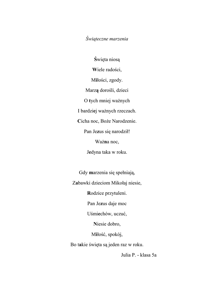 Świąteczne marzenia Święta niosą Wiele radości, Miłości, zgody. Marzą dorośli, dzieci O tych mniej waŜnych I bardziej waŜnych rzeczach. Cicha noc, BoŜe Narodzenie. Pan Jezus się narodził! WaŜna noc, Jedyna taka w roku. Gdy marzenia się spełniają, Zabawki dzieciom Mikołaj niesie, Rodzice przytuleni. Pan Jezus daje moc Uśmiechów, uczuć, Niesie dobro, Miłość, spokój, Bo takie święta są jeden raz w roku. Julia P. - klasa 5a
