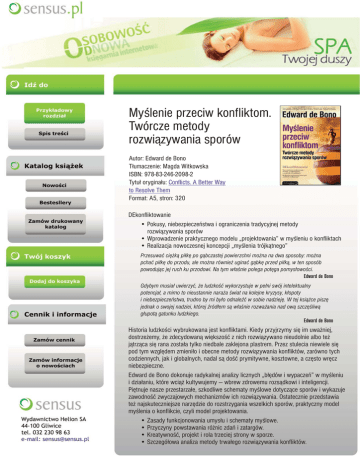 Myœlenie przeciw konfliktom. Twórcze metody rozwi¹zywania sporów Autor: Edward de Bono T³umaczenie: Magda Witkowska ISBN: 978-83-246-2098-2 Tytu³ orygina³u: Conflicts. A Better Way to Resolve Them Format: A5, stron: 320 DEkonfliktowanie • Pokusy, niebezpieczeñstwa i ograniczenia tradycyjnej metody rozwi¹zywania sporów • Wprowadzenie praktycznego modelu „projektowania” w myœleniu o konfliktach • Realizacja nowoczesnej koncepcji „myœlenia trójk¹tnego” Przesuwaæ ciê¿k¹ pi³kê po g¹bczastej powierzchni mo¿na na dwa sposoby: mo¿na pchaæ pi³kê do przodu, ale mo¿na równie¿ uginaæ g¹bkê przed pi³k¹, w ten sposób powoduj¹c jej ruch ku przodowi. Na tym w³aœnie polega potêga pomys³owoœci. Edward de Bono Gdybym musia³ uwierzyæ, ¿e ludzkoœæ wykorzystuje w pe³ni swój intelektualny potencja³, a mimo to nieustannie nara¿a œwiat na kolejne kryzysy, k³opoty i niebezpieczeñstwa, trudno by mi by³o odnaleŸæ w sobie nadziejê. W tej ksi¹¿ce piszê jednak o swojej nadziei, której Ÿród³em s¹ w³aœnie rozwa¿ania nad ow¹ szczêœliw¹ g³upot¹ gatunku ludzkiego. Edward de Bono Historia ludzkoœci wybrukowana jest konfliktami. Kiedy przyjrzymy siê im uwa¿niej, dostrze¿emy, ¿e zdecydowan¹ wiêkszoœæ z nich rozwi¹zywano nieudolnie albo te¿ j¹trz¹ca siê rana zosta³a tylko niedbale zaklejona plastrem. Przez stulecia niewiele siê pod tym wzglêdem zmieni³o i obecne metody rozwi¹zywania konfliktów, zarówno tych codziennych, jak i globalnych, nadal s¹ doœæ prymitywne, kosztowne, a czêsto wrêcz niebezpieczne. Edward de Bono dokonuje radykalnej analizy licznych „b³êdów i wypaczeñ” w myœleniu i dzia³aniu, które wci¹¿ kultywujemy — wbrew zdrowemu rozs¹dkowi i inteligencji. Piêtnuje nasze przestarza³e, szkodliwe schematy myœlowe dotycz¹ce sporów i wykazuje zawodnoœæ zwyczajowych mechanizmów ich rozwi¹zywania. Ostatecznie przedstawia te¿ najskuteczniejsze narzêdzie do rozstrzygania wszelkich sporów, praktyczny model myœlenia o konflikcie, czyli model projektowania. • Zasady funkcjonowania umys³u i schematy myœlowe. • Przyczyny powstawania ró¿nic zdañ i zatargów. • Kreatywnoœæ, projekt i rola trzeciej strony w sporze. • Szczegó³owa analiza metody trwa³ego rozwi¹zywania konfliktów. Spis treści O autorze Prolog 5 7 Wprowadzenie 9 Część I Zasady funkcjonowania umysłu i schematy myślowe 15 1 Dlaczego dobrze jest wiedzieć, jak funkcjonuje umysł 2 Cóż jest złego w sporze? 17 33 3 Tworzenie mapy, myślenie i Myśleć-2 49 4 Walka, negocjacje, rozwiązywanie problemu czy projektowanie? 63 Część II Dlaczego między ludźmi występują różnice zdań? 77 5 Dlaczego między ludźmi występują różnice zdań? Ponieważ ludzie mogą w różny sposób postrzegać te same kwestie 79 6 Dlaczego między ludźmi występują różnice zdań? Ponieważ ludzie pragną różnych rzeczy 97 7 Dlaczego między ludźmi występują różnice zdań? Ponieważ sprzyja temu ich styl myślenia 115 8 Dlaczego między ludźmi występują różnice zdań? Ponieważ tego się właśnie wszyscy spodziewają 125 4 MYŚLENIE PRZECIW KONFLIKTOM Część III Kreatywność, projekt i rola strony trzeciej 133 9 Projekt 135 10 Dlaczego zwaśnionym stronom tak trudno jest znaleźć rozwiązanie dzielącego je sporu? 153 11 Ciągłość 167 12 Cele, korzyści i wartości 13 Kreatywność 181 187 14 Rola strony trzeciej w konflikcie Część IV Konflikt 15 Modele konfliktu 16 Czynniki konfliktu 205 221 223 233 17 Czynniki konfliktu — strach 18 Czynniki konfliktu — siła 235 241 19 Czynniki konfliktu — sprawiedliwość 20 Czynniki konfliktu — środki 21 Postawa wobec konfliktu 249 257 261 Część V Struktury mające uczestniczyć w rozwiązywaniu konfliktów 269 22 Dlaczego aktualnie istniejące struktury nie radzą sobie z rozwiązywaniem konfliktów 271 23 SITO Epilog 297 317 ROZDZIAŁ 4 Walka, negocjacje, rozwiązywanie problemu czy projektowanie? Precyzyjne zdefiniowanie modelu myślenia konfliktowego ma niezwykle istotne znaczenie. Trzeba zatem określić, z jakiego rodzaju działaniem mamy do czynienia. Czy jest to walka, negocjacje, rozwiązywanie problemu, czy projektowanie? Gotowy jestem zgodzić się ze stwierdzeniem, że rzadko się zdarza, abyśmy w danego rodzaju sytuacji mieli do czynienia z jednym (i tylko jednym) z wymienionych powyżej zjawisk. Możemy mieć oczywiście do czynienia z konkretnym problemem wymagającym rozwiązania, np. z zanieczyszczeniem jeziora. W innym przypadku w grę wchodzić może typowa sytuacja negocjacyjna — gdy chodzi na przykład o dyskusję na temat poziomu płac, która wymaga uwzględniania kilku złożonych czynników. Chciałbym jednak, abyśmy zapomnieli na chwilę o tych nielicznych wyjątkach i spojrzeli na zagadnienie myślenia konfliktowego w sposób bardziej ogólny. Poza nielicznymi wyjątkami, o których mowa powyżej, możemy zwykle sami zdecydować, przez pryzmat którego modelu chcemy patrzeć na daną sytuację konfliktową. Możemy zatem zdecydować, że wszystkie konflikty rozpatrywać będziemy w kategoriach walki. Takie założenie odnosić się będzie wówczas 64 MYŚLENIE PRZECIW KONFLIKTOM nie tylko do samego konfliktu (który w istocie może nabrać charakteru prawdziwej walki), ale również do procesów myślowych przeprowadzanych w celu jego rozwiązania. Tak naprawdę właśnie to mnie martwi. Skoro konflikt jest walką, to czy proces myślenia, który go dotyczy, też musi nią być? Wydaje się to oczywiste i naturalne — tymczasem nie ma żadnego argumentu, który uzasadniałby takie podejście (być może za wyjątkiem kwestii ciągłości, do której wrócimy jeszcze w dalszej części naszych rozważań). Model walki opiera się na retoryce wojennej. Mamy tu do czynienia z taktyką i strategią. Mamy pozycje atakujące i obronne, mamy do czynienia z odwrotem. Mówimy o zdobywaniu i utracie terenu. O słabych punkta