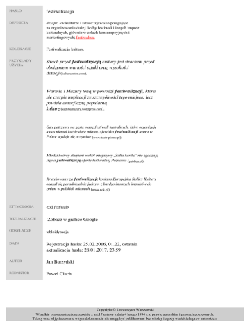 HASŁO festiwalizacja DEFINICJA dezapr. «w kulturze i sztuce: zjawisko polegające na organizowaniu dużej liczby festiwali i innych imprez kulturalnych, głównie w celach konsumpcyjnych i marketingowych; festiwaloza» KOLOKACJE Festiwalizacja kultury. PRZYKŁADY UŻYCIA Strach przed festiwalizacją kultury jest strachem przed obniżeniem wartości sztuki oraz wysokości dotacji (kulturaenter.com). Warmia i Mazury toną w powodzi festiwalizacji, która nie czerpie inspiracji ze szczególności tego miejsca, lecz powiela amorficzną popularną kulturę (sadybamazury.wordpress.com). Gdy patrzymy na gęstą mapę festiwali teatralnych, które organizuje u nas niemal każde duże miasto, zjawisko festiwalizacji teatru w Polsce wydaje się oczywiste (www.teatr-pismo.pl). Młodzi twórcy skupieni wokół inicjatywy „Żółta kartka” nie zgadzają się na festiwalizację oferty kulturalnej Poznania (publica.pl). Krytykowany za festiwalizację konkurs Europejska Stolicy Kultury okazał się paradoksalnie jednym z bardzo istotnych impulsów do zmian w polskich miastach (www.nck.pl). ETYMOLOGIA WIZUALIZACJE <od festiwal> Zobacz w grafice Google ODSYŁACZE tabloidyzacja DATA Rejestracja hasła: 25.02.2016, 01.22, ostatnia aktualizacja hasła: 28.01.2017, 23.59 AUTOR Jan Burzyński REDAKTOR Paweł Ciach Copyright © Uniwersytet Warszawski Wszelkie prawa zastrzeżone zgodnie z art.17 ustawy z dnia 4 lutego 1994 r. o prawie autorskim i prawach pokrewnych. Teksty oraz zdjęcia zawarte w tym dokumencie nie mogą być publikowane bez wiedzy i zgody właściciela praw autorskich. Powered by TCPDF (www.tcpdf.org)