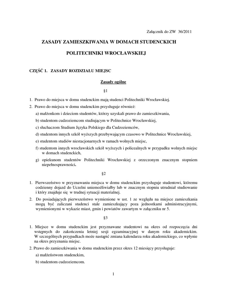 Załącznik do ZW 36/2011 ZASADY ZAMIESZKIWANIA W DOMACH STUDENCKICH POLITECHNIKI WROCŁAWSKIEJ CZĘŚĆ 1. ZASADY ROZDZIAŁU MIEJSC Zasady ogólne §1 1. Prawo do miejsca w domu studenckim mają studenci Politechniki Wrocławskiej. 2. Prawo do miejsca w domu studenckim przysługuje również: a) małżonkom i dzieciom studentów, którzy uzyskali prawo do zamieszkiwania, b) studentom cudzoziemcom studiującym w Politechnice Wrocławskiej, c) słuchaczom Studium Języka Polskiego dla Cudzoziemców, d) studentom innych szkół wyższych przebywającym czasowo w Politechnice Wrocławskiej, e) studentom studiów niestacjonarnych w ramach wolnych miejsc, f) studentom innych wrocławskich szkół wyższych i policealnych w przypadku wolnych miejsc w domach studenckich, g) opiekunom studentów Politechniki Wrocławskiej z orzeczonym znacznym stopniem niepełnosprawności. §2 1. Pierwszeństwo w przyznawaniu miejsca w domu studenckim przysługuje studentowi, któremu codzienny dojazd do Uczelni uniemożliwiałby lub w znacznym stopniu utrudniał studiowanie i który znajduje się w trudnej sytuacji materialnej. 2. Do posiadających pierwszeństwo wymienione w ust. 1 ze względu na miejsce zamieszkania mogą być zaliczani studenci stale zamieszkujący poza jednostkami administracyjnymi, wymienionymi w wykazie miast, gmin i powiatów zawartym w załączniku nr 5. §3 1. Miejsce w domu studenckim jest przyznawane studentowi na okres od rozpoczęcia dni wstępnych do zakończenia letniej sesji egzaminacyjnej w danym roku akademickim. W szczególnych przypadkach może nastąpić zmiana kalendarza roku akademickiego, co wpłynie na okres przyznania miejsc. 2. Prawo do zamieszkiwania w domu studenckim przez okres 12 miesięcy przysługuje: a) małżeństwom studenckim, b) studentom cudzoziemcom. 1 3. Studenci ostatniego roku mają prawo do zamieszkiwania w domu studenckim do dnia egzaminu dyplomowego, nie dłużej jednak niż do 15 lipca. 4. Studenci uprawnieni do zamieszkiwania w domach studenckich w okresie wakacji są kierowani do domów pełniących dyżur wakacyjny. §4 1. Skierowania do domów studenckich dla osób wymienionych w § 1 ust. 2 wydaje Dział Studencki na podstawie zgłoszeń jednostek organizacyjnych Uczelni oraz wniosków indywidualnych. Rozdział miejsc w domach studenckich §5 1. Z ogólnej liczby miejsc w domach studenckich we Wrocławiu wydziela się: a) miejsca dla małżeństw studenckich, b) miejsca rezerwowane dla cudzoziemców. 2. Spośród pozostałych miejsc przeznaczonych do rozdziału wydziela się: a) miejsca dla studentów pierwszego roku w ilości 20%, b) miejsca dla studentów wyższych lat w ilości 75%, c) rezerwę na odwołania dla dziekanów w ilości 3%, d) rezerwę na odwołania dla Prorektora ds. Studenckich w ilości 2%. 3. Miejsca dla cudzoziemców rezerwuje się na podstawie zapotrzebowań zgłoszonych przez Dział Rekrutacji i Dział Współpracy Międzynarodowej oraz Studium Języka Polskiego dla Cudzoziemców w terminie do dnia 31 maja. Do 9 września Dział Współpracy Międzynarodowej potwierdza liczbę zarezerwowanych miejsc oraz dostarcza imienną listę kandydatów na studia. Informacje potwierdzające przyjazd studentów na semestr letni wraz z imiennymi listami należy przekazać do 31 stycznia. 4. Wykazy miejsc w domach studenckich we Wrocławiu na dany rok akademicki oraz podział miejsc zatwierdza Prorektor ds. Studenckich w terminie do 10 czerwca. 5. Rozdział miejsc w domach studenckich w Zamiejscowych Ośrodkach Dydaktycznych określają dyrektorzy Zamiejscowych Ośrodków Dydaktycznych. Kryteria przydziału miejsc w domach studenckich §6 1. Miejsca dla studentów, obywateli polskich, przyznawane są na podstawie punktowej oceny sytuacji studenta. 2. Punktowa ocena sytuacji studenta uwzględnia: a) sytuację materialną, b) miejsce stałego zamieszkania, c) wyniki w nauce, d) inne czynniki uzupełniające: rok studiów, kontynuacja zamieszkania w domu studenckim, pracę na rzecz wydziału, pracę na rzecz Samorządu Studenckiego, sytuację rodzinną małżeństw studenckich. 2 3. Zasady ustalania liczby punktów są określone w załączniku nr 4. §7 1. Sytuacja materialna studenta jest punktowana na podstawie średniego miesięcznego dochodu netto na osobę w rodzinie, ustalonego na zasadach określonych przez Regulamin Pomocy Materialnej dla decyzji o przyznaniu stypendium socjalnego. 2. Punkty przyznaje się na podstawie dokumentów posiadanych przez wydział, jeżeli student ubiegający się o miejsce w chwili składania wniosku pobiera stypendium socjalne. 3. Jeżeli student nie pobiera stypendium socjalnego w chwili składania wniosku, punkty przyznaje się na podstawie złożonego poświadczenia przychodów przewidzianych dla wniosków o stypendium socjalne, zgodnie z Regulaminem Pomocy Materialnej. 4. Punkty za odległość od miejsca zamieszkania przyznaje się studentom, którzy zamieszkują na stałe poza jednostkami administracyjnymi wymienionymi w załączniku nr 5. 5. Wyniki w nauce punktowane są na podstawie średniej ważonej ocen za rok, obliczonej w sposób określony w Regulaminie Pomocy Materialnej dla stypendiów za wyniki w nauce, przy czym: a) dla studentów I roku średnią ocen oblicza się za semestr zimowy, b) dla kandydatów przyjętych na I rok studiów punkty przyznaje się na podstawie wysokości wskaźnika rekrutacyjnego na studia, c) dla kandydatów I roku studiów II stopnia rozpoczynających studia w lutym – brana jest pod uwagę ocena na dyplomie, d) dla kandydatów I roku studiów II stopnia rozpoczynających studia w październiku punkty przyznaje się na podstawie wskaźnika rekrutacyjnego na studia. 6. Studenci ubiegający się o miejsca w domach wydzielonych dla małżeństw otrzymują punkty dodatkowe na podstawie dokumentów, których dostarczenie jest warunkiem rozpatrzenia podania: a) odpisu aktu małżeństwa lub poświadczenia z Urzędu Stanu Cywilnego (Kancelarii Parafialnej) o wyzna