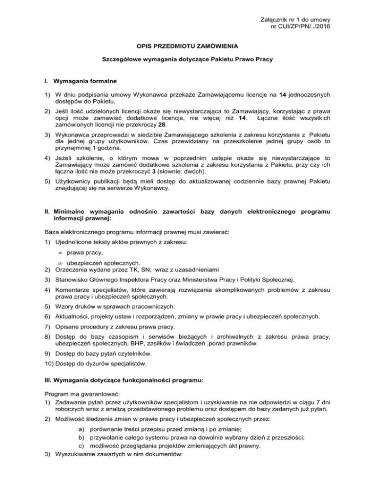 Załącznik nr 1 do umowy nr CUI/ZP/PN/../2016 OPIS PRZEDMIOTU ZAMÓWIENIA Szczegółowe wymagania dotyczące Pakietu Prawo Pracy I. Wymagania formalne 1) W dniu podpisania umowy Wykonawca przekaże Zamawiającemu licencje na 14 jednoczesnych dostępów do Pakietu. 2) Jeśli ilość udzielonych licencji okaże się niewystarczająca to Zamawiający, korzystając z prawa opcji może zamawiać dodatkowe licencje, nie więcej niż 14. Łączna ilość wszystkich zamówionych licencji nie przekroczy 28. 3) Wykonawca przeprowadzi w siedzibie Zamawiającego szkolenia z zakresu korzystania z Pakietu dla jednej grupy użytkowników. Czas przewidziany na przeszkolenie jednej grupy osób to przynajmniej 1 godzina. 4) Jeżeli szkolenie, o którym mowa w poprzednim ustępie okaże się niewystarczające to Zamawiający może zamówić dodatkowe szkolenia z zakresu korzystania z Pakietu, przy czy ich łączna ilość nie może przekroczyć 3 (słownie: dwóch). 5) Użytkownicy publikacji będą mieli dostęp do aktualizowanej codziennie bazy prawnej Pakietu znajdującej się na serwerze Wykonawcy. II. Minimalne wymagania odnośnie zawartości bazy danych elektronicznego programu informacji prawnej: Baza elektronicznego programu informacji prawnej musi zawierać: 1) Ujednolicone teksty aktów prawnych z zakresu: • prawa pracy, • ubezpieczeń społecznych. 2) Orzeczenia wydane przez TK, SN, wraz z uzasadnieniami 3) Stanowisko Głównego Inspektora Pracy oraz Ministerstwa Pracy i Polityki Społecznej. 4) Komentarze specjalistów, które zawierają rozwiązania skomplikowanych problemów z zakresu prawa pracy i ubezpieczeń społecznych. 5) Wzory druków w sprawach pracowniczych. 6) Aktualności, projekty ustaw i rozporządzeń, zmiany w prawie pracy i ubezpieczeń społecznych. 7) Opisane procedury z zakresu prawa pracy. 8) Dostęp do bazy czasopism i serwisów bieżących i archiwalnych z zakresu prawa pracy, ubezpieczeń społecznych, BHP, zasiłków i świadczeń ,porad prawników. 9) Dostęp do bazy pytań czytelników. 10) Dostęp do dyżurów specjalistów. III. Wymagania dotyczące funkcjonalności programu: Program ma gwarantować: 1) Zadawanie pytań przez użytkowników specjalistom i uzyskiwanie na nie odpowiedzi w ciągu 7 dni roboczych wraz z analizą przedstawionego problemu oraz dostępem do bazy zadanych już pytań. 2) Możliwość śledzenia zmian w prawie pracy i ubezpieczeń społecznych przez: a) porównanie treści przepisu przed zmianą i po zmianie; b) przywołanie całego systemu prawa na dowolnie wybrany dzień z przeszłości; c) możliwość przeglądania projektów zmieniających akt prawny. 3) Wyszukiwanie zawartych w nim dokumentów: d) według rocznika; e) według daty wydania/opublikowania/obowiązywania; f) poprzez klasyfikację przedmiotową (dotyczy aktów prawnych i orzeczeń); g) według słów w treści dokumentów. 4) Możliwość kopiowania całości lub części dokumentu do edytorów tekstu. 5) Odwołania z poziomu aktu prawnego do: h) orzeczeń; i) komentarzy; j) pism urzędowych. 6) Możliwość drukowania dokumentów z zachowaniem formatowania widocznego na ekranie. 7) Treść dokumentów dostępna w języku polskim.