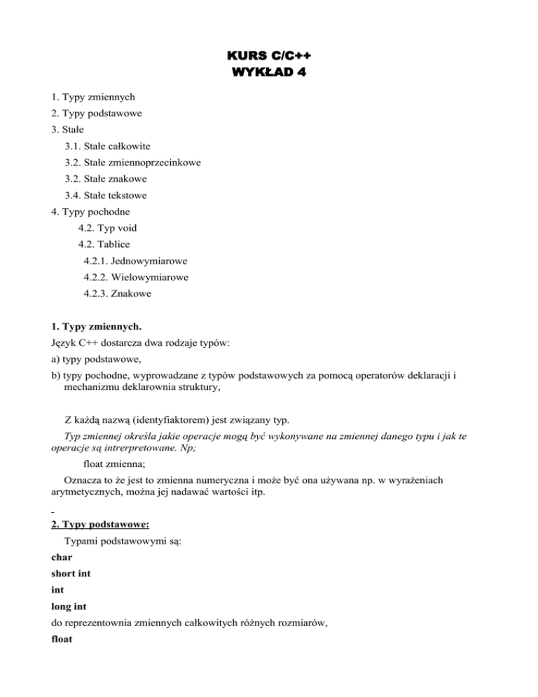 b) typy pochodne, wyprowadzane z typów podstawowych za pomocą operatorów deklaracji i