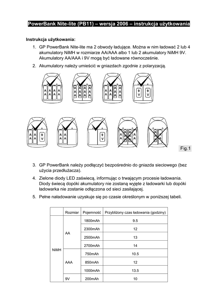 PowerBank Nite-lite (PB11) – wersja 2006 – instrukcja użytkowania Instrukcja użytkowania: 1. GP PowerBank Nite-lite ma 2 obwody ładujące. Można w nim ładować 2 lub 4 akumulatory NiMH w rozmiarze AA/AAA albo 1 lub 2 akumulatory NiMH 9V. Akumulatory AA/AAA i 9V mogą być ładowane równocześnie. 2. Akumulatory należy umieścić w gniazdach zgodnie z polaryzacją. 3. GP PowerBank należy podłączyć bezpośrednio do gniazda sieciowego (bez użycia przedłużacza). 4. Zielone diody LED zaświecą, informując o trwającym procesie ładowania. Diody świecą dopóki akumulatory nie zostaną wyjęte z ładowarki lub dopóki ładowarka nie zostanie odłączona od sieci zasilającej. 5. Pełne naładowanie uzyskuje się po czasie określonym w poniższej tabeli. Rozmiar Pojemność Przybliżony czas ładowania (godziny) 1800mAh 9.5 2300mAh 12 2500mAh 13 2700mAh 14 750mAh 10.5 850mAh 12 1000mAh 13.5 200mAh 10 AA NiMH AAA 9V 6. W pełni naładowane akumulatory mogą zostać od razu użyte, mogą również pozostać we włączonej ładowarce GP PowerBank, tak aby zostały utrzymane w stanie pełnego naładowania. 7. Ze względu na niski prąd ładowania, pozostawienie akumulatorów GP we włączonej ciągle ładowarce GP PowerBank jest całkowicie bezpieczne. 8. GP PowerBank jest wyposażony w lampkę nocną. Lampka może być używana niezależnie od tego, czy w ładowarce są umieszczone akumulatory. Do włączania i wyłączania lampki służy przełącznik w górnej części ładowarki. Najlepsze rezultaty uzyskuje się używając wraz z ładowarką GP PowerBank Nite-lite niklowo-wodorkowych akumulatorów GP. Uwaga: 1. W przypadku nowych akumulatorów konieczne jest 2 – 3 krotne ładowanie i rozładowanie w celu osiągnięcia pełnej pojemności. 2. Również w przypadku długo nieużywanych akumulatorów wskazane jest naładowanie przed użyciem. 3. Jeśli urządzenie zasilane akumulatorami nie będzie używane przez dłuższy czas, wskazane jest wyjęcie z niego akumulatorów. 4. Nagrzewanie się akumulatorów w czasie ładowania jest zjawiskiem normalnym. 5. Temperatura pracy ładowarki: 0 - 45C. Temperatura przechowywania akumulatorów: od –20 do 35C. Środki ostrożności: 1. W żadnym wypadku nie wolno ładować baterii i akumulatorów innych niż niklowo-wodorkowe akumulatory AA, AAA lub 9V, bowiem może to prowadzić do niebezpiecznych dla zdrowia wycieków, eksplozji a nawet pożaru. 2. Nie należy używać jednocześnie akumulatorów nowych i używanych, akumulatorów o różnych pojemnościch ani akumulatorów różnych producentów. 3. Ładowarki ani akumulatorów nie wolno wkładać do wody, do ognia ani rozbierać we własnym zakresie. 4. Nie wolno zwierać końcówek akumulatorów. 5. Ładowarka jest przeznaczona wyłącznie do użytku wewnątrz pomieszczeń. Nie można jej wystawiać na działanie deszczu lub śniegu. Waga netto ładowarki: 178 g Niniejszego urządzenia nie wolno wyrzucać ze zwykłymi, nieposortowanymi odpadami komunalnymi. W celu uzyskania informacji o dostępnych na Państwa terenie metodach utylizacji, należy skontaktować się z władzami lokalnymi. Złomując we właściwy sposób niniejsze urządzenie, ograniczą Państwo ryzyko wystąpienia negatywnego wpływu na środowisko i ludzi, które mogłoby zaistnieć w przypadku nieprawidłowej utylizacji.