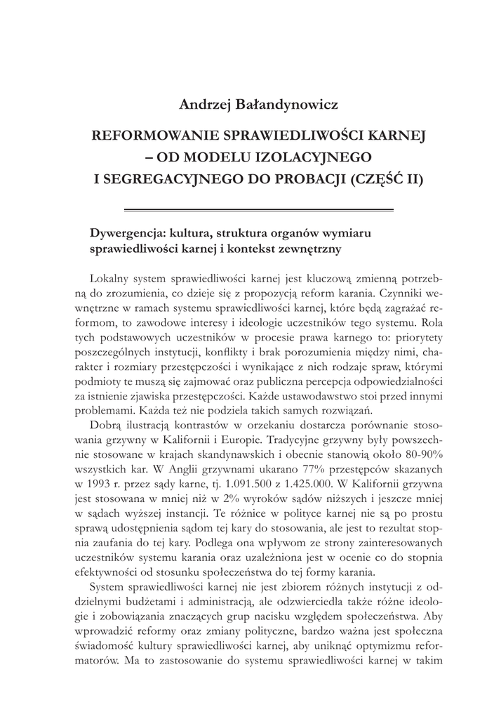 Andrzej Bałandynowicz Reformowanie sprawiedliwości karnej – od modelu izolacyjnego i segregacyjnego do probacji (część II) Dywergencja: kultura, struktura organów wymiaru sprawiedliwości karnej i kontekst zewnętrzny Lokalny system sprawiedliwości karnej jest kluczową zmienną potrzebną do zrozumienia, co dzieje się z propozycją reform karania. Czynniki wewnętrzne w ramach systemu sprawiedliwości karnej, które będą zagrażać reformom, to zawodowe interesy i ideologie uczestników tego systemu. Rola tych podstawowych uczestników w procesie prawa karnego to: priorytety poszczególnych instytucji, konflikty i brak porozumienia między nimi, charakter i rozmiary przestępczości i wynikające z nich rodzaje spraw, którymi podmioty te muszą się zajmować oraz publiczna percepcja odpowiedzialności za istnienie zjawiska przestępczości. Każde ustawodawstwo stoi przed innymi problemami. Każda też nie podziela takich samych rozwiązań. Dobrą ilustracją kontrastów w orzekaniu dostarcza porównanie stosowania grzywny w Kalifornii i Europie. Tradycyjne grzywny były powszechnie stosowane w krajach skandynawskich i obecnie stanowią około 80-90% wszystkich kar. W Anglii grzywnami ukarano 77% przestępców skazanych w 1993 r. przez sądy karne, tj. 1.091.500 z 1.425.000. W Kalifornii grzywna jest stosowana w mniej niż w 2% wyroków sądów niższych i jeszcze mniej w sądach wyższej instancji. Te różnice w polityce karnej nie są po prostu sprawą udostępnienia sądom tej kary do stosowania, ale jest to rezultat stopnia zaufania do tej kary. Podlega ona wpływom ze strony zainteresowanych uczestników systemu karania oraz uzależniona jest w ocenie co do stopnia efektywności od stosunku społeczeństwa do tej formy karania. System sprawiedliwości karnej nie jest zbiorem różnych instytucji z oddzielnymi budżetami i administracją, ale odzwierciedla także różne ideologie i zobowiązania znaczących grup nacisku względem społeczeństwa. Aby wprowadzić reformy oraz zmiany polityczne, bardzo ważna jest społeczna świadomość kultury sprawiedliwości karnej, aby uniknąć optymizmu reformatorów. Ma to zastosowanie do systemu sprawiedliwości karnej w takim 110 Andrzej Bałandynowicz stopniu, jak do innych obszarów życia. Zrozumienie lokalnej kultury sprawiedliwości karnej zapewni wgląd w sposób definiowania przez praktyków rzeczy uważanych przez nich za oczywiste i pomaga wydobyć sens z tradycji związanych z konkretnymi podmiotami tego systemu. W USA Michael Tonry w swojej analizie efektów działania „komisji do spraw orzekania” argumentuje, iż zrozumienie ograniczeń narzuconych przez lokalną kulturę prawną i polityczną pomaga wyjaśnić różny wpływ takich komisji w krajach, w których były wprowadzone1. Być może jedynym uogólnieniem, które można poczynić w zakresie kultury politycznej i prawnej, jest to, iż możliwości i efektywność komisji do spraw orzekania będą zależne od tego, w jaki sposób zajmuje się ona ograniczeniami narzuconymi przez lokalną kulturę i jak się do nich dostosowuje. John Patten, wiceminister w MSW w 1991 r. określił znaczenie tradycji systemu sprawiedliwości karnej jako przyczynę, dla której uważa, iż idea rady do spraw orzekania nie będzie działać w Wielkiej Brytanii. Pisał on: „Ci, którzy myślą o radach do spraw orzekania, nie mogą ignorować faktu, który ma już miejsce i potencjalnie daje to, co chcieliby oni widzieć, ale w sposób, który działa niezgodnie z tradycjami sprawiedliwości karnej w tym kraju. Z tego powodu istnieje szybko rozwijająca się struktura ramowa dla sędziów i sędziów pokoju”2. Tradycje sprawiedliwości karnej lub kultura różnych ustawodawstw pomagają rozwiązywać konkretne sprawy na drodze orzeczniczej. Jest to bardzo ważny czynnik, który pozwoli wyjaśnić sukces lub porażkę reform karnych. W Anglii kultura zawodowa sędziów jest mocno powiązana z zasadą niezawisłości sędziowskiej. Wydaje się to być uzasadnionym stanowiskiem, biorąc pod uwagę autonomię sędziów w prowadzeniu procesów i sądzeniu przestępców, ale jest mniej przekonywujące, gdy dotyczy administrowania systemem sprawiedliwości oraz celów orzekania. Istniał opór ze strony sędziów w stosunku do standaryzacji strategii orzekania, który powstał w odpowiedzi na zarzuty braku sukcesów i inicjatyw dążących do większego ujednolicenia polityki karnej w Wielkiej Brytanii. W Anglii i Walii sędziowie posiadają wysoką kulturę zawodową, co widać w reakcjach sędziów pokoju na grzywny jednostkowe wprowadzone ustawą z 1991 r. Grzywny jednostkowe były częścią pakietu reform dążących do uniknięcia nierówności w polityce karnej. Opór ze strony tych sędziów i reakcje środków masowego przekazu tendencyjnie nakreślających efekty tej kary w sposób znaczący ograniczyły politykę stosowania grzywien. Opozycja także stosowała różne zarzuty. Niektórzy sędziowie pokoju wyrażali sprzeciw wobec usunięcia uznaniowości w stosunku do grzywien jednostkowych. Inni 1 M. Tonry, Sentencing Reform Impact, National Institute of Justice, Office of Communications and Research Utilization, US Department of Justice, Washington, DC 1987. 2 M. Tonry, Sentencing Reforms Across National Boundaries, [w:] C. Clarkson, R. Morgan, The Politics of Sentencing Reform, Clarendon Press, Oxford 1995. Reformowanie sprawiedliwości karnej – od modelu izolacyjnego i segregacyjnego do probacji... 111 uznali, iż są one niesprawiedliwe dla przestępców; na przykład za ten sam czyn wyceniony na dziesięć jednostek, jeden przestępca (którego maksymalne tygodniowe dochody, którymi może dysponować, wyliczono na 100 funtów angielskich) zapłaciłby grzywnę w wysokości 1000 funtów angielskich, podczas gdy inna osoba z tygodniowym dochodem minimalnym równym 4 funty angielski zapłaciłaby tylko 40 funtów. Stowarzyszenie sędziów pokoju dążyło do 