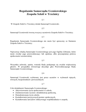 Regulamin Samorządu Uczniowskiego Zespołu Szkół w Trzcinicy §1 W Zespole Szkół w Trzcinicy działa Samorząd Uczniowski. §2 Samorząd Uczniowski tworzą wszyscy uczniowie Zespołu Szkół w Trzcinicy. §3 Regulamin Samorządu Uczniowskiego nie może być sprzeczny ze Statutem Zespołu Szkół w Trzcinicy. §4 Najwyższą władzą Samorządu Uczniowskiego jest jego Ogólne Zebranie, które może zwołać jego przewodniczący lub opiekun, albo przynajmniej połowa społeczności uczniowskiej. §5 Wszystkie uchwały, opinie, wnioski Rady podejmuje się zwykła większością głosów. W przypadku równowagi decyduje głos Przewodniczącego Rady Samorządu Uczniowskiego. §6 Samorząd Uczniowski wybierany jest przez uczniów w wyborach tajnych, równych, bezpośrednich i powszechnych. §7 Cele działalności Samorządu Uczniowskiego: Aktywizowanie życia społeczności w szkole, Zainteresowanie życiem i działalnością społeczną, Demokratyzacja życia szkoły, Kształtowanie pozytywnych postaw społecznych, Kształtowanie nawyków efektywnego współdziałania w zespole, Gotowość podejmowania obowiązków i uczenie odpowiedzialności za ich realizację, Uczenie odpowiedzialności moralnej, tolerancji, empatii, pielęgnowanie tradycji rodzinnych, szkolnych, państwowych, religijnych. §8 Samorząd Uczniowski może przedstawić Radzie Pedagogicznej, Dyrektorowi ZS w Trzcinicy wnioski i opinie we wszystkich sprawach ZS w Trzcinicy, a w szczególności takich jak: - zapoznanie się z programem nauczania, jego treścią, celami, stawianymi wymaganiami, - jawnej i umotywowanej oceny, - rozwijania swoich zainteresowań, - prawo organizowania działalności kulturalno – oświatowo – sportowej. §9 Działalnością SU kieruje Rada SU, w skład której wchodzą: a) Zarząd SU: a. Przewodniczący, b. 2 zastępców, c. 2 sekretarzy, d. 2 członków. b) Przewodniczący Samorządów Klasowych i zastępcy przewodniczących. § 10 Na czele Zarządu stoi przewodniczący. § 11 Do zadań przewodniczącego należy: - realizacja plany SU ZS w Trzcinicy, - reprezentowanie społeczności uczniowskiej wobec Dyrekcji ZS w Trzcinicy, Rady pedagogicznej, Rady Rodziców, kontakty z przewodniczącymi klas oraz kontakty poza szkołą. § 12 Interesy uczniów klas I-III SP w Trzcinicy współprojektują z przewodniczącymi klas ich wychowawcy oddziałowi. § 13 Kadencja Rady SU trwa 3 lata. § 14 Przewodniczący w uzasadnionych przypadkach może podać się do dymisji przed upływem kadencji. § 15 W przypadku podania się do dymisji Przewodniczącego przed upływem jego kadencji lub kiedy Przewodniczący wcześniej ukończy Gimnazjum, jego obowiązki przejmuje osoba wybrana przez Zarząd. § 16 Zebrania Zarządu Samorządu Uczniowskiego odbywają się przynajmniej raz w miesiącu. § 17 Przewodniczący ma prawo do zwoływania specjalnych zebrań Zarządu. § 18 Do zadań Zarządu należy: - opracowanie planu pracy SU, - realizacja zadań wg plany, - prowadzenie bieżącej dokumentacji. III Ordynacja wyborcza do Zarządu Samorządu Uczniowskiego ZS w Trzcinicy § 19 Zarząd SU wybierany jest spośród przedstawionych kandydatur przez ogół uczniów w głosowaniu równym i powszechnym. § 20 Kandydatem do Zarządu SU zostaje uczeń, który uzyskał minimum poparcie 5 głosów (po 2 z każdej klasy oraz posiada ocenę zachowania co najmniej dobrą). § 21 Każdy uczeń naszej szkoły może udzielić poparcia tylko jednemu kandydatowi. § 22 Wybory przeprowadza Szkolna Komisja Wyborcza powołana najpóźniej na 7 dni przed datą wyborów przez Dyrektora ZS w Trzcinicy spośród kandydatów zgłoszonych przez samorządy klasowe. W skład Komisji wchodzi od 4 do 7 uczniów. § 23 Komisja na pierwszym posiedzeniu wybiera przewodniczącego i zastępcę przewodniczącego Szkolnej Komisji Wyborczej. § 24 Datę wyborów do Zarządu SU ustala Dyrektor ZS w Trzcinicy. § 25 Głosowanie odbywa się w wyznaczonym pomieszczeniu z wykorzystaniem ostemplowanych kart do głosowania. § 26 Każdy uczeń otrzymuje tylko jedna kartę do głosowania stawiając na niej znak X w kartce z lewej strony obok nazwiska wybranego kandydata. § 27 Zabrania się prowadzenia kampanii wyborczej na 24 godziny przed okresem wyborów. § 28 Szkolna Komisja stwierdza ważność wyborów oraz sporządza protokół z przeprowadzonych wyborów przekazując wraz z zabezpieczonymi oddanymi głosami Dyrektorowi ZS w Trzcinicy. § 29 Dyrektor ZS w Trzcinicy ogłasza w ciągu 3 dni wyniki wyborów poprzez opublikowanie nazwisk osób Zarządu SU z zachowaniem zasady, iż uczeń, który otrzymała najwyższą liczbę głosów zostaje przewodniczącym, a pozostałe stanowiska odsadza się na pierwszym spotkaniu SU. W przypadku wygaśnięcia mandatów w skład Zarządu SU wchodzi kolejny uczeń z największą liczbą głosów.