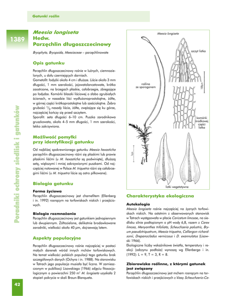 Gatunki roÊlin 1389 Meesia longiseta Hedw. Parz´chlin d∏ugoszczecinowy Meesia longiseta szczyt listka Bryophyta, Bryopsida, Meesiaceae – parz´chlinowate roÊlina ze sporogonem komórki Êrodkowej cz´Êci listka Mo˝liwoÊç pomy∏ki przy identyfikacji gatunku Od najbli˝ej spokrewnionego gatunku Meesia hexasticha parz´chlin d∏ugoszczecinowy ró˝ni si´ p∏askimi lub prawie p∏askimi liÊçmi (u M. hexasticha sà podwini´te), d∏u˝szà setà, wi´kszymi i mniej zakrzywionymi puszkami. Od najcz´Êciej notowanej w Polsce M. triquetra ró˝ni si´ ca∏obrzegimi liÊçmi (u M. triquetra liÊcie sà ostro pi∏kowane). Biologia gatunku Forma ˝yciowa Parz´chlin d∏ugoszczecinowy jest chamefitem (Ellenberg i in. 1992) rosnàcym na torfowiskach niskich i przejÊciowych. Biologia rozmna˝ania Parz´chlin d∏ugoszczecinowy jest gatunkiem jednopiennym lub dwupiennym. ˚ó∏tozielone, delikatnie brodawkowane zarodniki, wielkoÊci oko∏o 40 µm, dojrzewajà latem. Aspekty populacyjne Parz´chlin d∏ugoszczecinowy roÊnie najcz´Êciej w postaci ma∏ych darenek wÊród innych mchów torfowiskowych. Na temat wielkoÊci polskich populacji tego gatunku brak szczegó∏owych danych (Ochyra i in. 1988). Na stanowisku w Tatrach jego populacja musia∏a byç liczna. W zamieszczonym w publikacji Lisowskiego (1966) zdj´ciu fitosocjologicznym o powierzchni 250 m2 M. longiseta uzyska∏a 2 stopieƒ pokrycia w skali Braun-Blanqueta. 42 100µm Parz´chlin d∏ugoszczecinowy roÊnie w luênych, ciemnozielonych, u do∏u czerniejàcych darniach. Gametofit: ∏ody˝ki oko∏o 4 cm i d∏u˝sze. LiÊcie oko∏o 3 mm d∏ugoÊci, 1 mm szerokoÊci, jajowatolancetowate, krótko zaostrzone, na brzegach p∏askie, ca∏obrzegie, zbiegajàce po ∏odydze. Komórki blaszki liÊciowej o s∏abo zgrubia∏ych Êcianach, w nasadzie liÊci wyd∏u˝onoprostokàtne, ˝ó∏te, w górnej cz´Êci krótkoprostokàtne lub szeÊciokàtne. ˚ebro gruboÊci 1/3 nasady liÊcia, ˝ó∏te, zw´˝ajàce si´ ku górze, najcz´Êciej koƒczy si´ przed szczytem. Sporofit: seta d∏ugoÊci 6–10 cm. Puszka zarodnikowa gruszkowata, oko∏o 4–5 mm d∏ugoÊci, 1 mm szerokoÊci, lekko zakrzywiona. 1cm Poradniki ochrony siedlisk i gatunków Opis gatunku listki wegetatywne Charakterystyka ekologiczna Autekologia Meesia longiseta roÊnie najcz´Êciej na ˝yznych torfowiskach niskich. Na ostatnim z obserwowanych stanowisk w Tatrach wyst´powa∏a w p∏acie Caricetum limosae, na siedlisku silnie podtopionym o pH wody 6,8, razem z Carex limosa, Menyanthes trifoliata, Scheuchzeria palustris, Bryum pseudotriquatrum, Meesia triquetra, Calliergon richardsonii, Drepanocladus vernicosus i D. exannulatus (Lisowski 1966). Ekologiczne liczby wskaênikowe Êwiat∏a, temperatury i reakcji (odczynu pod∏o˝a) wynoszà wg Ellenberga i in. (1992): L = 9, T = 3, R = 8. Zbiorowiska roÊlinne, z którymi gatunek jest zwiàzany Parz´chlin d∏ugoszczecinowy jest mchem rosnàcym na torfowiskach niskich i przejÊciowych z klasy Scheuchzerio-Ca- Mszaki ricetea nigrae (zwiàzki: Caricion davallianae, Caricion lasiocarpae, Caricion nigrae). Oprócz informacji Lisowskiego (1966) o stanowisku w Tatrach, z pozosta∏ych miejsc wyst´powania tego gatunku brak bli˝szych danych fitosocjologicznych. Siedliska (wg Za∏àcznika I Dyrektywy Siedliskowej) 7140 – torfowiska przejÊciowe i trz´sawiska – naturalne mszary i mechowiska torfotwórcze o pozycji poÊredniej mi´dzy typowymi torfowiskami niskimi i wysokimi; 7210 – torfowiska nakredowe, zasilane wodami zasobnymi w zwiàzki wapnia; 7230-3 – torfowiska zasadowe – torfowiska êródliskowe i przep∏ywowe pó∏nocnej Polski. Wyst´powanie na Êwiecie Meesia longiseta jest gatunkiem borealnym (Düll 1994), w Europie Ârodkowej – reliktem z okresów glacjalnych. RoÊnie na rozproszonych stanowiskach w pó∏nocnej, centralnej i wschodniej Europie, na Syberii, Kamczatce, Grenlandii, w Chinach, pó∏nocnej cz´Êci Ameryki Pó∏nocnej, Hondurasie oraz Kolumbii (Ochyra i in. 1988; Nyholm 1998). Wyst´powanie w Polsce W Polsce parz´chlin d∏ugoszczecinowy znany jest z 27 stanowisk, zlokalizowanych g∏ównie w pó∏nocnej i zachodniej cz´Êci kraju. W górach najwy˝sze stanowisko znajduje si´ w Tatrach na wysokoÊci 1125 m n.p.m. (Ochyra i in. 1988). 1389 Stan i dynamika populacji, potencjalne zagro˝enia Stan i dynamika populacji Parz´chlin d∏ugoszczecinowy z terenu Polski podany zosta∏ z 27 stanowisk, z czego ponad 50% pochodzi z XIX w., ponad 40% z okresu 1901–1950 (wszystkie notowania sprzed II wojny Êwiatowej), w latach 1951–1990 zosta∏ odnaleziony na 1 stanowisku, natomiast po 1990 roku omawiany gatunek nie by∏ ju˝ w Polsce obserwowany. Potencjalne zagro˝enia Na terenie Polski M. longiseta jest gatunkiem silnie nara˝onym na wygini´cie. Niewàtpliwie najwi´kszym zagro˝eniem dla tego mchu jest osuszanie bagien i torfowisk. Prawdopodobnie jest to gatunek silnie wra˝liwy na zmiany w Êrodowisku naturalnym i nawet niewielka ingerencja cz∏owieka powoduje jego ust´powanie. W Polsce stanowiska parz´chlinu d∏ugoszczecinowego majà charakter reliktowy z okresu zlodowaceƒ i, byç mo˝e dlatego, jeszcze inne czynniki o charakterze naturalnym powodujà kurczenie si´ jego zasi´gu. Ochrona gatunku i jego siedlisk Propozycje dzia∏aƒ ochronnych Weryfikacji wymagajà wszystkie stanowiska, skàd M. longiseta by∏a podawana. W przypadku potwierdzenia jej wyst´powania lub odkrycia nowych stanowisk, miejsca takie powinny zostaç bezwzgl´dnie obj´te ochronà. Nale˝y przeprowadziç badania ekologiczne i populacyjne, które umo˝liwià wypracowanie odpowiednich metod ochrony tego gatunku. Poradniki ochrony siedlisk i gatunków Rozmieszczenie geograficzne Dyrektywa Siedliskowa (1992) – Za∏àcznik II. Prawo krajowe: Ochrona gatunkowa w Polsce – Êcis∏a, od 2001 r. Kategorie IUCN: „Red Data Book of European bryophytes” (Schumacker, Martiny 1995) –