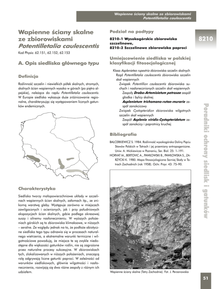 Wapienne Êciany skalne ze zbiorowiskami Tytu∏ rozdzia∏u Tytu∏ rozdzia∏u Tytu∏ rozdzia∏u Tytu∏ Potentilletalia caulescentis Wapienne Êciany skalne ze zbiorowiskami Potentilletalia caulescentis Podzia∏ na podtypy 8210-1 Wysokogórskie zbiorowiska szczelinowe, 8210-2 Szczelinowe zbiorowiska paproci 8210 Kod Physis: 62.151, 62.152, 62.153 A. Opis siedliska g∏ównego typu Definicja Klasa Asplenietea rupestria zbiorowiska szczelin skalnych Rzàd Potentilletalia caulescentis zbiorowiska szczelin ska∏ wapiennych Zwiàzek Potentillion caulescentis zbiorowiska suchych i nas∏onecznionych szczelin ska∏ wapiennych Zespo∏y Drabo-Artemisietum petrosae zespó∏ g∏odka i bylicy skalnej Asplenietum trichomano-rutae-murarie zespó∏ zanokcicowy Zwiàzek Cystopteridion zbiorowiska wilgotnych szczelin ska∏ wapiennych Zespó∏ Asplenio viridis-Cystopteridetum zespó∏ zanokcicy i paprotnicy kruchej Bibliografia BALCERKIEWICZ S. 1984. RoÊlinnoÊç wysokogórska Doliny Pi´ciu Stawów Polskich w Tatrach i jej przemiany antropogeniczne. Uniw. A. Mickiewicza w Poznaniu, Ser. Biol. 25: 1–191. HORVAT M., BERTOVIC A., PAW¸OWSKI B., PAW¸OWSKA S., ZARZYCKI K. 1980. Mapa fitosocjologiczna Sarniej Ska∏y w Tatrach Zachodnich (rok 1958). Ochr. Przyr. 43: 75–90. Charakterystyka Siedlisko tworzy ma∏opowierzchniowe uk∏ady w szczelinach wapiennych Êcian skalnych, za∏omach itp., ze znikomà warstwà gleby. Wyst´puje zarówno w miejscach zawilgoconych i ocienionych, jak i przy po∏udniowych ekspozycjach Êcian skalnych, gdzie podlega okresowej suszy i silnemu nas∏onecznieniu. W wy˝szych po∏o˝eniach górskich sà to zbiorowiska klimaksowe, w ni˝szych – seralne. Ze wzgl´du jednak na to, ˝e pod∏o˝e abiotyczne siedliska tego typu odnawia si´ w procesach naturalnego wietrzenia, a ekstremalne warunki termiczne i wilgotnoÊciowe powodujà, ˝e miejsca te sà zwykle niedost´pne dla wi´kszoÊci gatunków roÊlin, nie sà zagro˝one przez naturalne procesy sukcesyjne. W zbiorowiskach tych, zlokalizowanych w ni˝szych po∏o˝eniach, znaczàcà rol´ odgrywajà liczne gatunki paproci. W zale˝noÊci od warunków siedliskowych, g∏ównie wilgotnoÊci i nas∏onecznienia, rozwijajà si´ dwa ró˝ne zespo∏y z ró˝nym ich udzia∏em. Poradniki ochrony siedlisk i gatunków RoÊlinnoÊç szczelin i niewielkich pó∏ek skalnych, stromych, skalnych Êcian wapiennych wysoko w górach (po pi´tro alpejskie), nale˝àca do rz´du Potentilletalia caulescentis. W Europie siedlisko wykazuje du˝e zró˝nicowanie regionalne, charakteryzujàc si´ wyst´powaniem licznych gatunków endemicznych. Umiejscowienie siedliska w polskiej klasyfikacji fitosocjologicznej Wapienne Êciany skalne (Tatry Zachodnie). Fot. J. Perzanowska 51 Âciany, piargi, rumowiska skalne i jaskinie Poradniki ochrony siedlisk i gatunków 8210 52 KOZ¸OWSKA A. 1927. Naskalne zbiorowiska roÊlin na Wy˝ynie Ma∏opolski. Rozpr. Wydz. Matem.-Przyr. PAU, Dz. AB, 67: 325–374. MEDWECKA-KORNA A., KORNA J. 1963. Mapa zbiorowisk roÊlinnych Ojcowskiego Parku Narodowego. Ochr. Przyr. 29: 17–87. MIREK Z. (red.) 1997. Operat ochrony làdowych ekosystemów nieleÊnych Tatrzaƒskiego Parku Narodowego. TPN, Zakopane, msc. MYCZKOWSKI S., PI¢KOÂ-MIRKOWA H., BARY¸A J. 1985. Zbiorowiska roÊlinne (mapa). W: Trafas K. (red.) Atlas Tatrzaƒskiego Parku Narodowego. Zakopane–Kraków, Plansza 16. PAW¸OWSKI B. 1972. Zespo∏y wysokogórskie. W: Szafer W., Zarzycki K. (red.) Szata roÊlinna Polski. Wyd. 2. popr. PWN, Warszawa. PAW¸OWSKI B., STECKI K. 1927. Die Pflanzenassoziationen des Tatra-Gebirges. Teil 4. Die Pflanzenassoziationen des Mi´tusia-Tales und des Hauptmassivs der Czerwone Wierchy. Bull. int. Acad. Pol. Sc., Cl. math. nature., Ser. B, N suppl. 2(1926): 79–121. PI¢KO H. 1968. Rozmieszczenie roÊlin regla dolnego i górnego na Sarniej Skale, Krokwi i ¸ysankach w Tatrach. Fragm. Flor. Geobot. 14,3: 317–393. PI¢KOÂ-MIRKOWA H., MIREK Z. 1996. Zbiorowiska roÊlinne. W: Mirek Z., G∏owaciƒski Z., Klimek K., Pi´koÊ-Mirkowa H. (red.) Przyroda Tatrzaƒskiego Parku Narodowego. Tatry i Podtatrze 3, Wyd. Tatrzaƒski Park Narodowy, Zakopane–Kraków. ÂWIERKOSZ K. 2003. Notes on the syntaxonomy of the Asplenietea trichomanis (Br.–Bl. in Meier et Br.–Bl. 1934) Oberd. 1977 class in Poland, msc. Joanna Perzanowska, Wojciech Mróz Wapienne Êciany skalne ze zbiorowiskami Tytu∏ rozdzia∏u Tytu∏ rozdzia∏u Tytu∏ rozdzia∏u Tytu∏ Potentilletalia caulescentis Zespó∏ jest wi´c trwa∏y, nie ma zagro˝enia przemianami sukcesyjnymi. Wysokogórskie zbiorowiska szczelinowe Siedliska przyrodnicze zale˝ne lub przylegajàce Kod Physis: 62.153 Siedlisko graniczy z nawapiennà roÊlinnoÊcià piargowà (8120), np. Papaveri-Cerastietum latifolii 61.242, i wyle˝ysk Ênie˝nych Saxifragetum wahlenbergii 36.1212, Salicetum retusae alpinetosum 36.122 i w ograniczonym zakresie mogà pojawiaç si´ w nim pojedyncze gatunki z tych zespo∏ów (o ile pozwalajà na to warunki siedliskowe). Âciany skalne powiàzane sà przestrzennie tak˝e z nawapiennymi murawami wysokogórskimi (6170): np. Caricetum firmae 36.4332 i Festuco versicoloris-Seslerietum tatrae 36.43912, a tak˝e z murawami rozwijajàcymi si´ na mylonitach w obr´bie ska∏ granitowych: Festuco versicolorisAgrostietum alpinae 36.43913. Cechy diagnostyczne Cechy obszaru Zespó∏ rozwija si´ w wy˝szych po∏o˝eniach górskich, w pi´trach alpejskim i subniwalnym, czyli powy˝ej 1800 m n.p.m., w szczelinach wapiennych Êcian skalnych. Niekiedy spotykany jest tak˝e na mylonitach. Zwykle wyst´puje przy ekspozycji po∏udniowej lub z przyleg∏ych sektorów. Gleba gromadzàca si´ w szczelinach ma charakter inicjalnej r´dziny nawapiennej. Warunki wilgotnoÊciowe podlegajà znacznym wahaniom. Tak˝e nachylenie Êcian skalnych jest zmienne, a˝ po pionowe urwiska. Fizjonomia i struktura zbiorowisk Zespó∏ w Polsce wykszta∏cony tylko fragmentaryczn