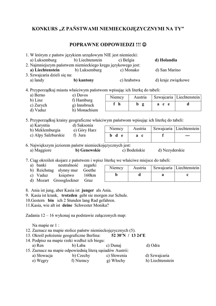 KONKURS „Z PAŃSTWAMI NIEMIECKOJĘZYCZNYMI NA TY” POPRAWNE ODPOWIEDZI !!! ☺ 1. W którym z państw językiem urzędowym NIE jest niemiecki: a) Luksemburg b) Liechtenstein c) Belgia 2. Najmniejszym państwem niemieckiego kręgu językowego jest: a) Liechtenstein b) Luksemburg c) Monako 3. Szwajcaria dzieli się na: a) landy b) kantony c) hrabstwa d) Holandia d) San Marino d) kraje związkowe 4. Przyporządkuj miasta właściwym państwom wpisując ich literkę do tabeli: a) Berno e) Davos Niemcy Austria Szwajcaria Liechtenstein b) Linz f) Hamburg f h b g a c e d c) Zurych g) Innsbruck d) Vaduz h) Monachium 5. Przyporządkuj krainy geograficzne właściwym państwom wpisując ich literkę do tabeli: a) Karyntia d) Saksonia Niemcy Austria Szwajcaria Liechtenstein b) Meklemburgia e) Góry Harz c) Alpy Salzburskie f) Jura b d e a c f --6. Największym jeziorem państw niemieckojęzycznych jest: a) Maggiore b) Genewskie c) Bodeńskie d) Nezyderskie 7. Ciąg określeń skojarz z państwem i wpisz literkę we właściwe miejsce do tabeli: a) banki neutralność zegarki Niemcy Austria Szwajcaria Liechtenstein b) Reichstag słynny mur Goethe b d a c 160km c) Vaduz księstwo d) Mozart Grossglockner Graz 8. Ania ist jung, aber Kasia ist junger als Ania. 9. Kasia ist krank, trotzden geht sie morgen zur Schule. 10.Gestern bin ich 2 Stunden lang Rad gefahren. 11.Kasia, wie alt ist deine Schwester Monika? Zadania 12 – 16 wykonaj na podstawie załączonych map: Na mapie nr 1 : 12. Zaznacz na mapie stolice państw niemieckojęzycznych (5). 13. Określ połoŜenie geograficzne Berlina: 52 30’N / 13 24’E 14. Podpisz na mapie rzeki wzdłuŜ ich biegu: a) Ren b) Łaba c) Dunaj d) Odra 15. Zaznacz na mapie odpowiednią literą sąsiadów Austrii: a) Słowacja b) Czechy c) Słowenia d) Szwajcaria e) Węgry f) Niemcy g) Włochy h) Liechtenstein