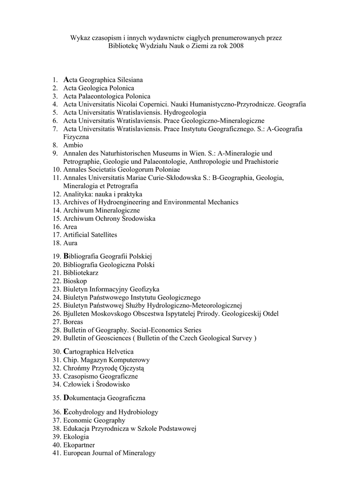 Wykaz czasopism i innych wydawnictw ciągłych prenumerowanych przez Bibliotekę Wydziału Nauk o Ziemi za rok 2008 1. 2. 3. 4. 5. 6. 7. Acta Geographica Silesiana Acta Geologica Polonica Acta Palaeontologica Polonica Acta Universitatis Nicolai Copernici. Nauki Humanistyczno-Przyrodnicze. Geografia Acta Universitatis Wratislaviensis. Hydrogeologia Acta Universitatis Wratislaviensis. Prace Geologiczno-Mineralogiczne Acta Universitatis Wratislaviensis. Prace Instytutu Geograficznego. S.: A-Geografia Fizyczna 8. Ambio 9. Annalen des Naturhistorischen Museums in Wien. S.: A-Mineralogie und Petrographie, Geologie und Palaeontologie, Anthropologie und Praehistorie 10. Annales Societatis Geologorum Poloniae 11. Annales Universitatis Mariae Curie-Skłodowska S.: B-Geographia, Geologia, Mineralogia et Petrografia 12. Analityka: nauka i praktyka 13. Archives of Hydroengineering and Environmental Mechanics 14. Archiwum Mineralogiczne 15. Archiwum Ochrony Środowiska 16. Area 17. Artificial Satellites 18. Aura 19. Bibliografia Geografii Polskiej 20. Bibliografia Geologiczna Polski 21. Bibliotekarz 22. Bioskop 23. Biuletyn Informacyjny Geofizyka 24. Biuletyn Państwowego Instytutu Geologicznego 25. Biuletyn Państwowej Służby Hydrologiczno-Meteorologicznej 26. Bjulleten Moskovskogo Obscestwa Ispytatelej Prirody. Geologiceskij Otdel 27. Boreas 28. Bulletin of Geography. Social-Economics Series 29. Bulletin of Geosciences ( Bulletin of the Czech Geological Survey ) 30. Cartographica Helvetica 31. Chip. Magazyn Komputerowy 32. Chrońmy Przyrodę Ojczystą 33. Czasopismo Geograficzne 34. Człowiek i Środowisko 35. Dokumentacja Geograficzna 36. Ecohydrology and Hydrobiology 37. Economic Geography 38. Edukacja Przyrodnicza w Szkole Podstawowej 39. Ekologia 40. Ekopartner 41. European Journal of Mineralogy 42. Fizika Zemli. Rossijskaja Akademija Nauk 43. Forum Akademickie 44. Gazeta Obserwatora IMGW 45. Gazeta Uniwersytecka UŚ 46. Gazeta Wyborcza 47. Geochimija 48. Geodezja i Kartografia 49. Geoekologija 50. Geofizyka. Biuletyn Informacyjny 51. Geografia w Szkole 52. Geografija i Prirodnye Resursy 53. Geografiska Annaler. S.: A-Physical Geography 54. Geografiska Annaler. S.: B-Human Geography 55. Geographia Polonica 56. Geographical Abstracts: Physical Geography 57. Geographical Analysis. International Journal of Theoretical Geography 58. Geographische Zeitschrift 59. Geologia Sudetica 60. Geologica Carpathica 61. Geological Quarterly ( Kwartalnik Geologiczny ) 62. Geological Society of America. Bulletin 63. Geologos 64. Geology 65. Geology Today 66. Geomorfologija 67. Geophysical Research Letters 68. Geoturystyka 69. Globtroter. Magazyn Podróżników 70. Gospodarka Surowcami Mineralnymi 71. Gospodarka Wodna 72. GSA Today 73. Górnictwo i Geologia 74. Holocene 75. Instrukcje i Metody Badań Geologicznych 76. International Journal of Tourism Research 77. Izvestija AN. S.: Geograficeskaja 78. Izvestija Russkogo Geograficeskogo Obscestwa 79. Journal of Climate 80. Journal of Geophysical Research. Solid Earth 81. Journal of Geosciences ( Journal of the Czech Geological Society ) 82. Journal of Hydrology and Hydromechanics 83. Journal of Paleontology 84. Journal of Petrology 85. JQS Journal of Quaternary Science 86. Kształtowanie Środowiska Geograficznego i Ochrona Przyrody na Obszarach Uprzemysłowionych i Zurbanizowanych UŚ 87. Kwartalnik Historii Kultury Materialnej 88. Landform Analysis 89. Lethaia 90. Limnological Review 91. Meteroligija i Gidrologija 92. Meteoryt 93. Miasta Wojewódzkie 94. Micropalaeontology 95. Mineralogia Polonica 96. Mineralogiceskij Żurnal 97. Mówią Wieki 98. National Geographic Polska 99. Natura Silesiae Superioris 100. Nature Conservation ( Ochrona Przyrody ) 101. Nauka 102. Newsweek Polska 103. Nordic Hydrology 104. Nowy Przemysł 105. Oceanologia 106. Oceanological and Hydrobiological Studies 107. Ochrona Powietrza i Problemy Odpadów 108. Ochrona Środowiska i Zasobów Naturalnych 109. Palaeontology 110. Palaios 111. Paleobiology 112. Paleontologiceskil Żurnal 113. Pamiętnik PTT 114. Parki Narodowe 115. PC World Komputer 116. Pocvovedenie 117. Polar Research 118. Polish Journal of Ecology ( Ekologia Polska ) 119. Polish Journal of Soil Science 120. Polish Geological Institute. Special Papers 121. Polish Polar Research 122. Polityka 123. Polski Przegląd Kartograficzny 124. Postępy Techniki Jądrowej 125. Poznaj Swój Kraj 126. Poznaj Świat 127. Prace Muzeum Ziemi 128. Prace Naukowe UŚ. Geographia. Studia et Dissertationes 129. Prace Naukowe UŚ. Geologia 130. Prace Naukowe UŚ. Kras i Speleologia 131. Prace Państwowego Instytutu Geologicznego 132. Problemy Ekologii 133. Problemy Ocen Środowiskowych 134. Problemy Turystyki 135. Progress in Human Geography 136. Przegląd Biblioteczny 137. Przegląd Geodezyjny 138. Przegląd Geofizyczny 139. Przegląd Geograficzny 140. Przegląd Geologiczny 141. Przegląd Statystyczny 142. Przyroda Górnego Śląska 143. Przyroda Polska 144. Publications of the Institute of Geophysics 145. Quaestiones Geographicae 146. Referativnyj Żurnal. Geofizika 147. Referativnyj Żurnal. Geografija 148. Referativnyj Żurnal. Geologija 149. Rocznik Sosnowiecki 150. Roczniki Gleboznawcze 151. Rudy i Metale Nieżelazne 152. Rzeczpospolita 153. Sprawy Nauki 154. Spotkania z Zabytkami 155. Studia Demograficzne 156. Studia Geomorphologica Carpatho-Balcanica 157. Studia Regionalne i Lokalne 158. Stuttgarter Beitrage zur Naturkunde S.: B-Geologie und Palaeontologie 159. Śląsk Opolski 160. Świat Nauki 161. Tatry 162. Technika Poszukiwań Geologicznych 163. Turyzm 164. United States Geological Survey. Professional Papers 165. Urban Water Journal 166. Vestnik Moskovskogo Universiteta. Geografija 167. Vestnik Moskovskogo Universiteta. Geologija 168. Vestnik Sankt-Petersburskogo Universuteta. Geologija, Geografija 169. Vodnye Resursy 170. Water Resources Research 171. Weather 172. Wiadomości Ekologiczne 173. Wiadomości Instytutu Meteorologii i Gospod