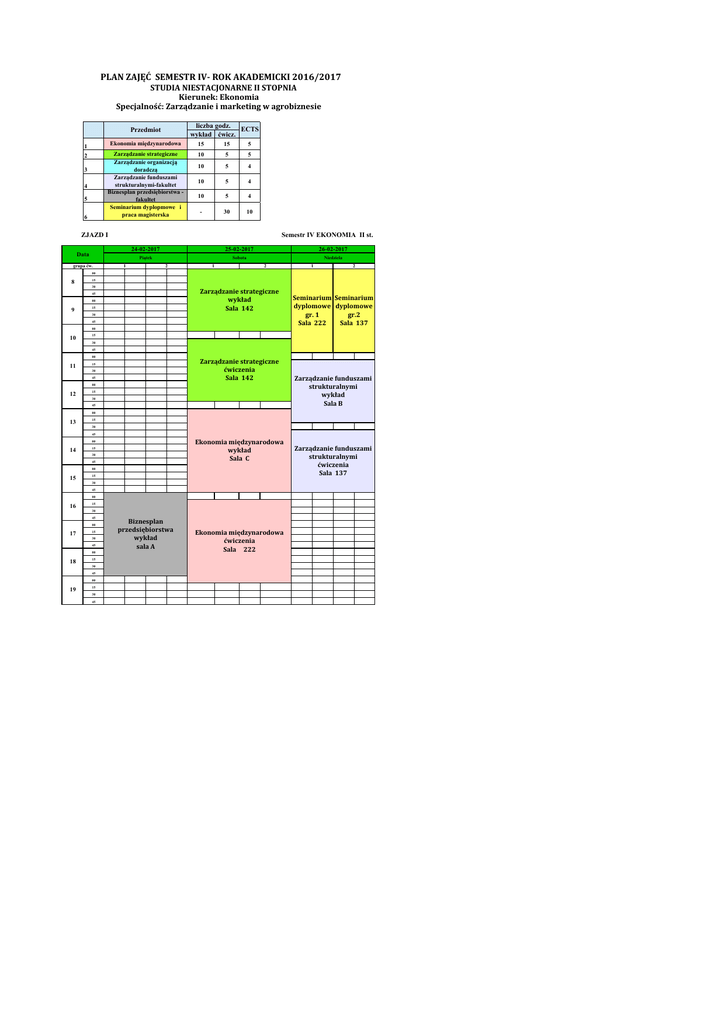 PLAN ZAJĘĆ SEMESTR IV- ROK AKADEMICKI 2016/2017