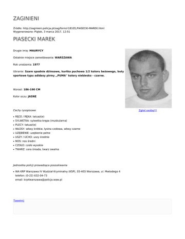 ZAGINIENI Źródło: http://zaginieni.policja.pl/zag/form/r18105,PIASECKI-MAREK.html Wygenerowano: Piątek, 3 marca 2017, 12:51 PIASECKI MAREK Drugie imię: MAURYCY Ostatnie miejsce zameldowania: WARSZAWA Rok urodzenia: 1977 Ubranie: Szare spodnie dżinsowe, kurtka puchowa 1/2 koloru beżowego, buty sportowe typu adidasy pirmy ,,PUMA'' kolory niebiesko - czarne. Wzrost: 186-190 CM Kolor oczu: JASNE Cechy rysopisowe ● RĘCE / RĘKA: tatuaż(e) ● SYLWETKA: sylwetka krępa (muskularna) ● PLECY: tatuaż(e) ● WŁOSY: włosy krótkie, łysina czołowa, włosy czarne ● UZĘBIENIE: uzębienie pełne ● USZY / UCHO: uszy średnie ● NOS: nos średni ● CZOŁO: czoło wysokie ● TWARZ: cera śniada, twarz owalna Jednostka policji prowadząca poszukiwania ● WA KRP Warszawa IV Wydział Kryminalny (KSP), 03-403 Warszawa, ul. Mwtodego 4 telefon: (0-22) 632-04-73 email: [email protected] Tweetnij Zgłoś osobę!!!