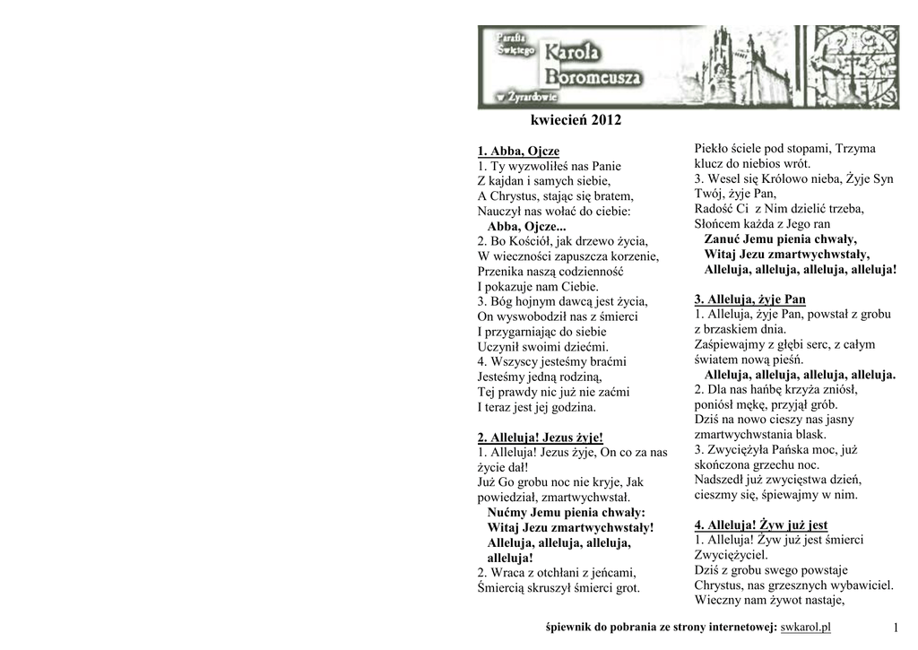 kwiecień 2012 1. Abba, Ojcze 1. Ty wyzwoliłeś nas Panie Z kajdan i samych siebie, A Chrystus, stając się bratem, Nauczył nas wołać do ciebie: Abba, Ojcze... 2. Bo Kościół, jak drzewo Ŝycia, W wieczności zapuszcza korzenie, Przenika naszą codzienność I pokazuje nam Ciebie. 3. Bóg hojnym dawcą jest Ŝycia, On wyswobodził nas z śmierci I przygarniając do siebie Uczynił swoimi dziećmi. 4. Wszyscy jesteśmy braćmi Jesteśmy jedną rodziną, Tej prawdy nic juŜ nie zaćmi I teraz jest jej godzina. 2. Alleluja! Jezus Ŝyje! 1. Alleluja! Jezus Ŝyje, On co za nas Ŝycie dał! JuŜ Go grobu noc nie kryje, Jak powiedział, zmartwychwstał. Nućmy Jemu pienia chwały: Witaj Jezu zmartwychwstały! Alleluja, alleluja, alleluja, alleluja! 2. Wraca z otchłani z jeńcami, Śmiercią skruszył śmierci grot. Piekło ściele pod stopami, Trzyma klucz do niebios wrót. 3. Wesel się Królowo nieba, śyje Syn Twój, Ŝyje Pan, Radość Ci z Nim dzielić trzeba, Słońcem kaŜda z Jego ran Zanuć Jemu pienia chwały, Witaj Jezu zmartwychwstały, Alleluja, alleluja, alleluja, alleluja! 3. Alleluja, Ŝyje Pan 1. Alleluja, Ŝyje Pan, powstał z grobu z brzaskiem dnia. Zaśpiewajmy z głębi serc, z całym światem nową pieśń. Alleluja, alleluja, alleluja, alleluja. 2. Dla nas hańbę krzyŜa zniósł, poniósł mękę, przyjął grób. Dziś na nowo cieszy nas jasny zmartwychwstania blask. 3. ZwycięŜyła Pańska moc, juŜ skończona grzechu noc. Nadszedł juŜ zwycięstwa dzień, cieszmy się, śpiewajmy w nim. 4. Alleluja! śyw juŜ jest 1. Alleluja! śyw juŜ jest śmierci ZwycięŜyciel. Dziś z grobu swego powstaje Chrystus, nas grzesznych wybawiciel. Wieczny nam Ŝywot nastaje, śpiewnik do pobrania ze strony internetowej: swkarol.pl 1 Niech więc brzmi dziś ziemia cała: Bądź Zbawcy wieczna cześć, chwała! Niech więc brzmi dziś ziemia cała: Bądź Zbawcy wieczna cześć, chwała! Alleluja, alleluja, alleluja! 2. Alleluja! Na krótko odpocząwszy sobie, Po cięŜkim, bolesnym boju, W swym cichym i spokojnym grobie, W niezmąconym spokoju, Z snu się przebudził ziemskiego, Wrócił do Ojca swojego. 3. Alleluja! Powstał w swym przechwalebnym Ciele, Wszystko wskroś przenikającym. Z Nim wstała radość i wesele, Na ziemi przemijające; Gdy chciał proch ten ziemski zrzucił I znów do Ojca powrócił. 4. Alleluja! Najgłówniejsze dzieło wykonał: Całego świata zbawienie Niedowiarstwom ich moc odebrał, A błędom dał oświecenie. Utwierdził Ewangelię, Głosić ją kazał wszem ludziom. Chwała, cześć! Chwała, cześć! Jezu dzięki Ci, Ŝeś zbawił mnie. 2. Tyś okazał dla mnie miłość swoją, Panie, której głębi ja nie mogę pojąć sam, gdyś przed Radą dla mnie znosił urąganie, gdy oplwano, potem bito Ciebie tam. 3. Dziś Golgota dla mnie źródłem mego Ŝycia, tam Twa krew obmyła z grzechu serce me. Dzięki, Panie, Ci za krzyŜ i za przeŜycia i za słowa Twoje: „Wykonało się”. 4. SłuŜyć Tobie dzisiaj pragnę całym sercem, pragnę, Panie, zostać jednym z Twoich sług. Naucz, Panie, Twego słowa, naucz więcej, abym zawsze Twoją wolę spełniać mógł. 6. Bądź błogosławiony 1. Bądź błogosławiony wiekuisty BoŜe za niezmierną miłość, którąś stworzył świat. Ref.: Wielbimy Ciebie w tym Sakramencie, hołd Ci składamy, dar naszych serc. 2. Bądź błogosławione wieczne słowo Ojca, któreś swoim przyjściem oświeciło świat. 3. Bądź błogosławiony Boski Zbawicielu, który męką zmyłeś ogrom ludzkich win. 5. Ballada ewangeliczna 1. Szukać szczęścia, szukać celu Ŝycia chciałem, gdy na drodze mej stanąłeś, Panie mój. Co się ze mną wtedy stało, nie wiedziałem, jedno wiem, Ŝeś Ty mnie zbawił, jam jest Twój. Chwała, cześć! Chwała, cześć! Alleluja, śpiewa serce me. śpiewnik do pobrania ze strony internetowej: swkarol.pl 2 80. Niedziela IV Wielkanocna, Rok B R: Kamień wzgardzony stał się fundamentem. Dziękujcie Panu, bo jest dobry, bo Jego łaska trwa na wieki. Lepiej się uciekać do Pana, niŜ pokładać ufność w człowieku. Lepiej się uciekać do Pana, niŜ pokładać ufność w ksiąŜętach. Dziękuję Tobie, Ŝeś mnie wysłuchał i stałeś się moim Zbawcą. Kamień odrzucony przez budujących stał się kamieniem węgielnym. Stało się to przez Pana i cudem jest w naszych oczach. Błogosławiony, który przybywa w imię Pańskie, błogosławimy was z Pańskiego domu. Jesteś moim Bogiem, chcę Ci podziękować: BoŜe mój, pragnę Cię wielbić. A: Alleluja, alleluja, alleluja Ja jestem dobrym Pasterzem i znam owce moje, a moje Mnie znają. śpiewnik do pobrania ze strony internetowej: swkarol.pl 31 Zawsze stawiam sobie Pana przed oczy, On jest po mojej prawicy, nic mną nie zachwieje. Kamień odrzucony przez budujących stał się kamieniem węgielnym. Oto dzień, który Pan uczynił, radujmy się w nim i weselmy. Dlatego cieszy się moje serce i dusza raduje, a ciało moje będzie spoczywać bezpiecznie, bo w kraju zmarłych duszy mej nie zostawisz. i nie dopuścisz, bym pozostał w grobie. A: Alleluja, alleluja, alleluja Ty ścieŜkę Ŝycia mi ukaŜesz, pełnię Twojej radości i wieczną rozkosz po Twojej prawicy. Alleluja, alleluja, alleluja Oto dzień, który Pan uczynił, radujmy się w nim i weselmy. 78. Niedziela II Wielkanocna, Rok B R: Dziękujcie Panu, bo jest miłosierny. Dziękujcie Panu, bo jest dobry, bo Jego łaska trwa na wieki. Niech bojący się Pana głoszą: „Jego łaska na wieki”. Uderzono mnie i pchnięto, bym upadł, lecz Pan mnie podtrzymał. Pan moją mocą i pieśnią, On stał się moim Zbawcą. 30 Uwierzyłeś, Tomaszu, bo Mnie ujrzałeś; błogosławieni, którzy nie widzieli, a uwierzyli. 79. Niedziela III Wielkanocna, Rok B R: Wznieś ponad nami światłość Twoją, Panie. Kiedy Cię wzywam, odpowiedz mi, BoŜe, który wymierzasz mi sprawiedliwość. Tyś mnie wydźwignął z utrapienia, zmiłuj się nade mną i wysłuchaj moją modlitw