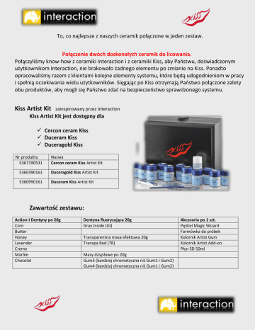 To, co najlepsze z naszych ceramik połączone w jeden zestaw. Połączenie dwóch doskonałych ceramik do licowania. Połączyliśmy know-how z ceramiki Interaction i z ceramiki Kiss, aby Państwu, doświadczonym użytkownikom Interaction, nie brakowało żadnego elementu po zmianie na Kiss. Ponadto opracowaliśmy razem z klientami kolejne elementy systemu, które będą udogodnieniem w pracy i spełnią oczekiwania wielu użytkowników. Sięgając po Kiss otrzymają Państwo połączone zalety obu produktów, aby mogli się Państwo zdać na bezpieczeństwo sprawdzonego systemu. Kiss Artist Kit zainspirowany przez Interaction Kiss Artist Kit jest dostępny dla Cercon ceram Kiss Duceram Kiss Duceragold Kiss Nr produktu 5367190531 Nazwa Cercon ceram Kiss Artist Kit 5360390161 Duceragold Kiss Artist Kit 5360990161 Duceram Kiss Artist Kit Zawartość zestawu: Action-I Dentyny po 20g Corn Butter Honey Lavender Creme Marble Chocolat Dentyna fluoryzująca 20g Gray Inside (GI) Transparentna masa efektowa 20g Transpa Red (TR) Masy dziąsłowe po 20g Gum3 (bardziej chromatyczna niż Gum1 i Gum2) Gum4 (bardziej chromatyczna niż Gum1 i Gum2) Akcesoria po 1 szt. Pędzel Magic Wizard Formówka do próbek Kolornik Artist Gum Kolornik Artist Add-on Płyn SD 50ml To, co cenimy w Interaction: Zredukowana ilość mas Perfekcyjna Estetyka Mniej mas Zestaw zawiera mniej słoiczków. Żywość efektów Efekty estetyczne dzięki elementom adaptacji światła i sterowania nim. Ekonomia Mniejsza ilość słoiczków to duże ułatwienie przy zamawianiu i przechowywaniu. Łatwo i bezpiecznie Łatwa praca dzięki wysokiej stabilności materiału. Wysoka stabilność kształtu Łatwe nazewnictwo Łatwe dopasowanie kolorów i mas Homogenne wyniki wypalania, Zablokowane niebezpieczeństwo pęknięcia Zalety połączone w Kiss Artist Kit Zredukowana ilość mas Zredukowana ilość mas bez uszczerbku na jakości Dokładna kategoryzacja mas inicjujących i intensywnych, nowy rodzaj wybarwienia opakerów i dentyn jak również uniwersalny przepis na mieszanie mas umożliwiają bardzo estetyczne licowanie: Za pomocą tylko 73 mas wykonają Państwo 100% prac. Zaleta ekonomii Zredukowany asortyment umożliwia bardziej ekonomiczne gospodarowanie i zaopatrzenie w ceramikę. DeguDent GmbH Biuro Dentsply De Trey ul. Pilchowicka 9/11, 02-175 Warszawa tel. 22 825 72 08, 500 430 013 www.degudent.com Perfekcyjna estetyka Łatwo i bezpiecznie Większe bezpieczeństwo kolorystyczne Łatwe i pewne odtwarzanie i reprodukcja koloru. Udoskonalone pigmenty barwiące dają jeszcze większe bezpieczeństwo uzyskania zadanych kolorów z kolornika V. Dzięki temu wykluczony został problem różnego postrzegania koloru przy różnych źródłach światła. Efekt opalizacji W przypadku klasycznych, wysokotopliwych ceramik efekt opalizacji może stracić swoją wyrazistość przy rosnącej ilości wypalań w piecu. Dzięki opatentowanemu procesowi produkcji mas opalescentnych w ceramice Kiss efekt opalescencji pozostaje świeży, a tym samym zapewnia naturalną dla oka grę światła. Łatwy sposób licowania dzięki przejrzystemu sposobowi warstwowania w technice podstawowej i indywidualnej. Idealnie dopasowane do siebie kolory w poszczególnych liniach ceramiki Możliwe bezproblemowe licowanie różnych rodzajów konstrukcji dla jednego pacjenta. Jednolity system warstwowania na wszystkich typach podbudowy. Jeden sposób warstwowania a więc łatwość pracy na różnych typach struktur.