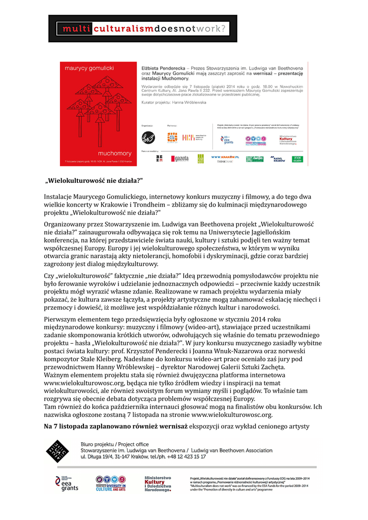 „Wielokulturowość nie działa?" Instalacje Maurycego Gomulickiego, internetowy konkurs muzyczny i filmowy, a do tego dwa wielkie koncerty w Krakowie i Trondheim – zbliżamy się do kulminacji międzynarodowego projektu „Wielokulturowość nie działa?" Organizowany przez Stowarzyszenie im. Ludwiga van Beethovena projekt „Wielokulturowość nie działa?” zainaugurowała odbywająca się rok temu na Uniwersytecie Jagiellońskim konferencja, na której przedstawiciele świata nauki, kultury i sztuki podjęli ten ważny temat współczesnej Europy. Europy i jej wielokulturowego społeczeństwa, w którym w wyniku otwarcia granic narastają akty nietolerancji, homofobii i dyskryminacji, gdzie coraz bardziej zagrożony jest dialog międzykulturowy. Czy „wielokulturowość” faktycznie „nie działa?” Ideą przewodnią pomysłodawców projektu nie było ferowanie wyroków i udzielanie jednoznacznych odpowiedzi – przeciwnie każdy uczestnik projektu mógł wyrazić własne zdanie. Realizowane w ramach projektu wydarzenia miały pokazać, że kultura zawsze łączyła, a projekty artystyczne mogą zahamować eskalację niechęci i przemocy i dowieść, iż możliwe jest współdziałanie różnych kultur i narodowości. Pierwszym elementem tego przedsięwzięcia były ogłoszone w styczniu 2014 roku międzynarodowe konkursy: muzyczny i filmowy (wideo-art), stawiające przed uczestnikami zadanie skomponowania krótkich utworów, odwołujących się właśnie do tematu przewodniego projektu – hasła „Wielokulturowość nie działa?". W jury konkursu muzycznego zasiadły wybitne postaci świata kultury: prof. Krzysztof Penderecki i Joanna Wnuk-Nazarowa oraz norweski kompozytor Stale Kleiberg. Nadesłane do konkursu wideo-art prace oceniało zaś jury pod przewodnictwem Hanny Wróblewskej – dyrektor Narodowej Galerii Sztuki Zachęta. Ważnym elementem projektu stała się również dwujęzyczna platforma internetowa www.wielokulturowosc.org, będąca nie tylko źródłem wiedzy i inspiracji na temat wielokulturowości, ale również swoistym forum wymiany myśli i poglądów. To właśnie tam rozgrywa się obecnie debata dotycząca problemów współczesnej Europy. Tam również do końca października internauci głosować mogą na finalistów obu konkursów. Ich nazwiska ogłoszone zostaną 7 listopada na stronie www.wielokulturowosc.org. Na 7 listopada zaplanowano również wernisaż ekspozycji oraz wykład cenionego artysty plastyka Maurycego Gomulickiego, którego prace odwołujące się do idei całego projektu staną w przestrzeniach Krakowa. Otwarty dla publiczności wernisaż instalacji "Muchomory" oraz wykład Gomulickiego odbędzie się w Nowohuckim Centrum Kultury (al. Jana Pawła II 232) o godz. 18:00. Dzieła uczestników konkursów muzycznego i filmowego zaprezentowane zaś zostaną podczas uroczystych koncertów finałowych, które odbędą się pod koniec stycznia 2015 r. w Krakowie i norweskim Trondheim. W Krakowie (23 stycznia) wystąpi znakomita Trondheim Symphony Orchestra pod dyrekcją Jacka Kaspszyka, natomiast w Trondheim (29 stycznia) ten sam dyrygent poprowadzi Orkiestrę Akademii Beethovenowskiej. Więcej informacji o projekcie „Wielokulturowość nie działa?" na stronie: www.wielokulturowosc.org